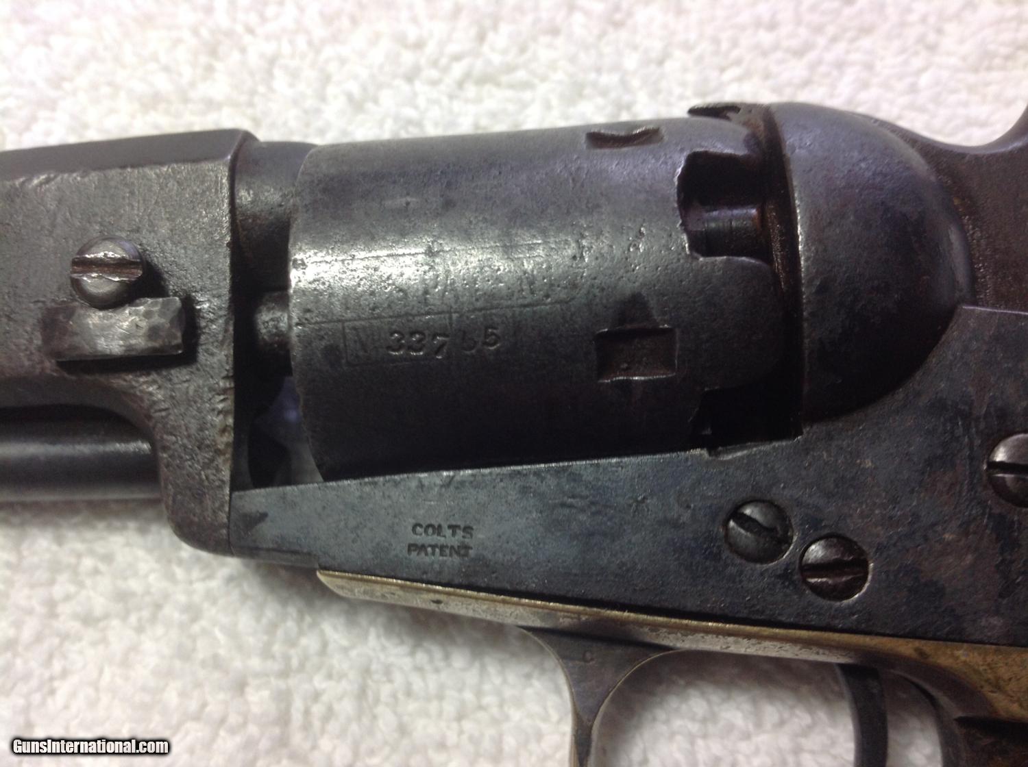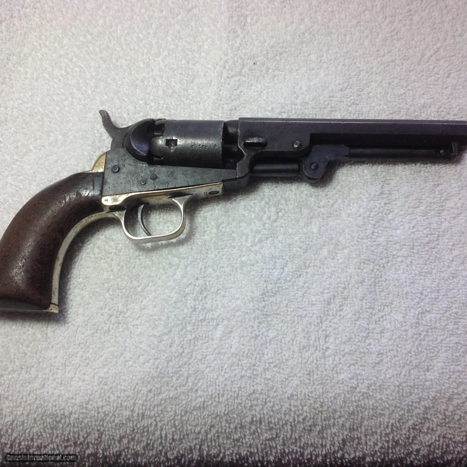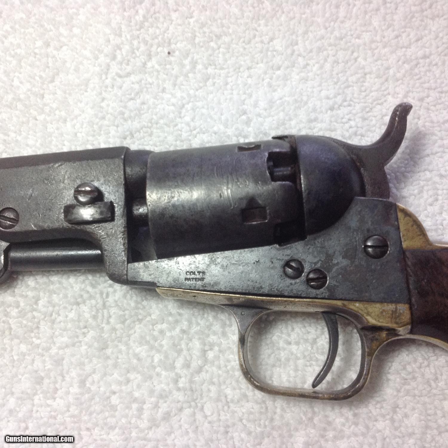 Description: New Years Special!!! Early production produced in 1852 Model 1849 Colt Pocket Revolver with matching serial numbers. Dark gray patina on metal. Brass is uncleaned/untouched. The action works and some scattered silver wash on the trigger guard. 5" inch barrel has nice visible address with Colts Patent on the frame. The original walnut grips are wonderful. Came out of Uvalde Texas area. SOLD Curio/Relic: Yes Antique: Yes |