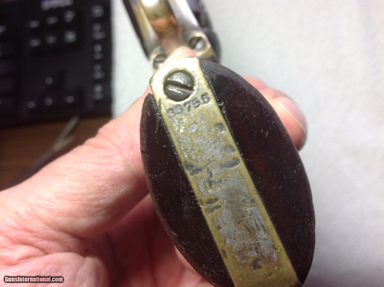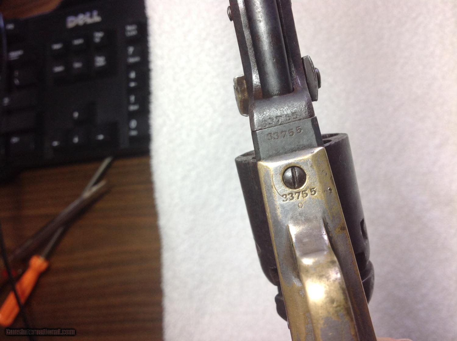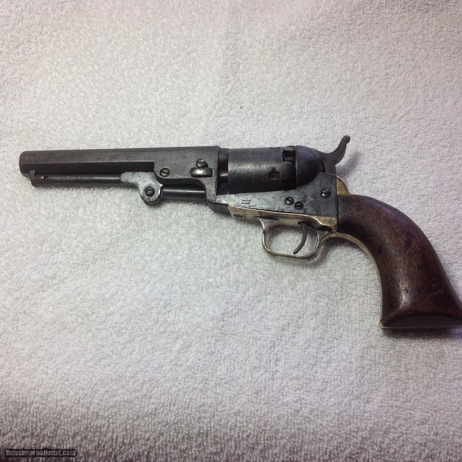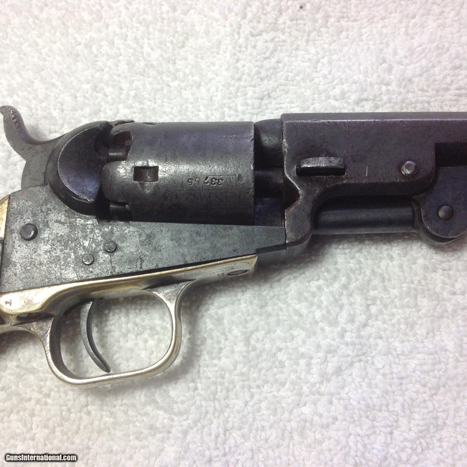 Description: New Years Special!!! Early production produced in 1852 Model 1849 Colt Pocket Revolver with matching serial numbers. Dark gray patina on metal. Brass is uncleaned/untouched. The action works and some scattered silver wash on the trigger guard. 5" inch barrel has nice visible address with Colts Patent on the frame. The original walnut grips are wonderful. Came out of Uvalde Texas area. SOLD Curio/Relic: Yes Antique: Yes |
