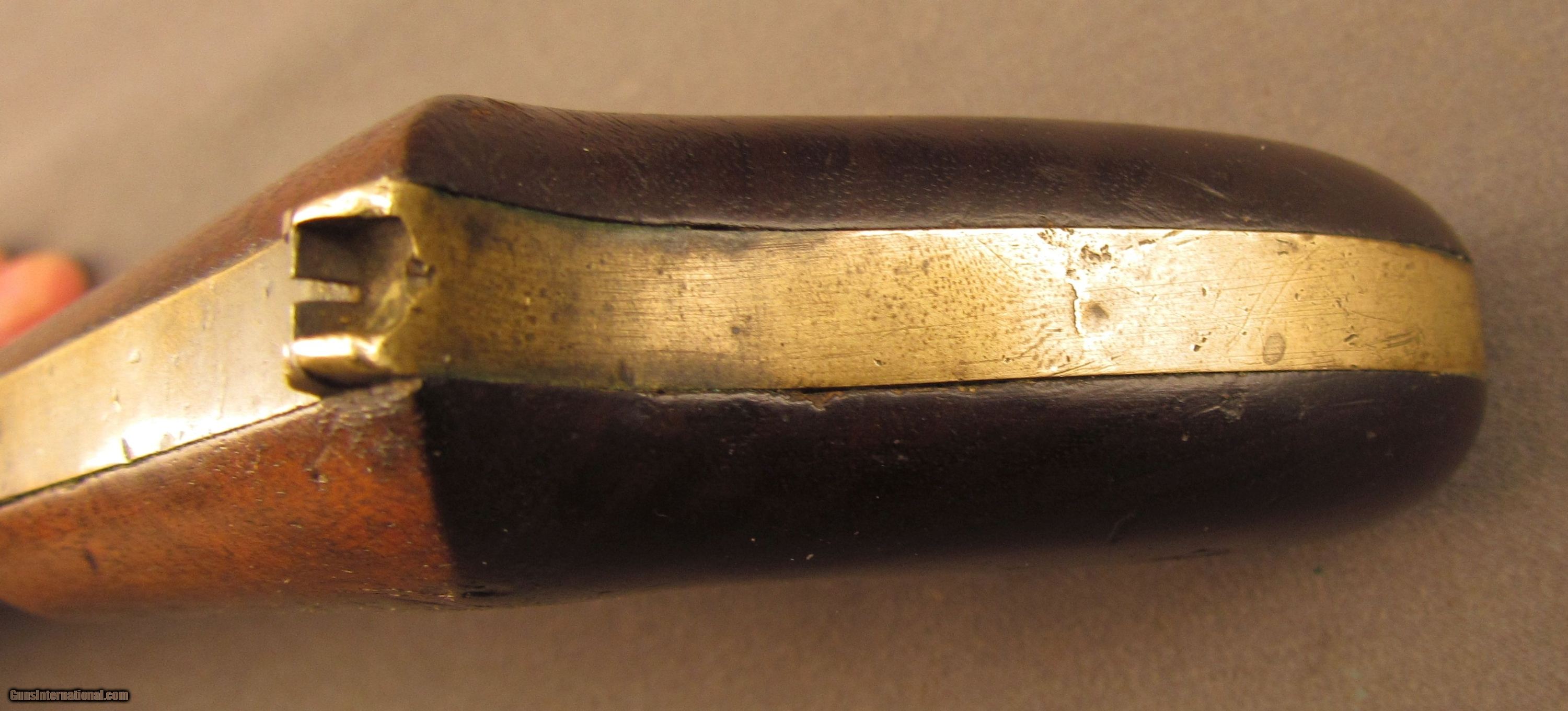 Description: NSN, .30 Caliber, 6 1/8” part octagon barrel with a fair, lightly pitted bore. This pistol is marked “ASHTONS” on one of the barrel flats, and was made by Peter and William Ashton of Middletown, CT. The metal has an overall dark brown patina with some heavier pitting around the nipple. The brass frame is likewise tarnished to a dull yellow-ochre patina, and the walnut grips are in fine shape with only minor handling marks scattered about on either side. The mechanism is functional, however the sear notch is worn and doesn't retain the hammer for very long. These are interesting pistols, and this example is in about very good condition. Antique SOLD Manufacturer: Ashton Model: Boot Pistol Caliber Info: .30 cal Gauge Info: .30 cal |