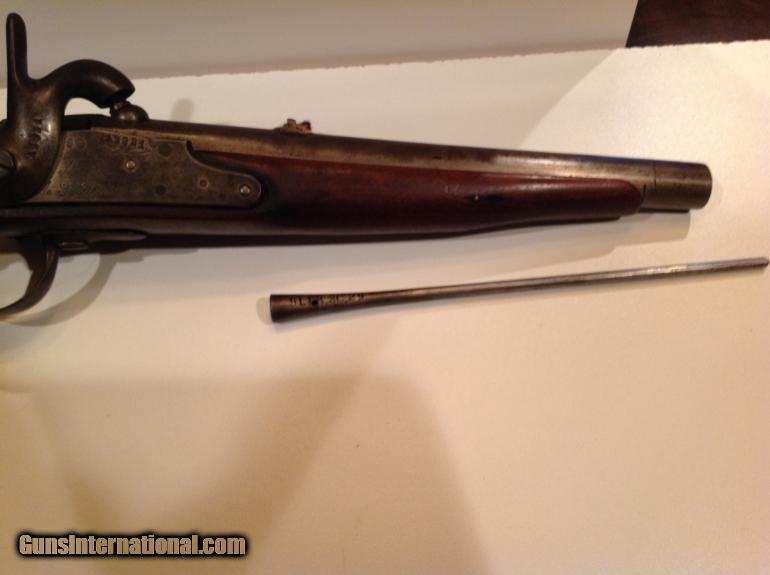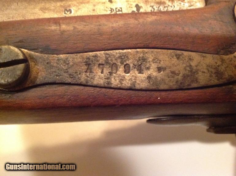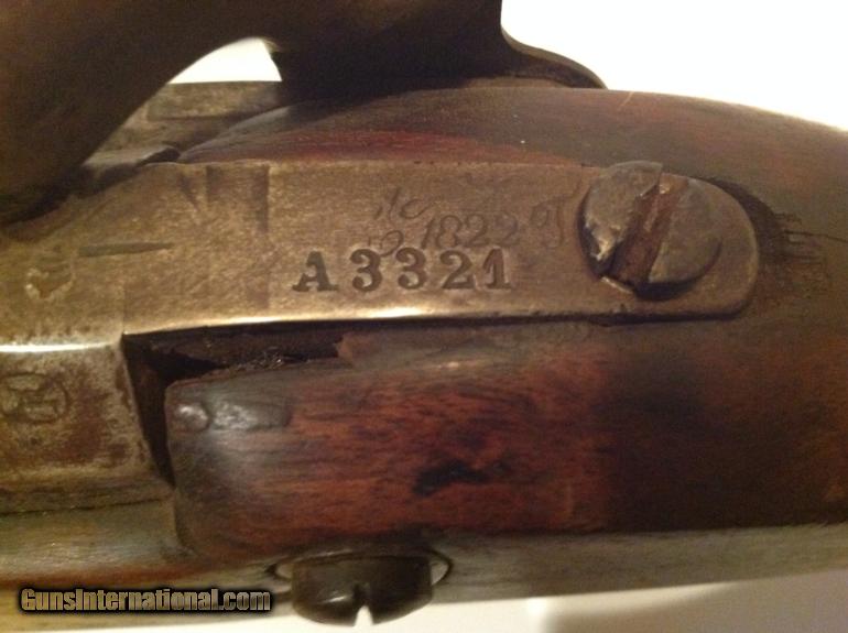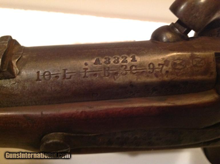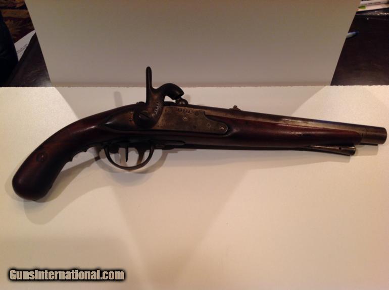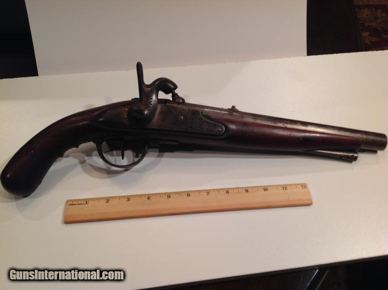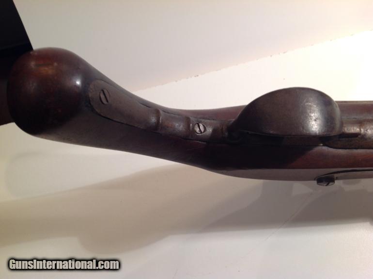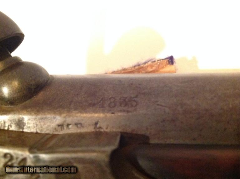 This is a very large very unusual percussion pistol in very good condition. It is very heavy and approximately 19.5 inches long with a 12" barrel and estimated .69 caliber. It has matching numbers on hammer, sideplate and barrel. It is dated 1835 on barrel and the bore is very good and has rifling. The pistol functions very well but I would not recommend shooting without first being looked at by a gunsmith. Behind the hammer is a grip for your two fingers. The stock has a great patina nad appears to have two circular repairs. It has a metal tamping rod that is also numbered and is in good condition. This could have been converted from flintlock and could have been converted or cut down from musket at factory. Please let me know if you have any questions.
