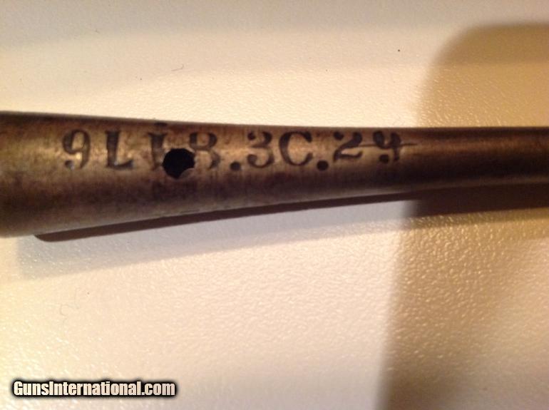 Description: This is a very large very unusual percussion pistol in very good condition. It is very heavy and approximately 19.5 inches long with a 12" barrel and estimated .69 caliber. It has matching numbers on hammer, sideplate and barrel. It is dated 1835 on barrel and the bore is very good and has rifling. The pistol functions very well but I would not recommend shooting without first being looked at by a gunsmith. Behind the hammer is a grip for your two fingers. The stock has a great patina nad appears to have two circular repairs. It has a metal tamping rod that is also numbered and is in good condition. This could have been converted from flintlock and could have been converted or cut down from musket at factory. Please let me know if you have any questions. SOLD Curio/Relic: Yes Antique: Yes Manufacture Date: 1835 |