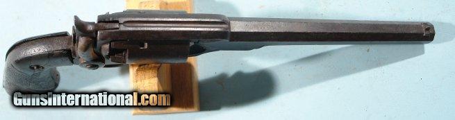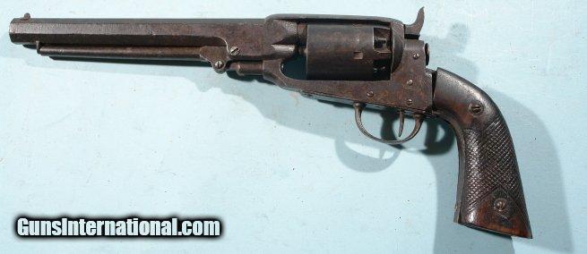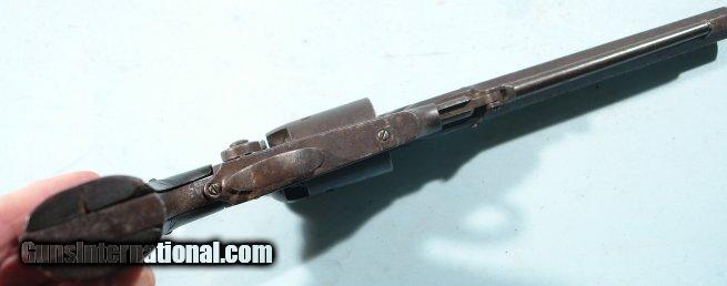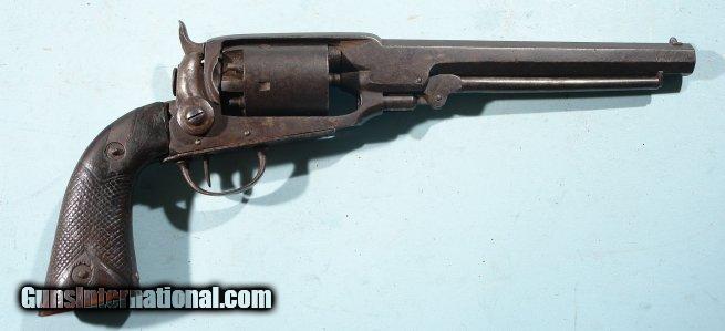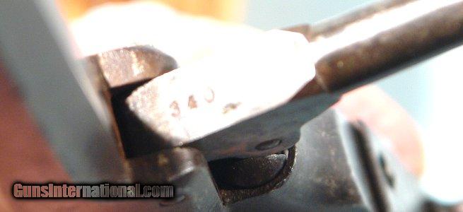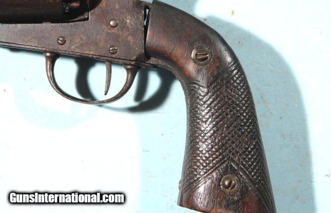 Description: VERY RARE CIVIL WAR B.F. JOSLYN U.S.N. PERCUSSION .44 CAL. REVOLVER. SERIAL #340. 5 shot single action revolver with 8” octagon barrel. Only 100 made under contract to the United States Navy at the beginning of the Civil War and delivered Oct. 1, 1861. THESE WERE NUMBERED IN THE 300-400 SERIAL RANGE AND THIS ONE IS NUMBER 340. All original and matching and in good to very good condition. Stamped “U S N” on the butt strap and barrel with the “B.F. JOSLYN/PATD. MAY, 4, 1858” barrel address. Serial numbered “340”on the lever and the underside of the trigger guard. 100% original in every respect with all the markings and numbers absolutely original. Fine old dark original patina with traces of blue. Grips straps slightly bent and grips offset as a result and no longer fit properly. Grips with wear and right flat with hairline crack. Certainly restorable by a good gunsmith. Working order. Believed found many years ago in the Washington, D.C. Navy Yard. SOLD Antique: Yes |