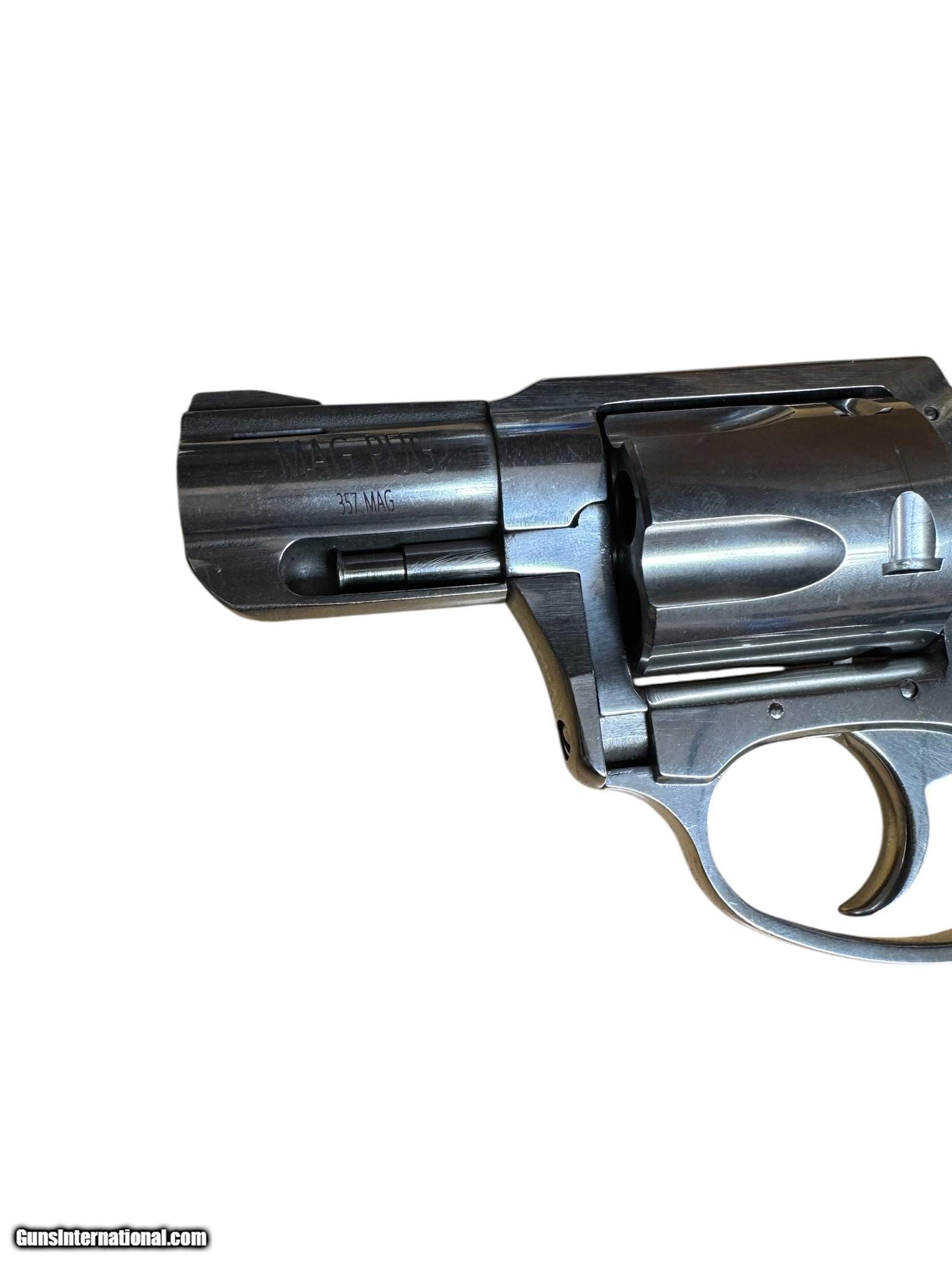 Description: Guns Listing ID: 580455 Compact and powerful, the Charter Arms Mag Pug is chambered in hard hitting .357 Magnum and features a 2.2\" ported barrel and fixed sights. It has a traditional spurred hammer. Finished in black and silver, is in very good condition, no case or accessories included with purchase. Single action revolver. Manufacturer: CHARTER ARMS Model: MAG PUG Caliber Info: .357 MAG Condition: Used - Non-Certified Barrels: 2" BARREL Action: REVOLVER Finish: black & silver Price: $370.99 Contact Seller |