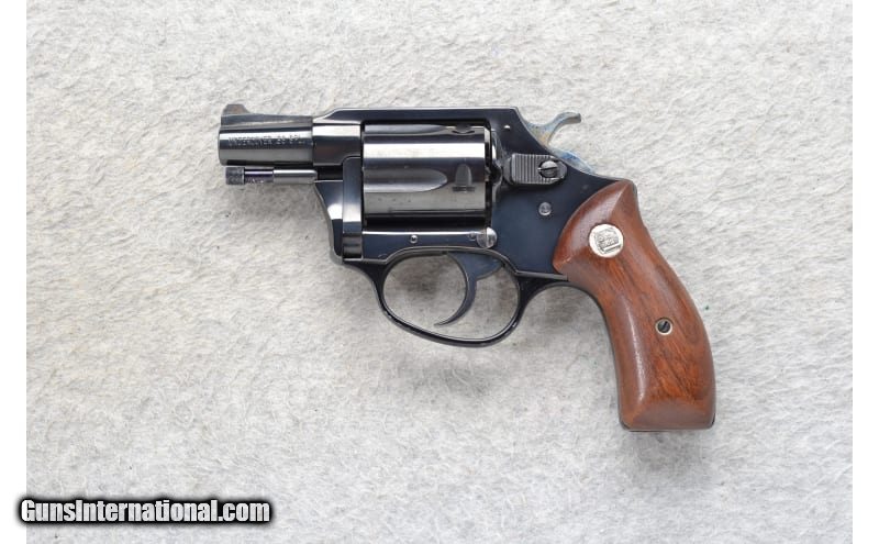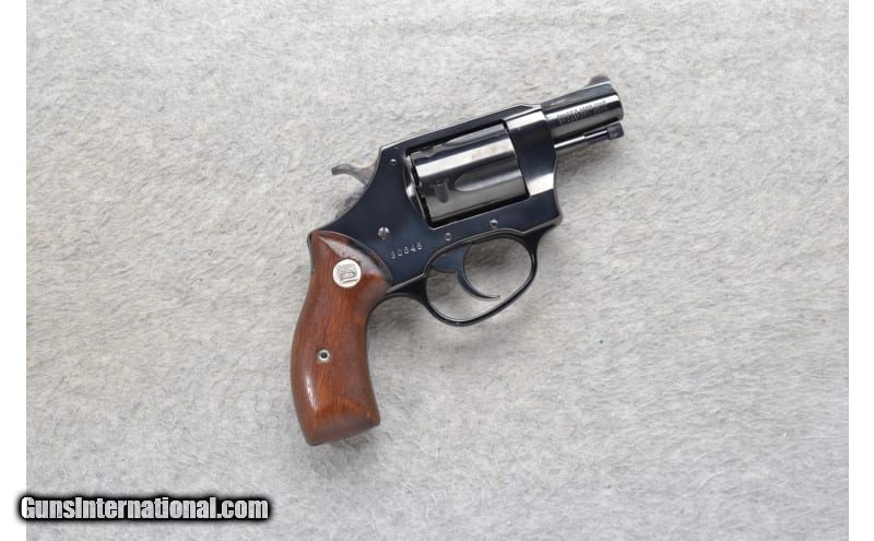 Description: This Charter Arms Model Undercover is a 5 shot double action revolver in .38 Special Cal. It has a 1.75 inch barrel. A blade front and integral notch rear sight. The smooth walnut grips have silver Charter Arms medallions. .38 Special SOLD Chambers: 5 round fluted cylinder. Metal Condition: Very good. Wood Condition: Smooth walnut grip with silver Charter Arms medallions. Bore Condition: Very good. Barrels: 1.75 inch. Triggers: Single Action / Double Action. Weight: 16 oz. Sights: Blade front. Integral notch rear. Item Location: Harrisburg, PA |