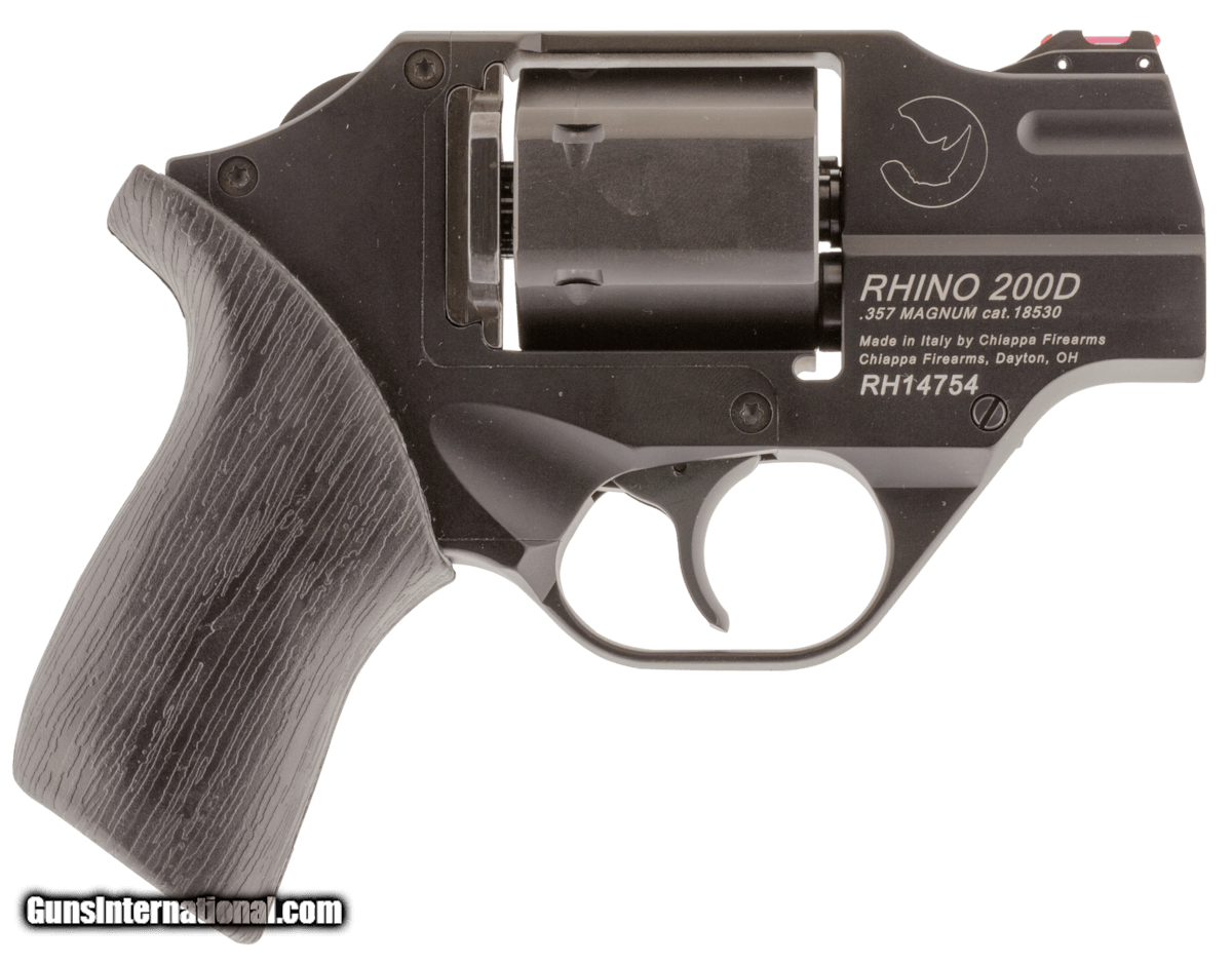 Description: Guns Listing ID: 683380 The Rhino is the most innovative development in revolver technology in decades. It fires from the bottom of the cylinder rather than the top which dramatically reduces muzzle rise and recoil felt by lowering the axis of the bore almost to the palm of the shooters hand. An aluminum alloy frame and barrel shroud makes the Rhino lightweight and easy to carry. The snag resistant \"hammer\" is actually a cocking device because of the Rhino‚‚s innovative completely enclosed firing mechanism which can be fired either single or double action. A cocked indicator is clearly visible to indicate the internal hammer status. Another innovation is the hexagonal cylinder which keeps the revolver‚‚s width to a minimum. Included is a leather holster, 3 moon clips, and a removal too SOLD Manufacturer: CHIAPPA Model: RHINO 200D Caliber Info: .357 MAGNUM Condition: new Barrels: 2" barrel Finish: BLACK ANODIZED |