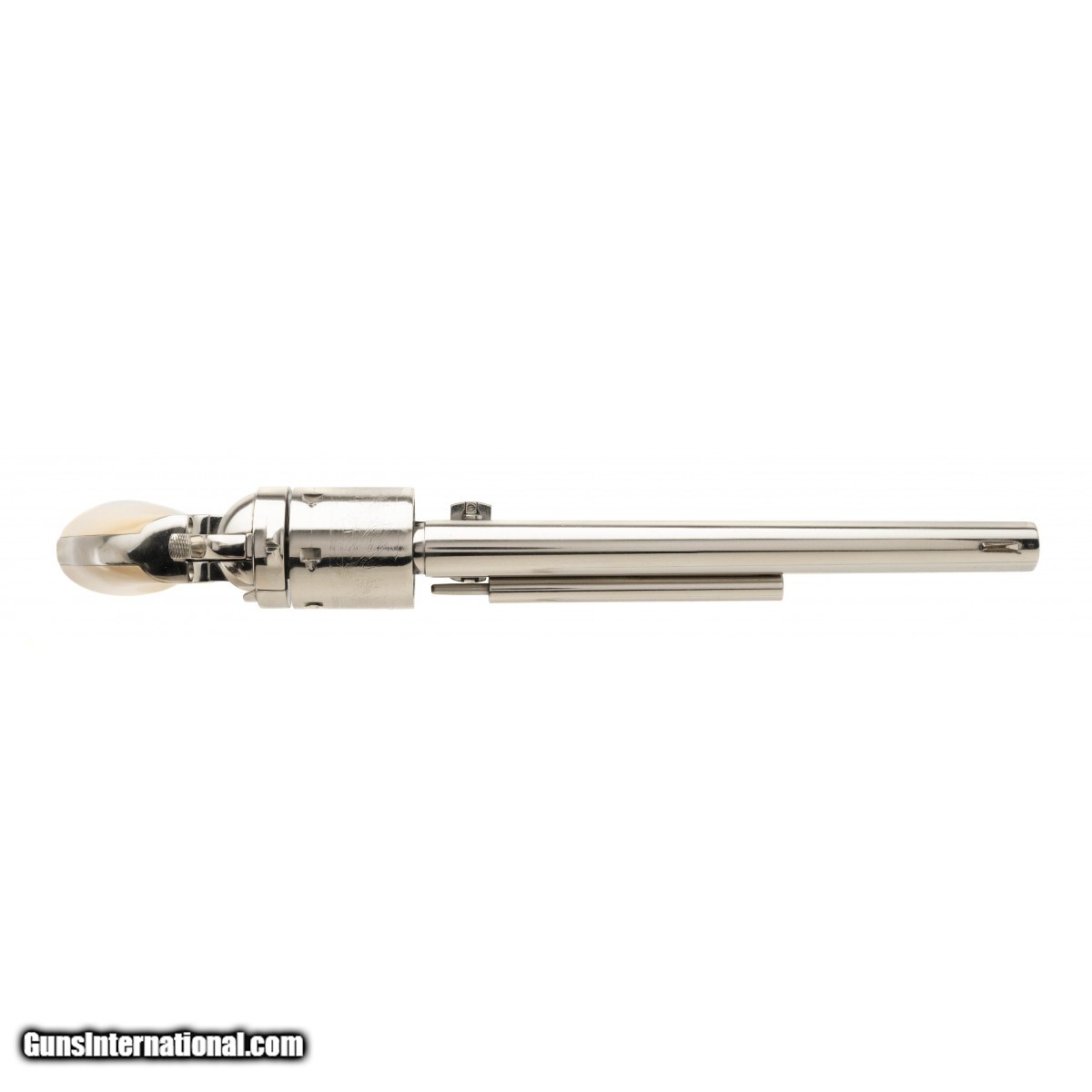 SN: 1072. Modern production .38 Special with an 8" barrel. Replica conversion revolver with nickel finish and faux ivory grips. Excellent condition.