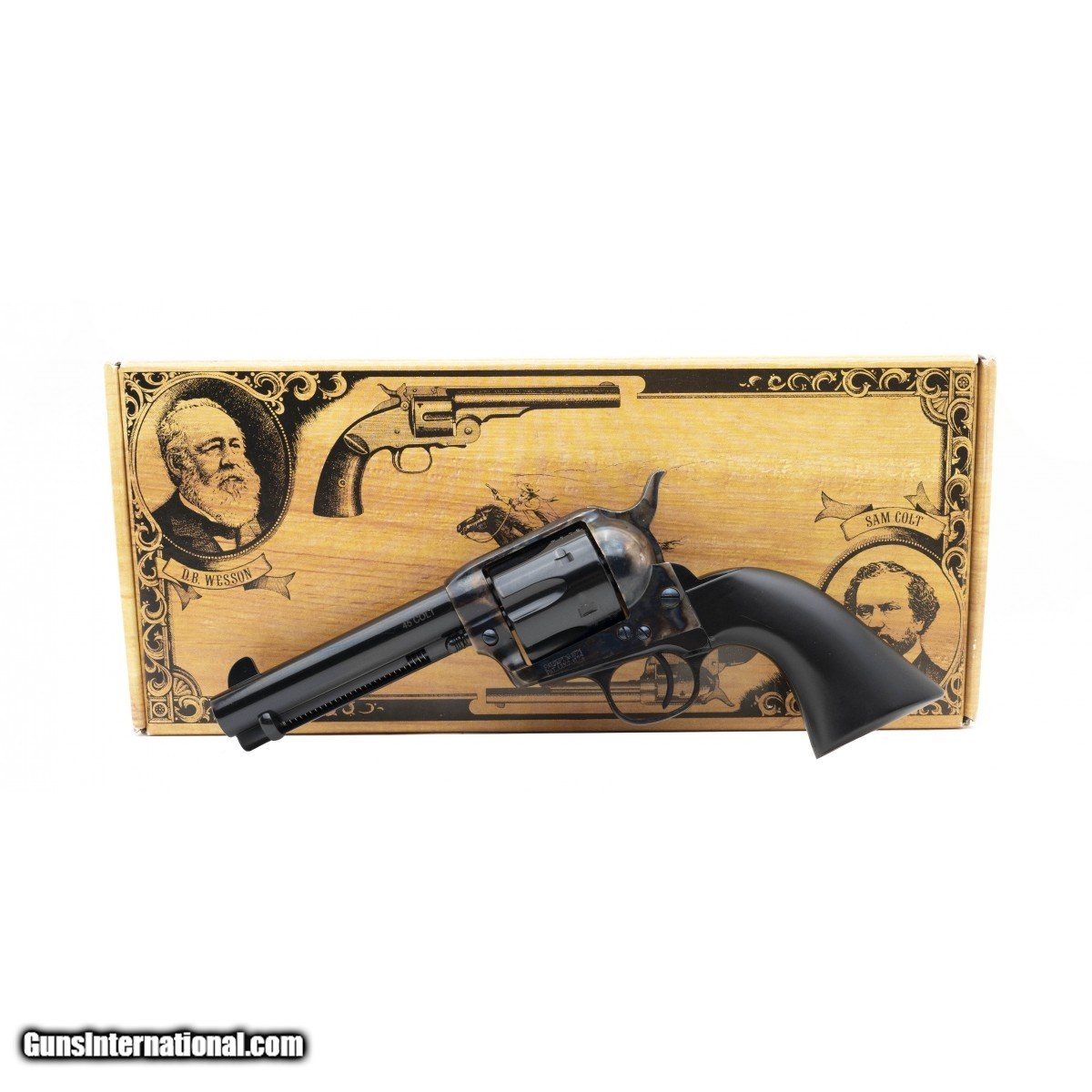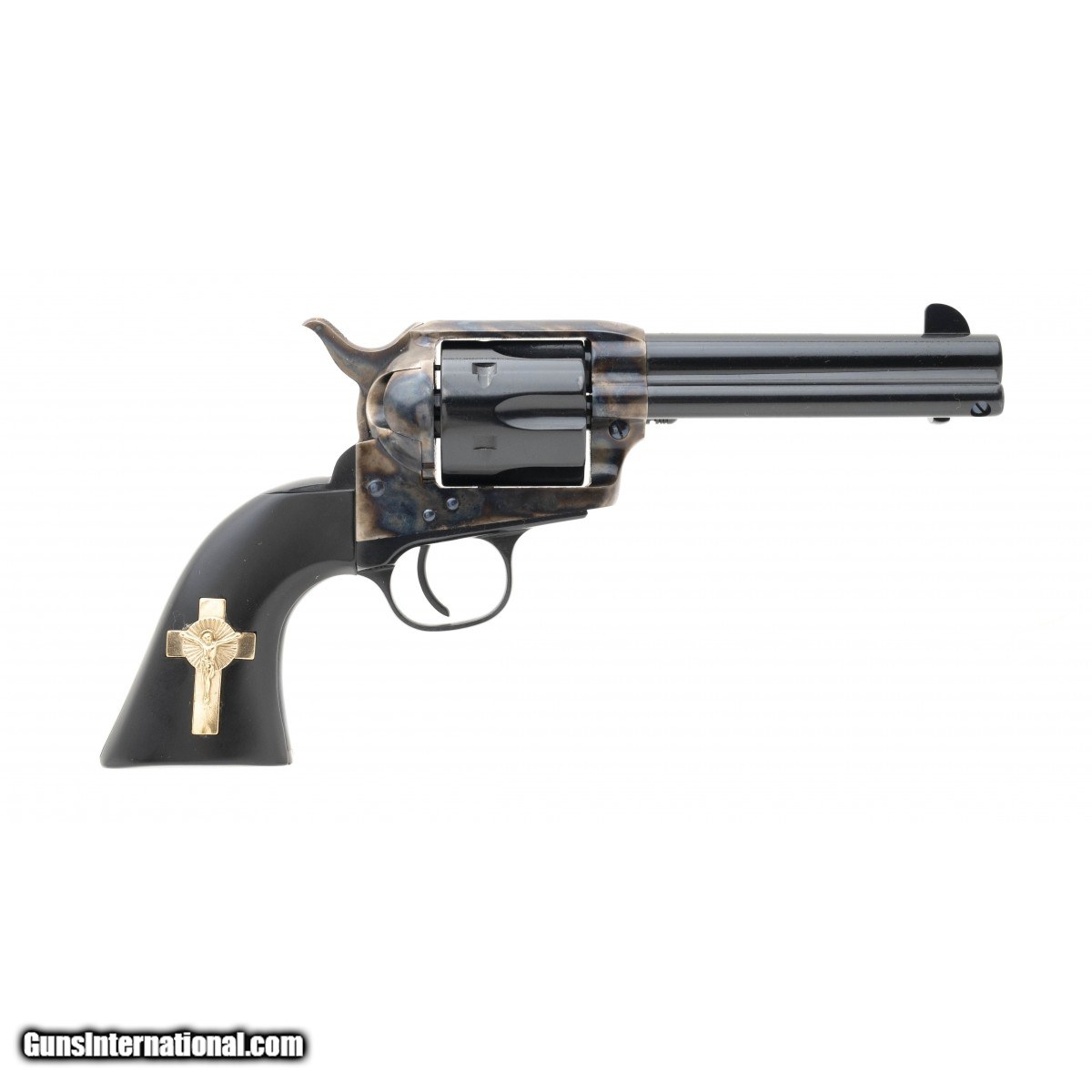 ""Holy Smoker"" limited edition single action revolver with color case hardened reciever, blued 4.75"" barrel, and matte black grips featuring a gold cross. NEW. UPC:844234128662