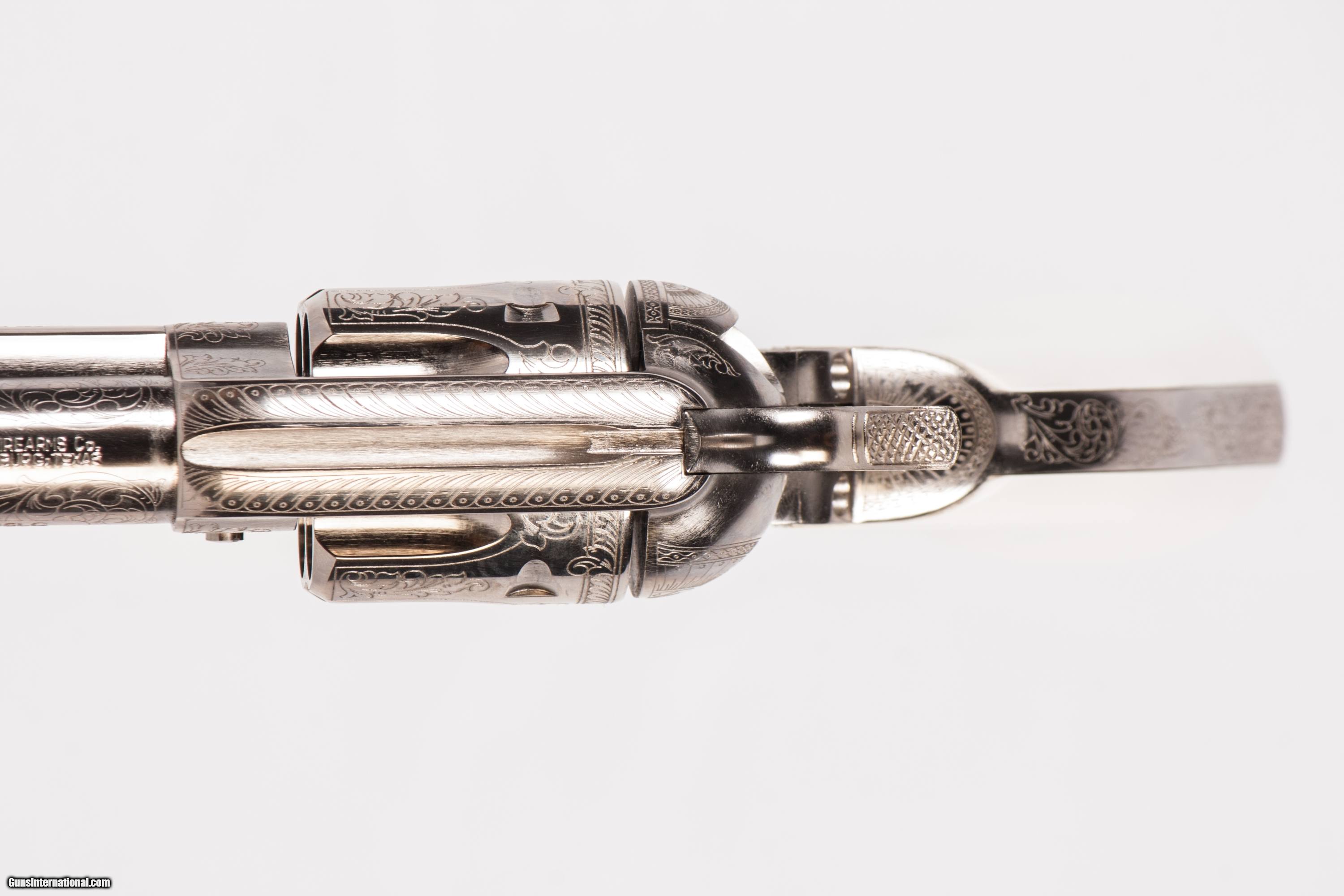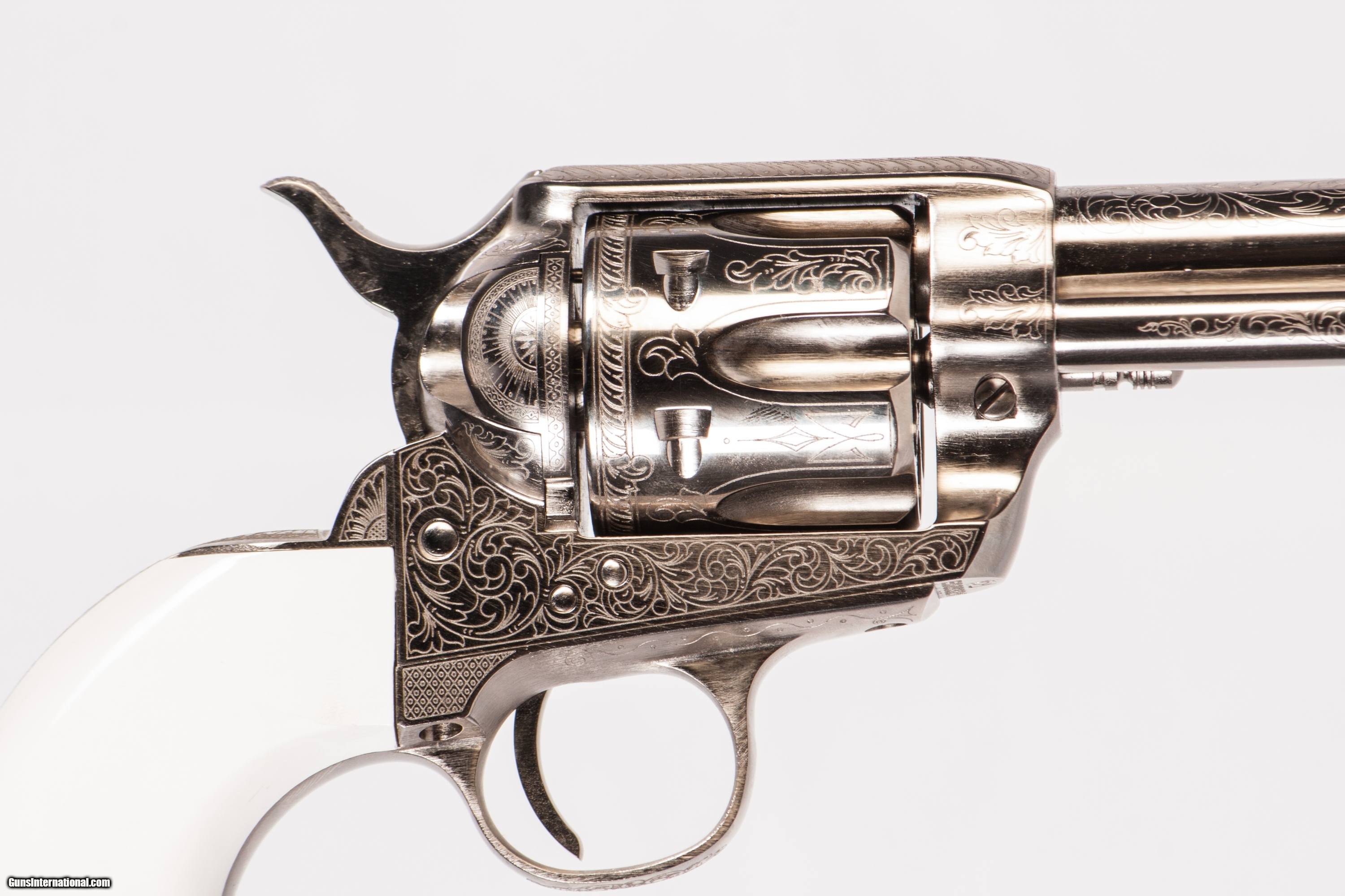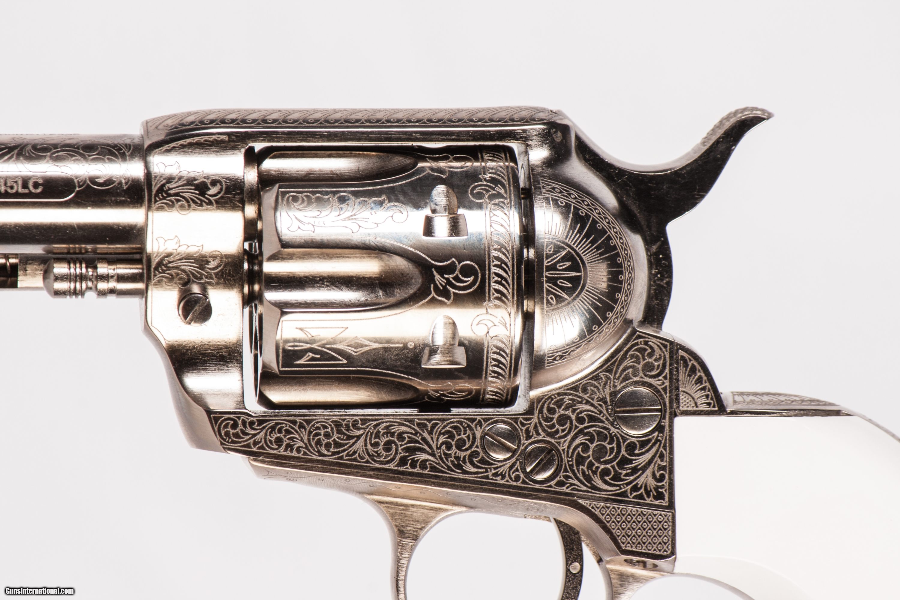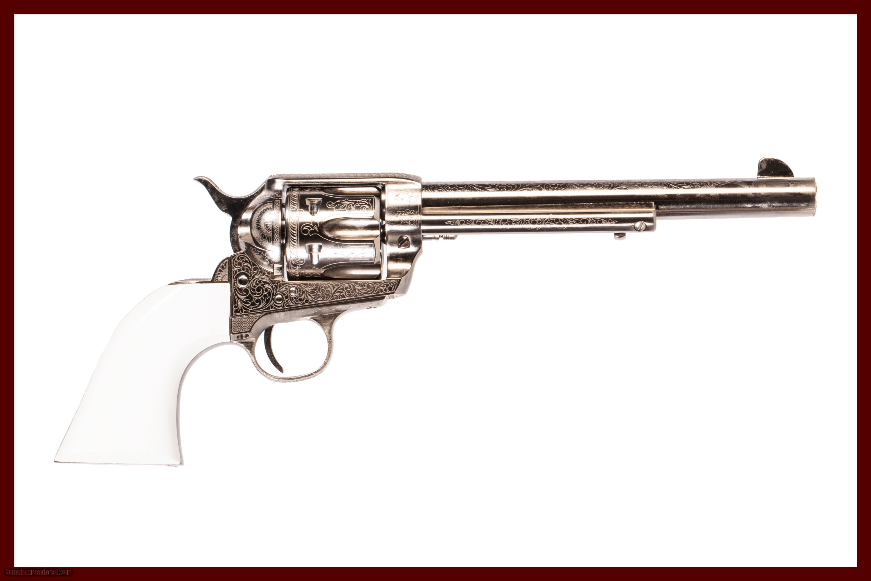 An engraved Cimarron Frontier chambered in 45 Long Colt with a 7 1/2 inch barrel with a bright and shiny bore with a minor lead deposits with the orignal box. This firearm is in excellent condition and is covered by Dury's Lifetime Warranty.