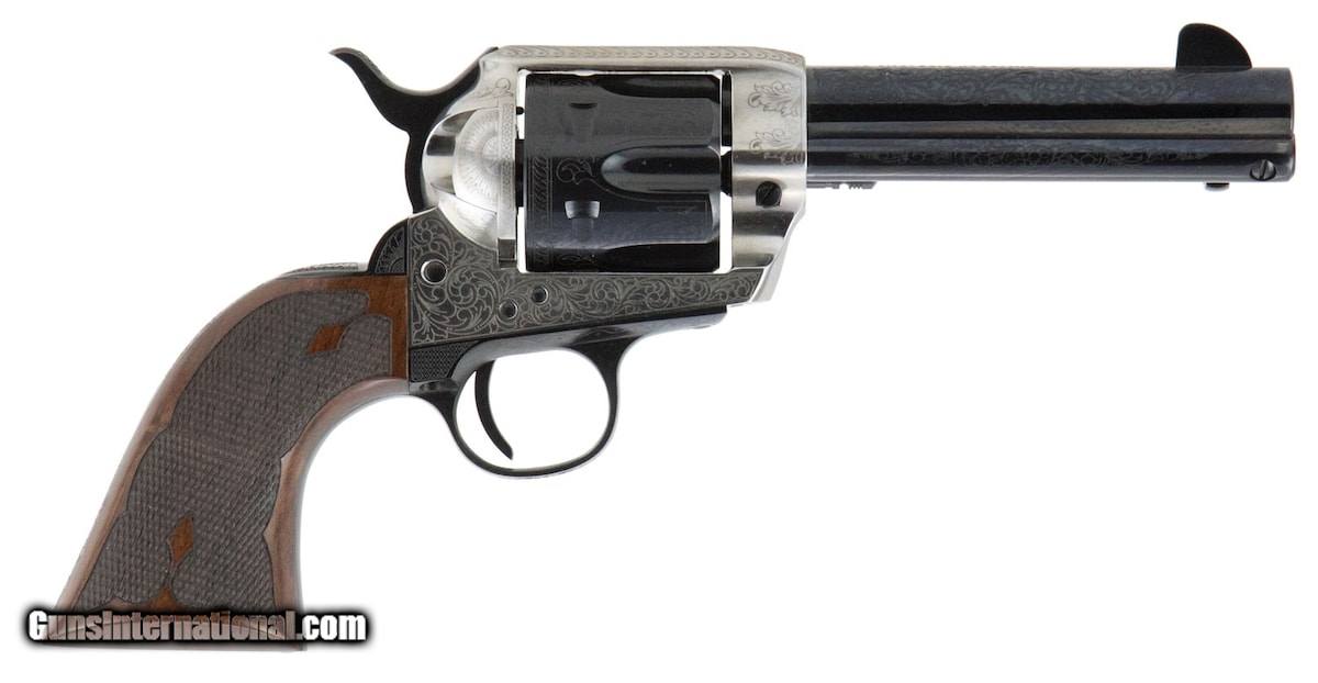 Description: Guns Listing ID: 281368 Cimarrons Frontier an affordable and obtainable deep laser engraved revolver. Great looking comes in old silver frame OSF a twotone finish where the barrel cylinder and grip assembly is blued and the frame is in the white a polished steel finish and a checkered walnut grip. SOLD Manufacturer: CIMARRON Model: FRONTIER Caliber Info: .45 LC Condition: new Barrels: 4.8 BARREL Finish: BLUED |