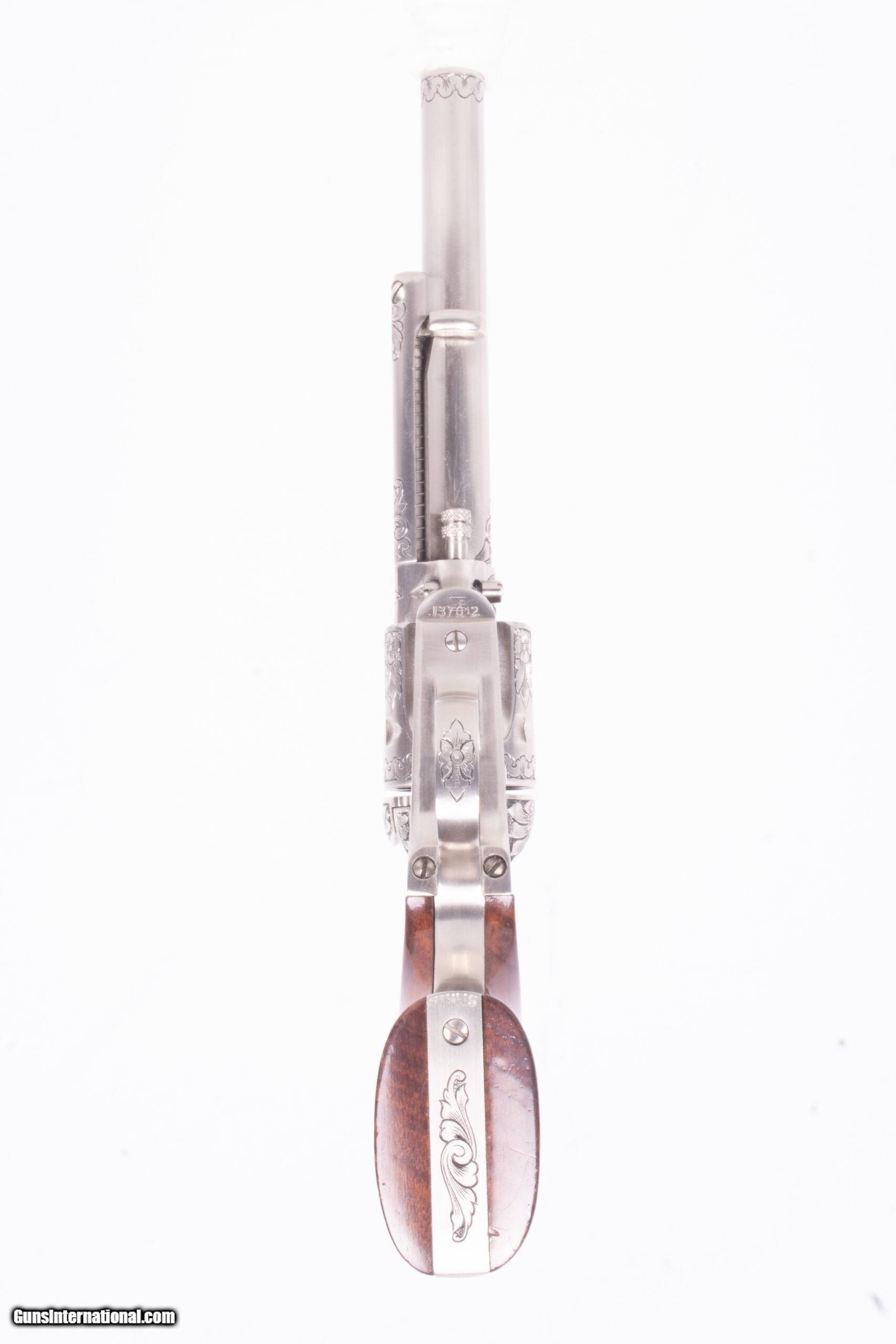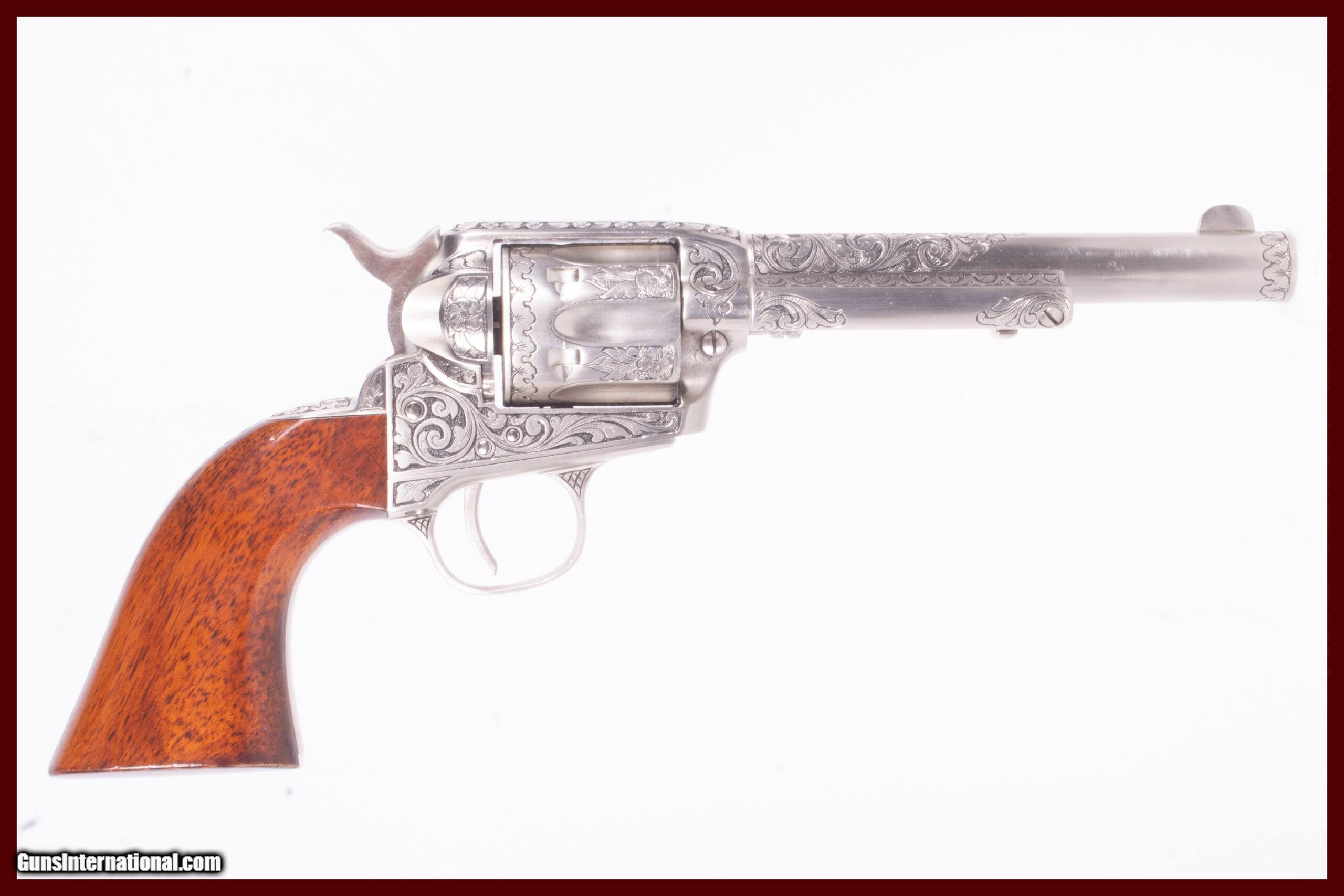 Description: Cimarron Model P single-action revolver chambered for .38 Colt with 5.5-inch barrel, stainless finish, gutter sight, six-shot fluted cylinder, and glossed walnut grips - Odessa Star special with engraving to mid barrel and back tang edition engraving. Action appears to be in fine working order with mirror bright, sharply rifled bore. The NRA grading condition for this USED firearm is Very Good. We ship domestically in the United States. Additional shipping rates apply to Alaska and Hawaii. Dury’s Lifetime Warranty: All firearms purchased from Dury’s Gun Shop, NEW or USED, are covered by a lifetime warranty. We will repair or replace, at our discretion, any firearm purchased from Dury’s Gun Shop, Inc. for as long as it is owned by the purchaser. This warranty is not transferable. WE BUY GUNS! NO COLLECTION TOO BIG OR SMALL FOR OUR GUNS INTERNATIONAL CUSTOMERS ALL OF OUR FIREARMS CAN BE PURCHASED DIRECTLY FROM OUR DURY’S GUNS SITE ! SOLD Manufacturer: Cimarron Model: P Caliber Info: 38 COLT Barrels: 5inches |