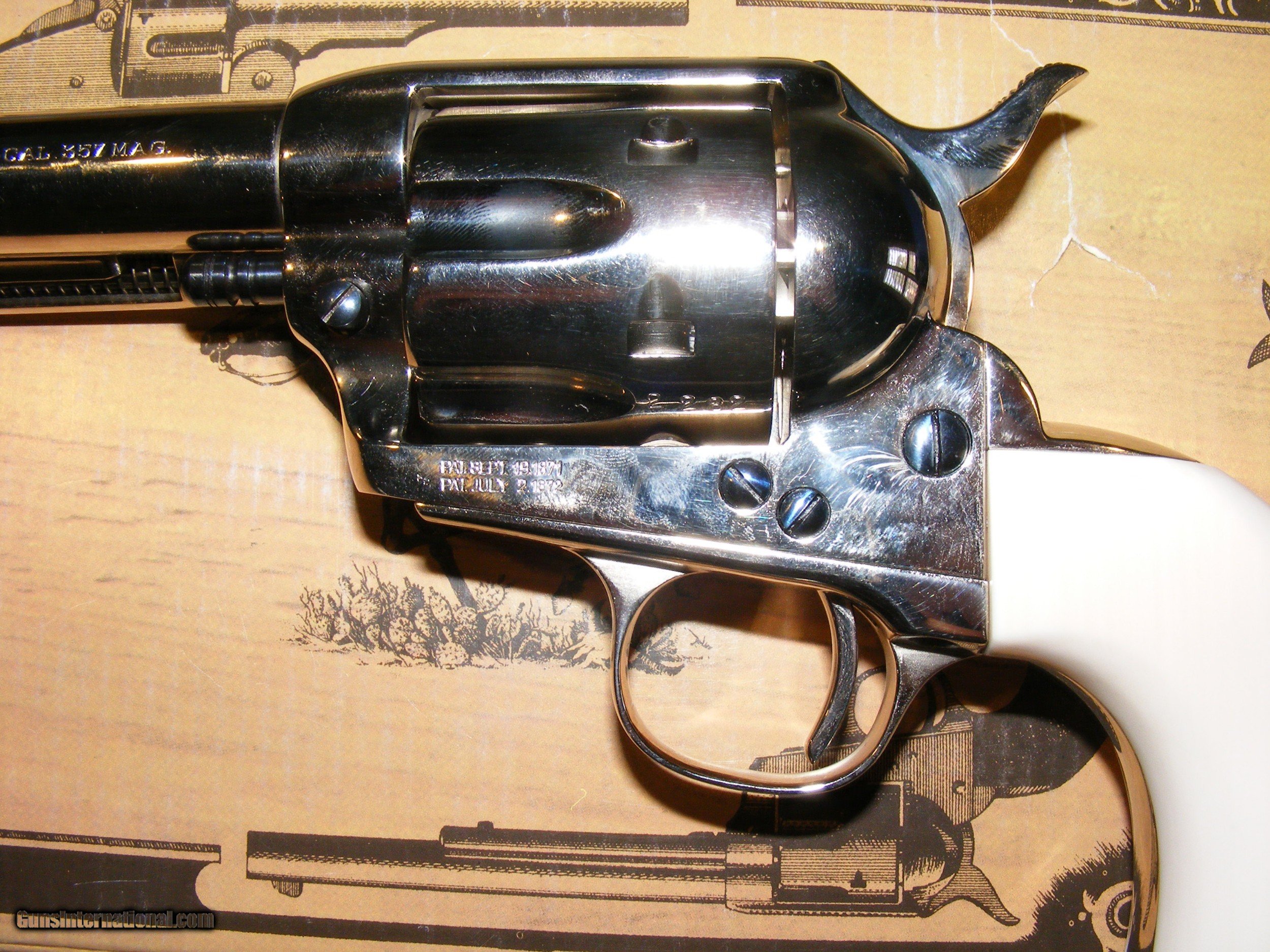 Description: Cimmaron Model P, Pre-War model, bright nickel plated with fire-blued screws, poly ivory grips, 7.5" barrel, caliber .357 Magnum, new in factory box. FFL required. Payment via Bank Cashier's Check or USPS Money Order only. Shipping $20 SOLD |
