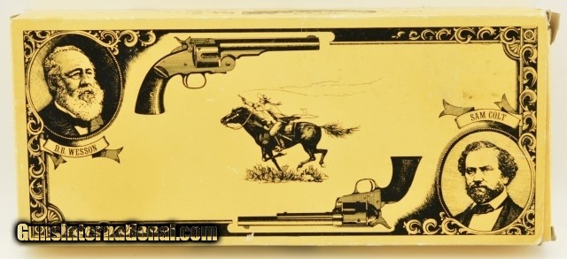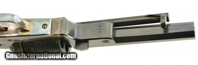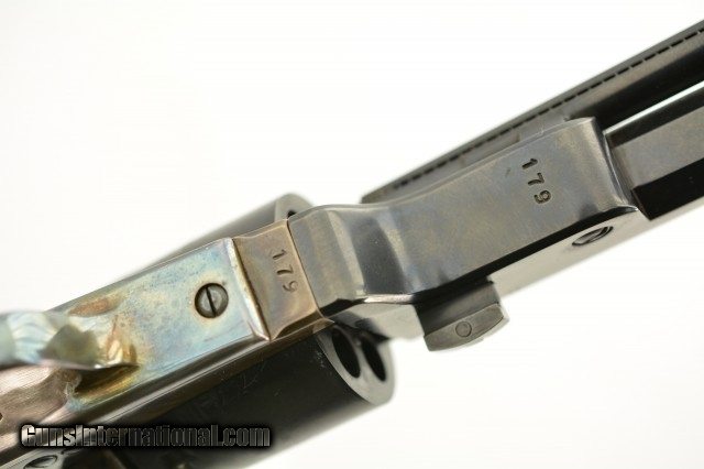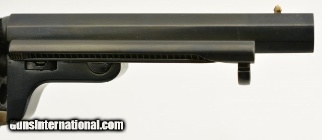 Description: Serial #179, .38 Special, 5 inch octagon barrel with an excellent bore. This is the 1851 Richards Conversion revolver manufactured for Cimarron Fire Arms Company in Italy. The revolver features an ejector rod housing, fixed rear sight on the conversion ring and small brass bead front sight. In excellent plus overall condition the revolver retains about 98-99% original blue finish on the barrel and cylinder with scattered handling and use marks. The frame retains most of the original smoky case color with the grip frame showing a lightly tarnished silver plate and the hard wood grips rate excellent as well. The gun functions mechanically and it times and locks up correctly. Included is the factory box that is correctly end labeled and numbered to the gun. FFL SOLD |