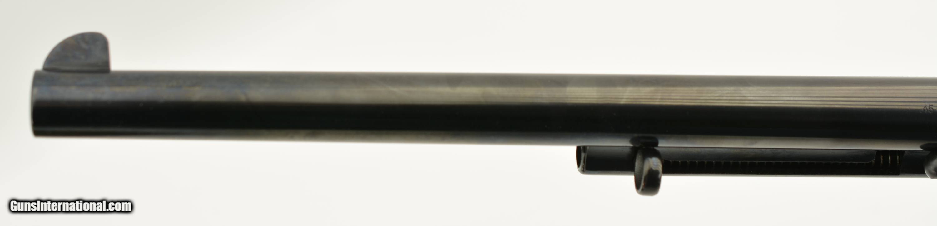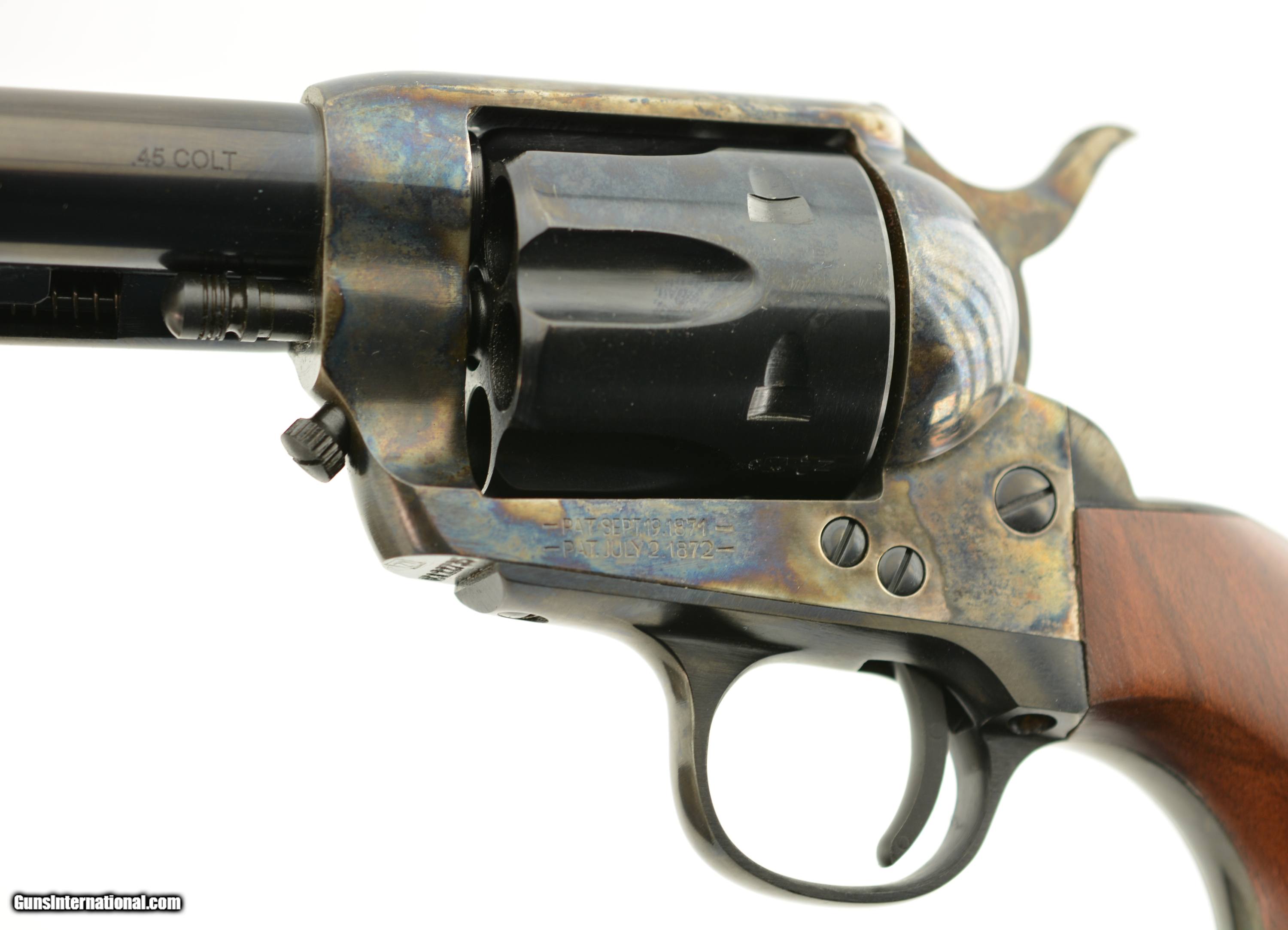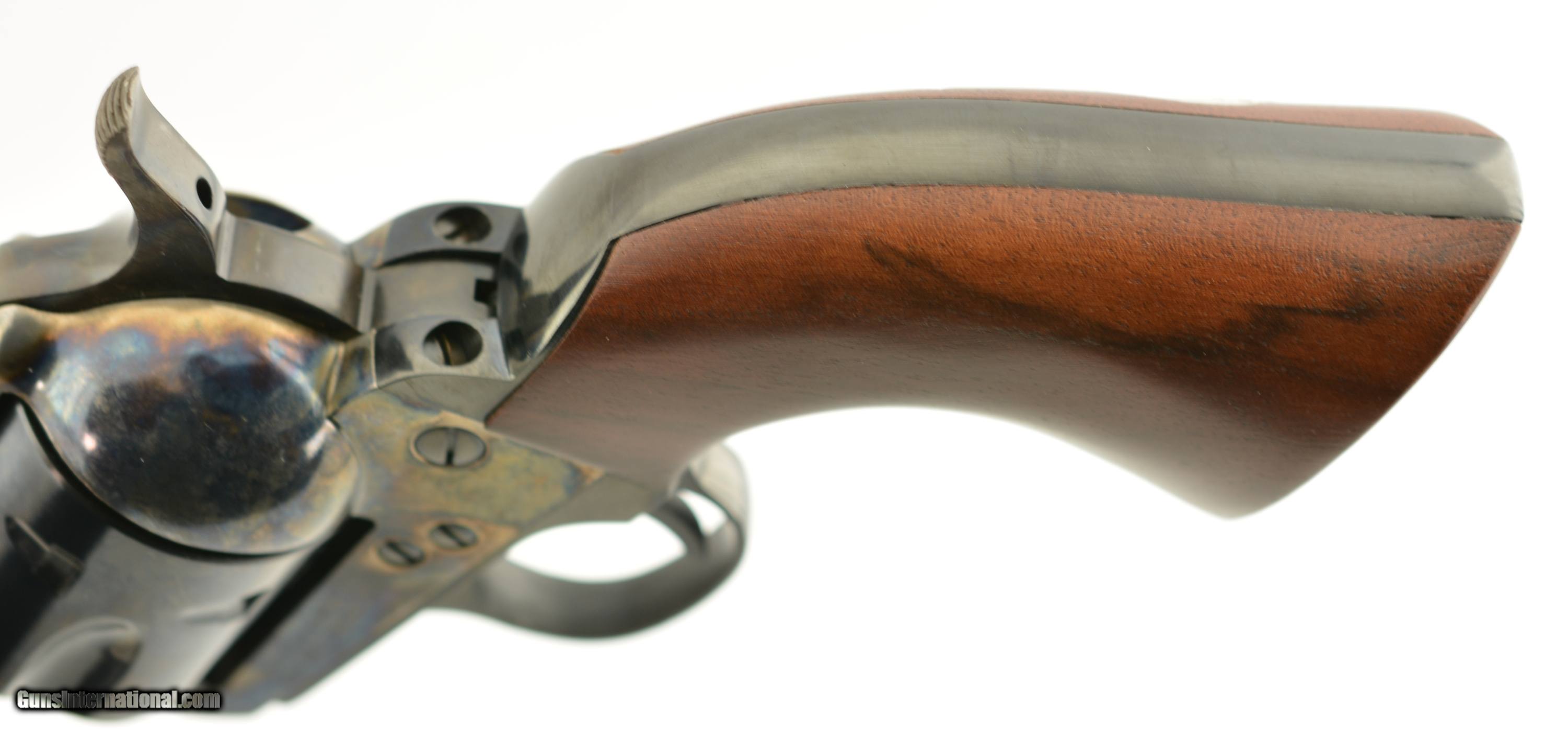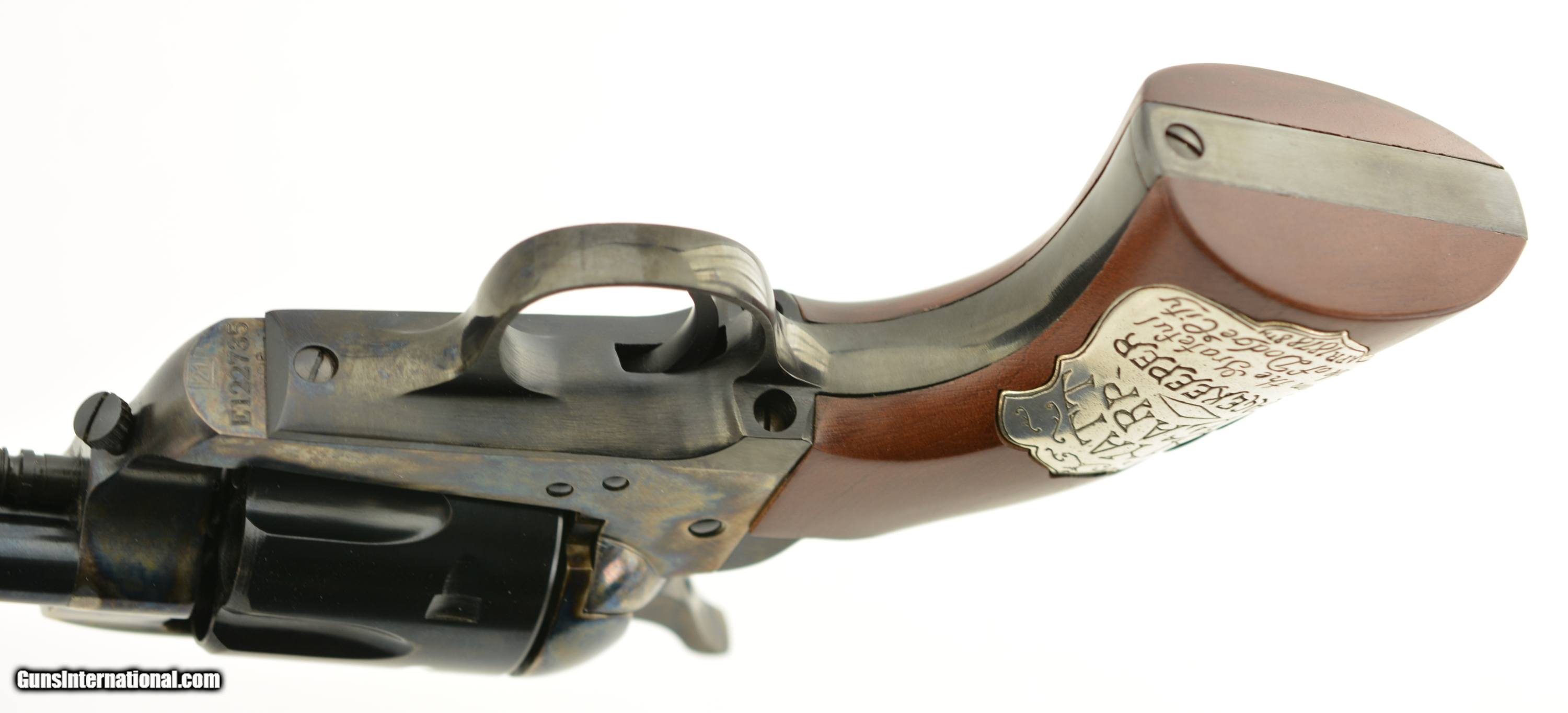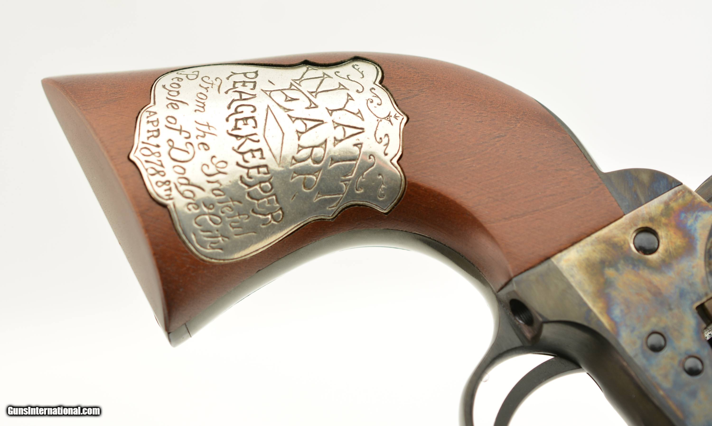 Description: Serial #E122735, .45 LC, 10 inch barrel with a bright, excellent bore. This is the Wyatt Earp Buntline pistol reproduction manufactured in Italy by Pietta for Cimarron F.A. Company featuring the a sterling silver inlay badge inscribed “WYATT / EARP / PEACEKEEPER / From the Grateful / People of Dodge City / APR 1878 8th" with a beautifully case colored frame and walnut grips. The revolver is in excellent plus like new condition and does not appear to have been used since leaving the factory with virtually all, 99% plus original finishes on the metal and wood showing only very light handling marks. It comes in a non-matching Taylor's box with a takedown tool. An excellent limited edition Waytt Earp Buntline. FFL SOLD Manufacturer: Cimarron Model: Wyatt Earp Serial Number: E122735 Caliber Info: .45 Colt Gauge Info: .45 Colt |