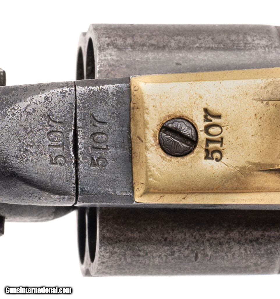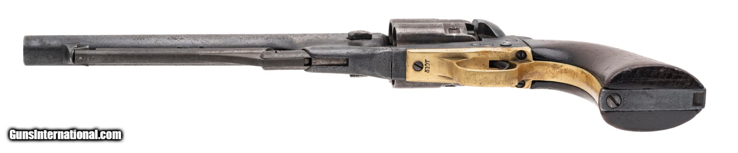 Description: "Serial number 5107. Made in 1861. 44 caliber with an 8" barrel. This barrel is marked with pin point size pitting and it appears it was refinished long ago. The barrel has more of a grayish blue patina at this point. All number match including the serial number. The action works well. The grips are very good. This gun is cut for stock and has the four screw frame. The action is crisp and indexes properly. Some of these guns have very interesting shipping addressed including Southern purchases. All in all a respectable early Colt Fluted army! Price: $4,500.00 Contact Seller |