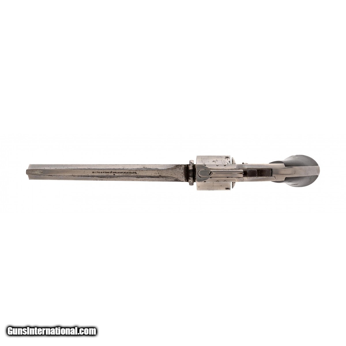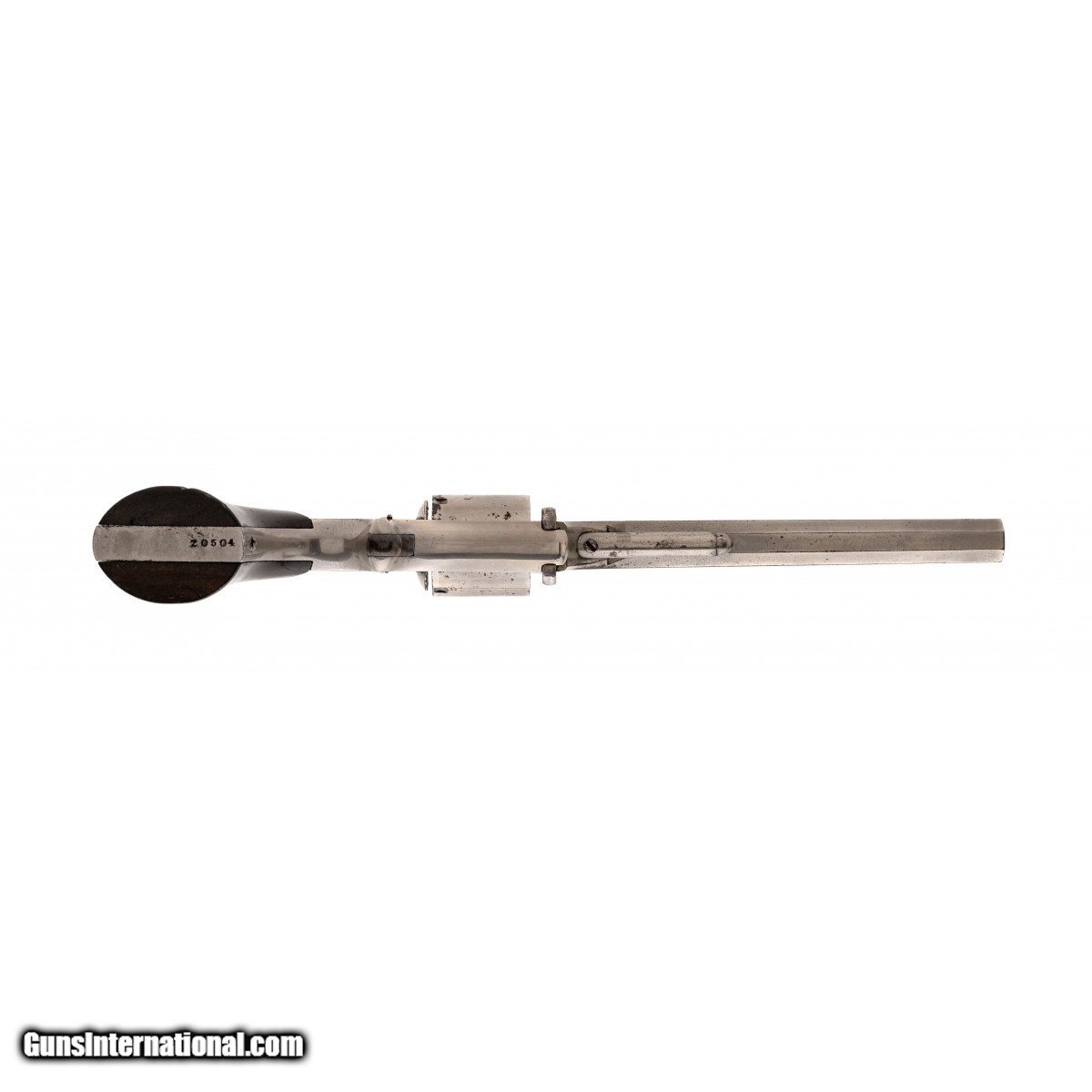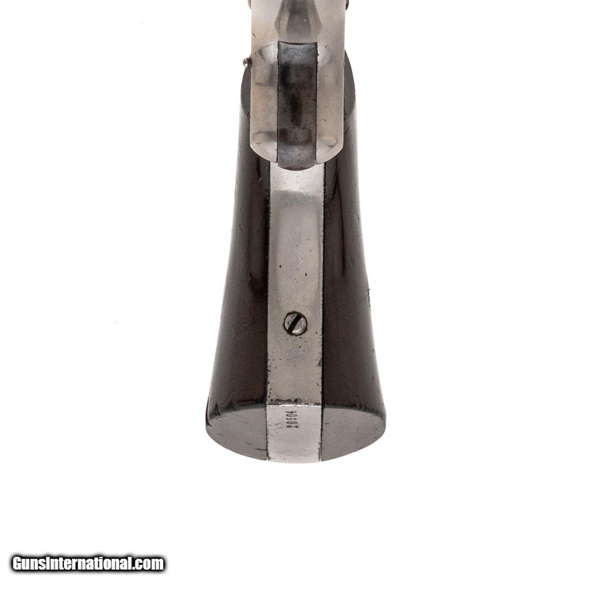 Description: " Serial No. 20504, circa 1864, .32RF, 5"" octagonal barrel. Dull Nickel plated finish with scattered areas of discoloration on barrel and forward of the cylinder. Bore has areas of frosting and light pitting visible throughout, rifling still remains strong. Two piece rosewood have light surface scratches and nicks noted at the bottom. Patent dates are still visible on the cylinder. Action indexes and functions correctly. Consignment. SOLD Antique: Yes |