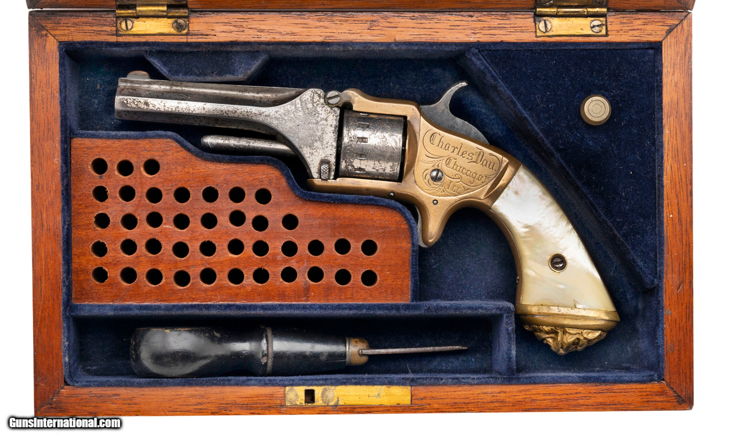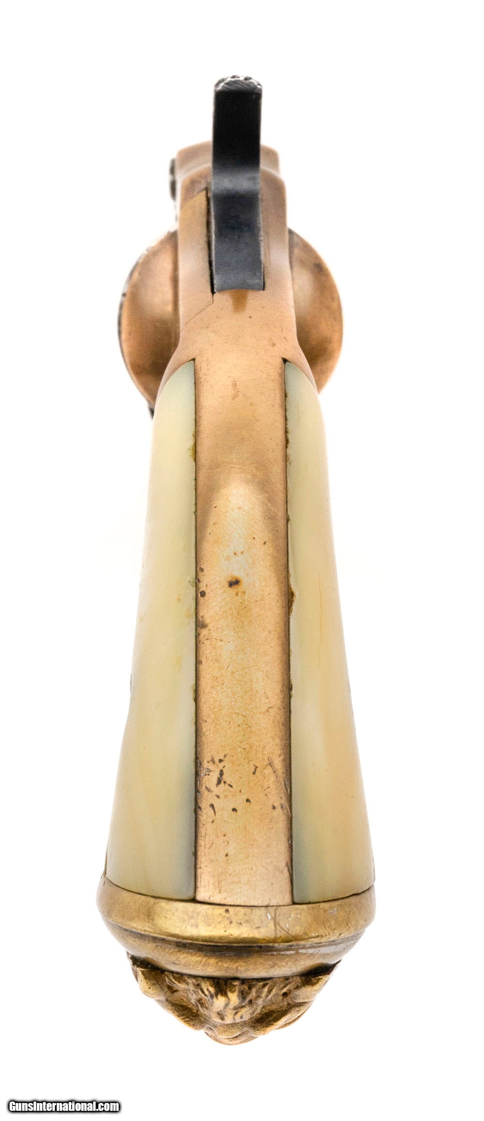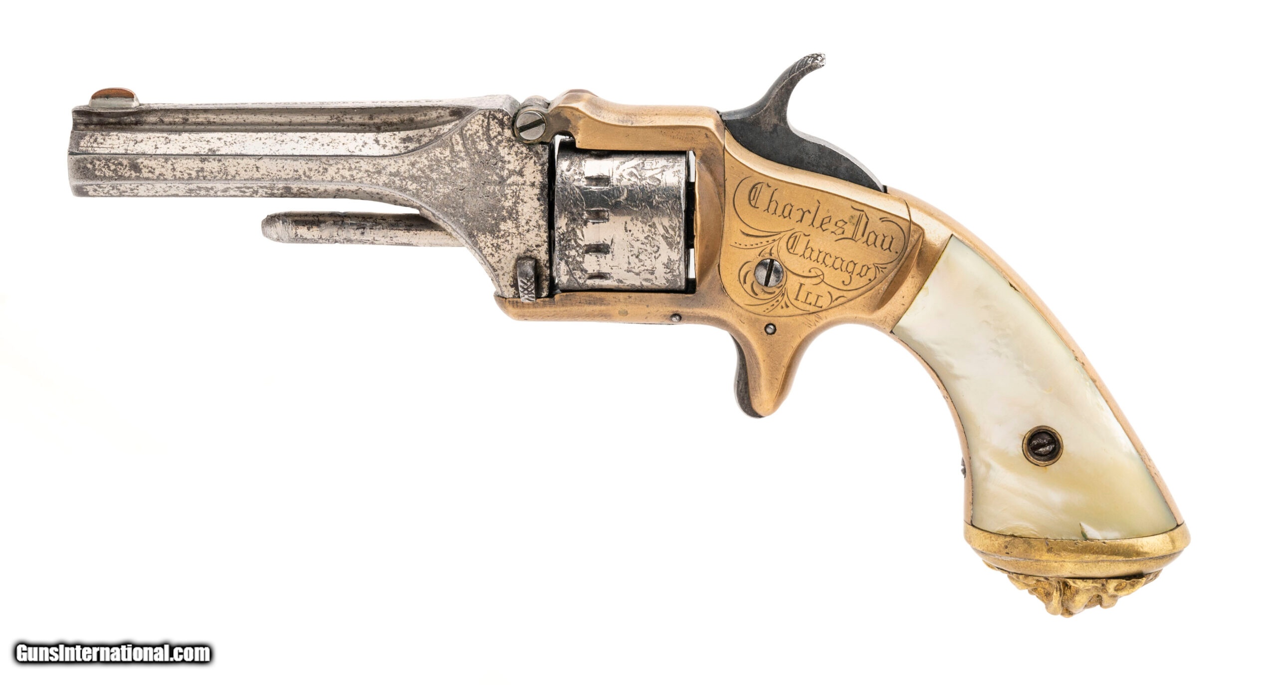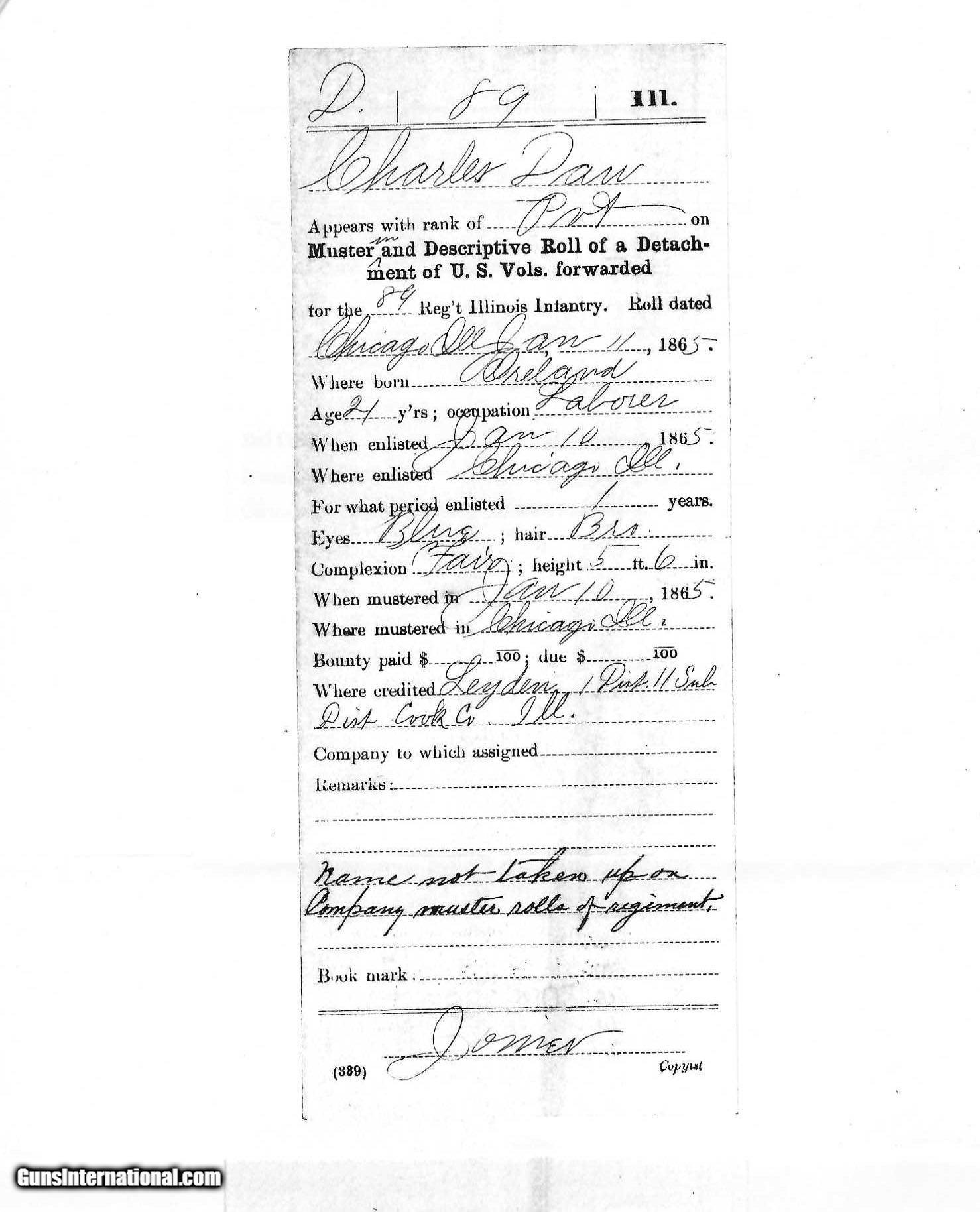Description: "Serial No. 2669, circa 1860’s, .22RF, 3 ¼" round barrel. Barrel’s nickel finish is worn with scattered oxidation visible. Brass plated frame is marked “Charles Dau. /Chicago/ILL" Traces of cylinder scene remain visible, MOP grips with lion head butt are in excellent condition. Action functions correctly for its age. Comes with period correct case with shell holder and screw driver. Charles Dau enlisted into the 89th Illinois Infantry on January,10th 1865 at the age of 21 for one year of service. He was 5’ 6" with blue eyes and brown hair; in early 1865 the 89th Ill. Infantry would be near the Alabama and Tennessee area until they were mustard out on June 24th,1865 in Chicago Ill. SOLD Antique: Yes |
