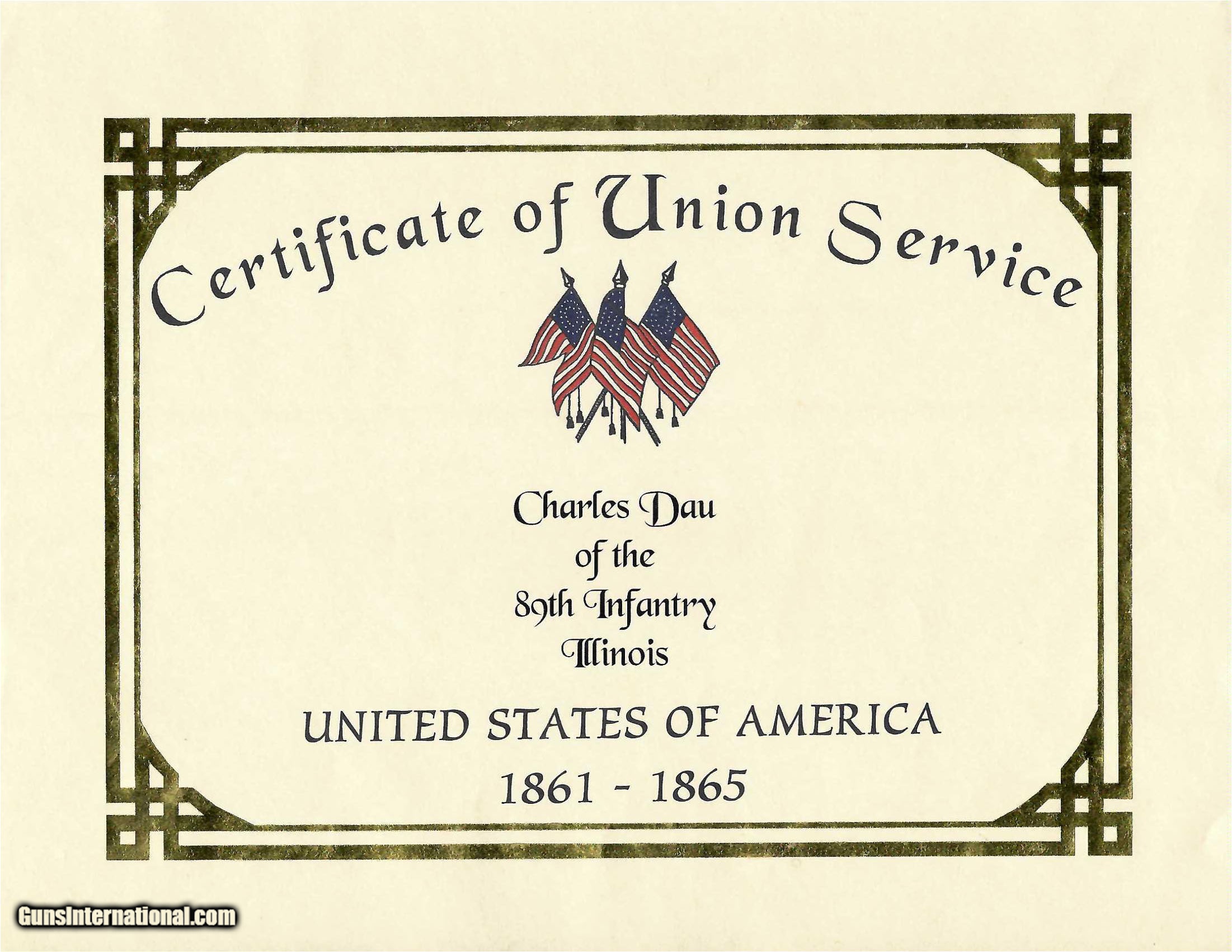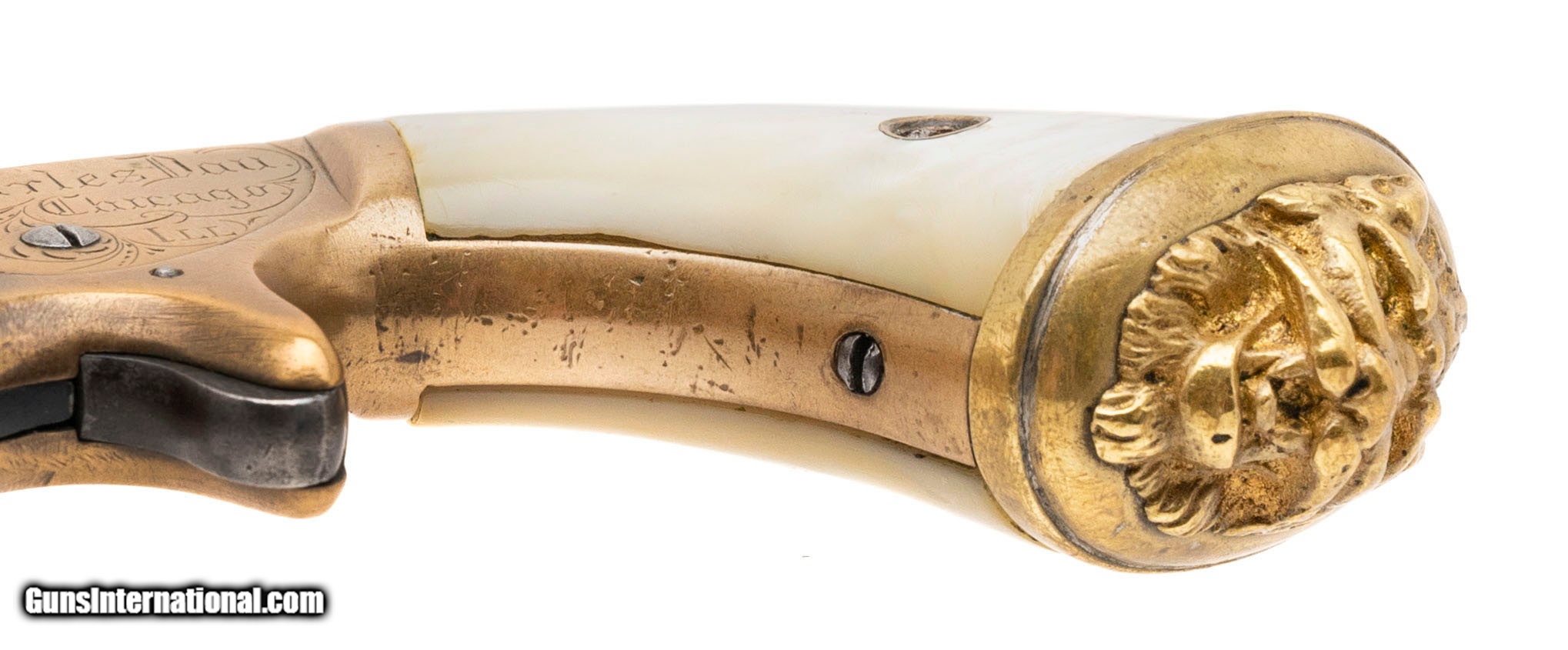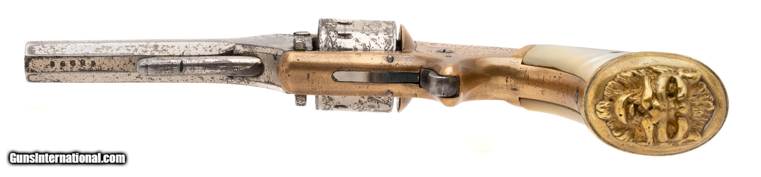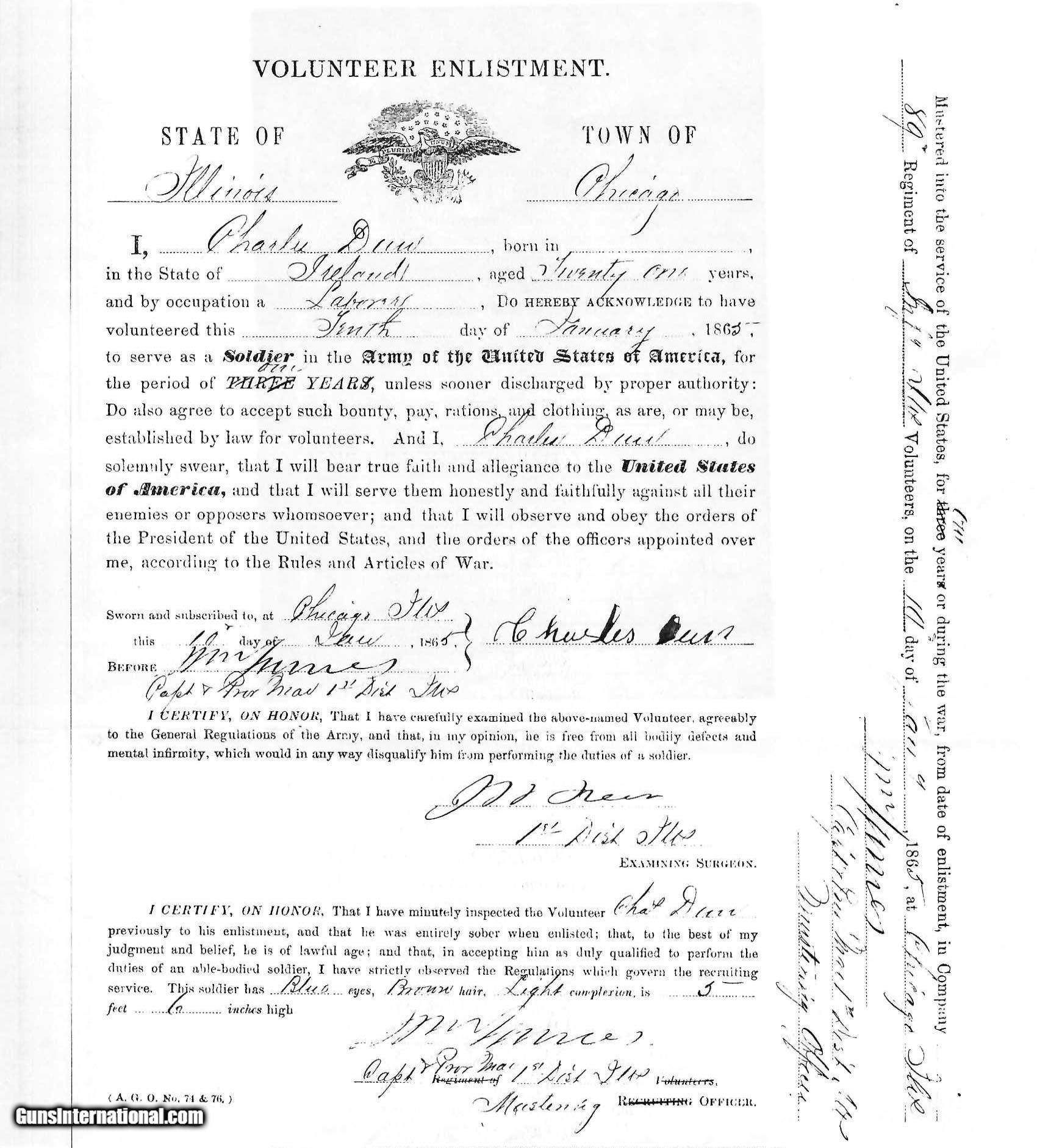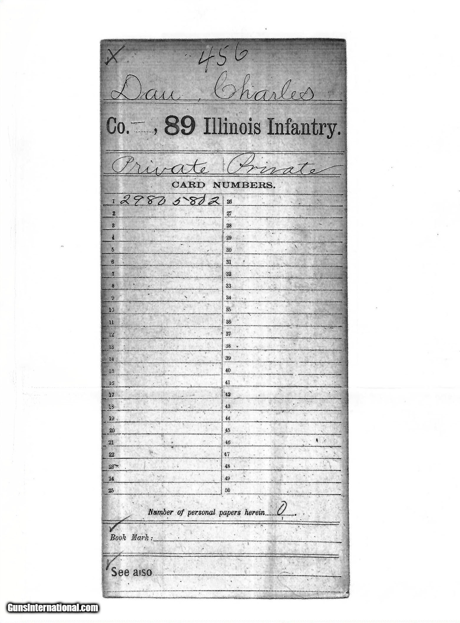 Description: "Serial No. 2669, circa 1860’s, .22RF, 3 ¼" round barrel. Barrel’s nickel finish is worn with scattered oxidation visible. Brass plated frame is marked “Charles Dau. /Chicago/ILL" Traces of cylinder scene remain visible, MOP grips with lion head butt are in excellent condition. Action functions correctly for its age. Comes with period correct case with shell holder and screw driver. Charles Dau enlisted into the 89th Illinois Infantry on January,10th 1865 at the age of 21 for one year of service. He was 5’ 6" with blue eyes and brown hair; in early 1865 the 89th Ill. Infantry would be near the Alabama and Tennessee area until they were mustard out on June 24th,1865 in Chicago Ill. SOLD Antique: Yes |