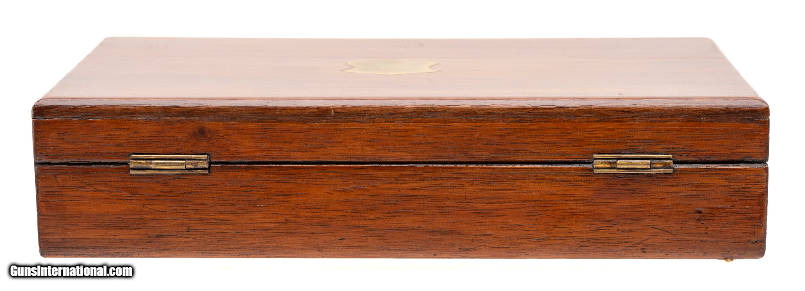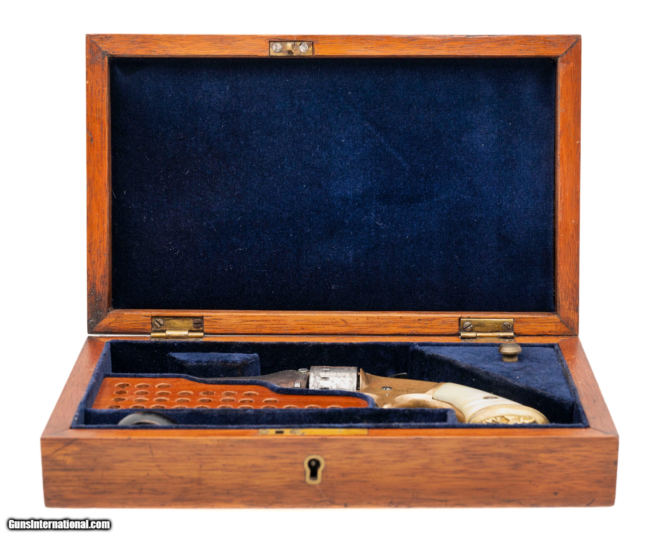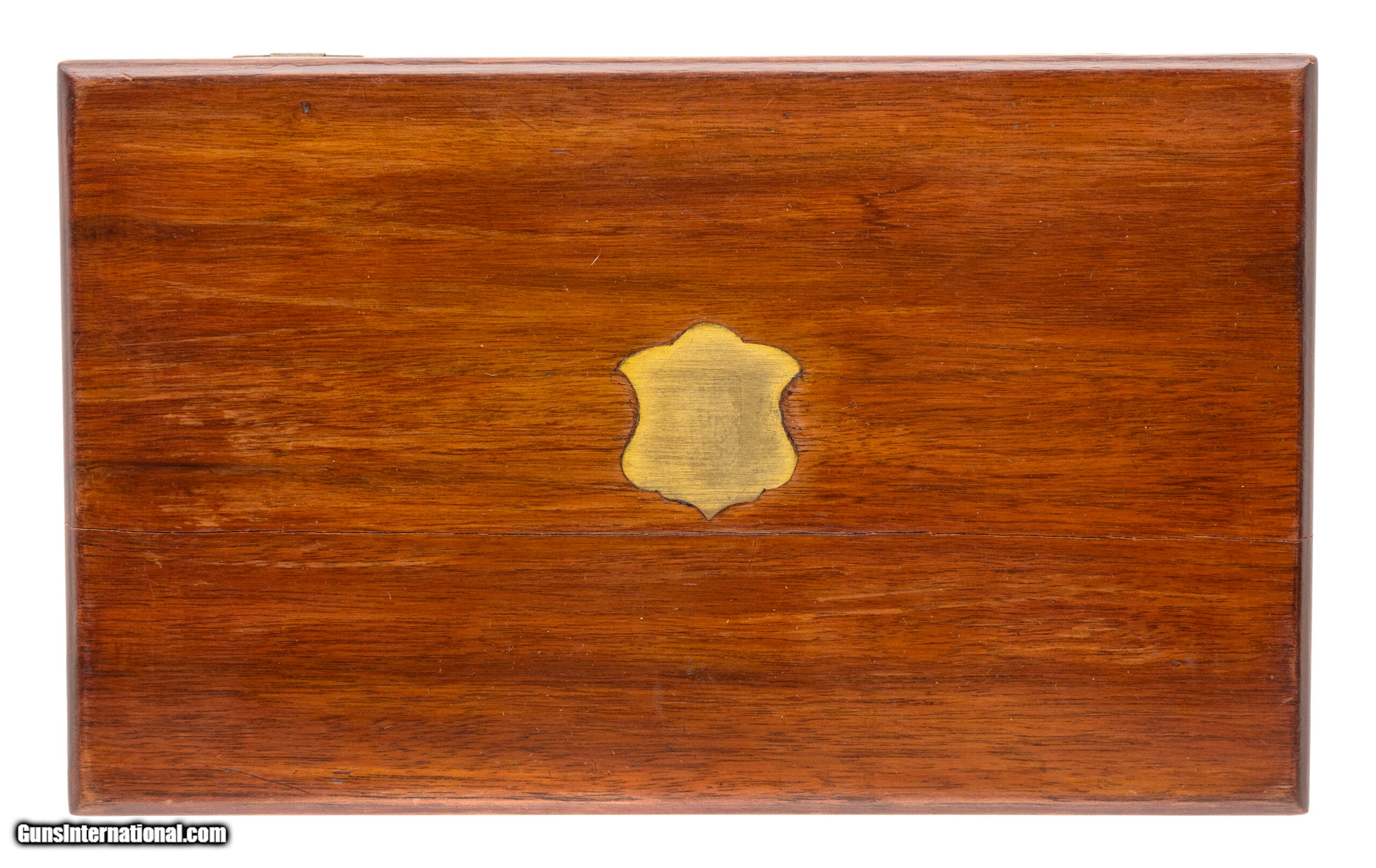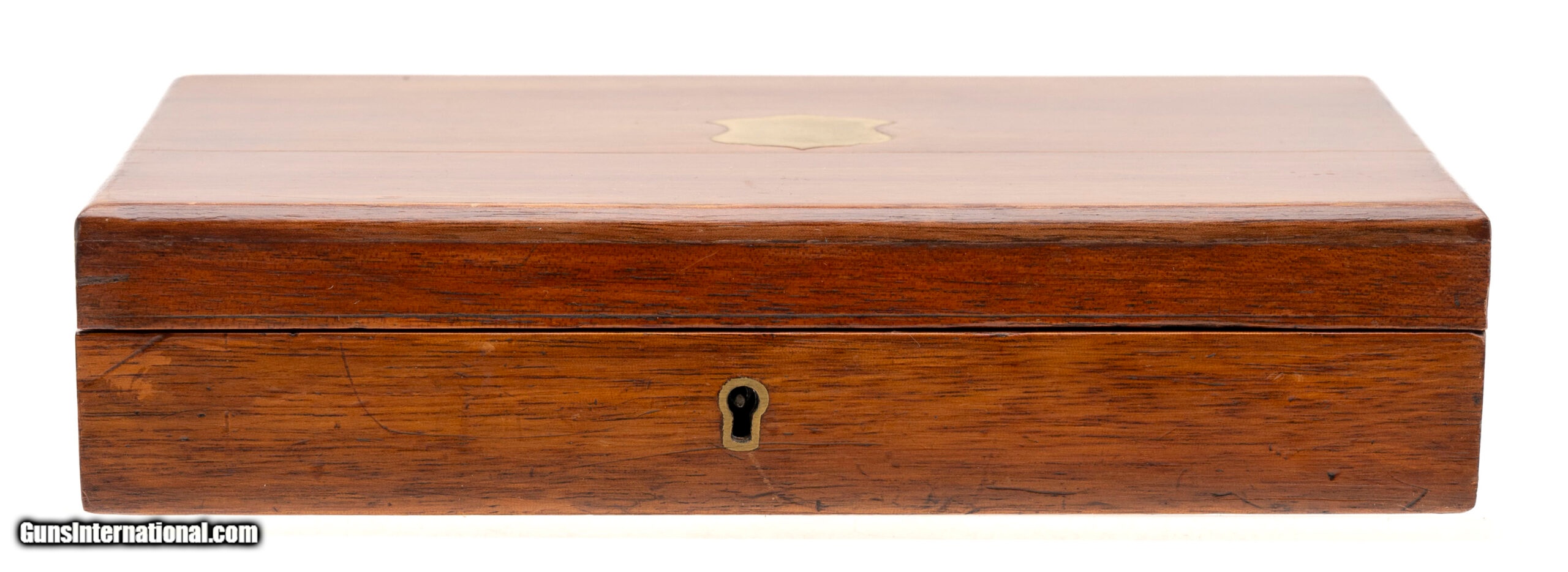 Description: "Serial No. 2669, circa 1860’s, .22RF, 3 ¼" round barrel. Barrel’s nickel finish is worn with scattered oxidation visible. Brass plated frame is marked “Charles Dau. /Chicago/ILL" Traces of cylinder scene remain visible, MOP grips with lion head butt are in excellent condition. Action functions correctly for its age. Comes with period correct case with shell holder and screw driver. Charles Dau enlisted into the 89th Illinois Infantry on January,10th 1865 at the age of 21 for one year of service. He was 5’ 6" with blue eyes and brown hair; in early 1865 the 89th Ill. Infantry would be near the Alabama and Tennessee area until they were mustard out on June 24th,1865 in Chicago Ill. SOLD Antique: Yes |