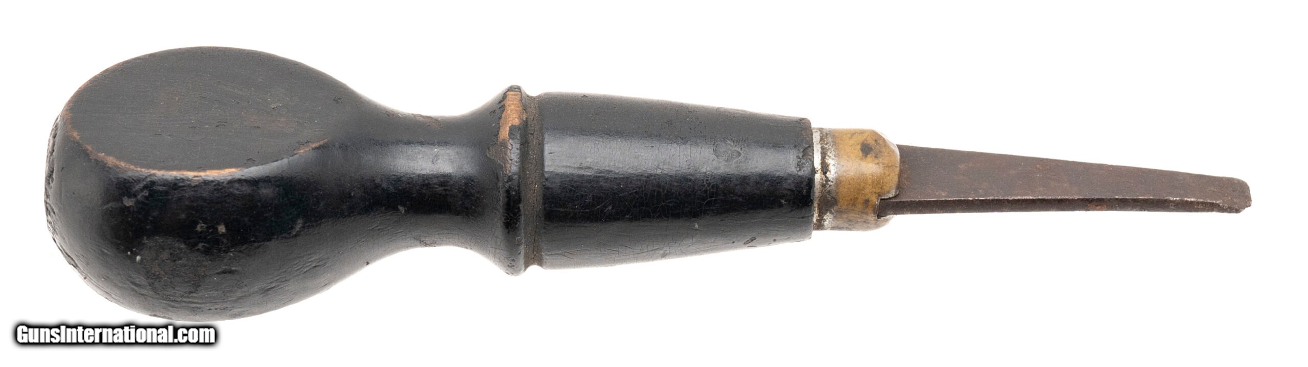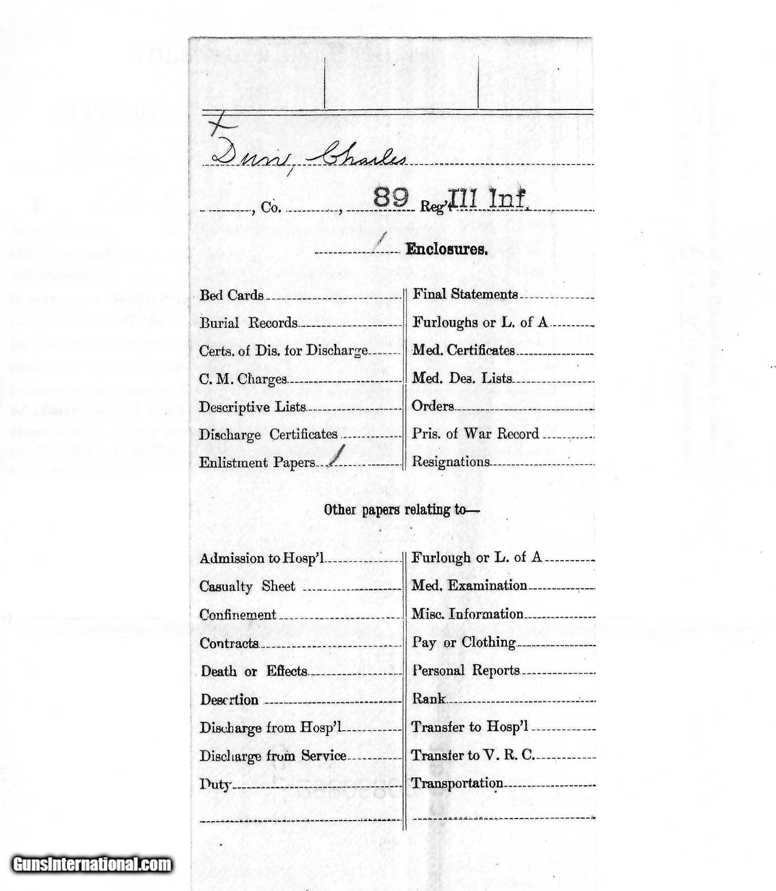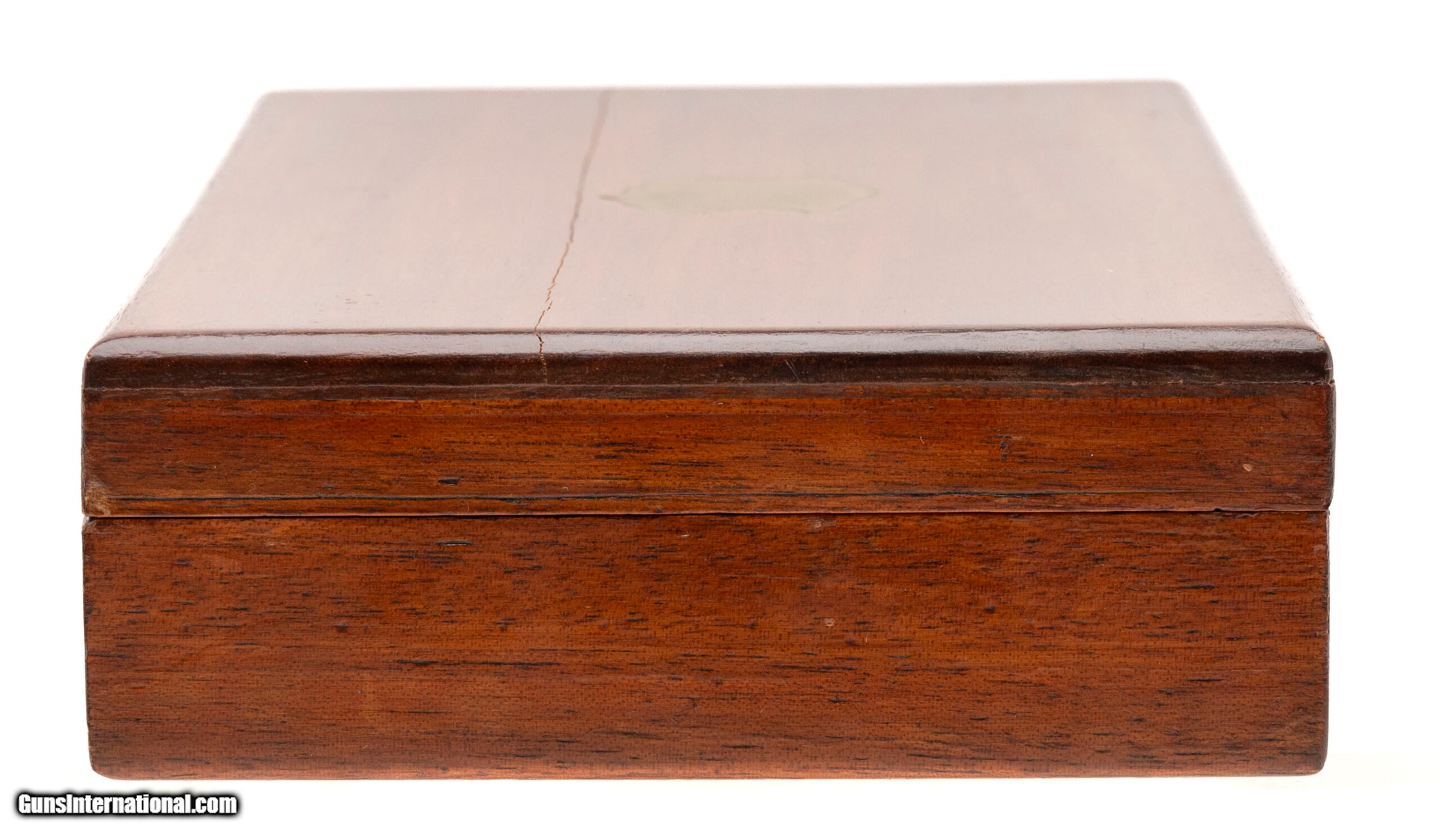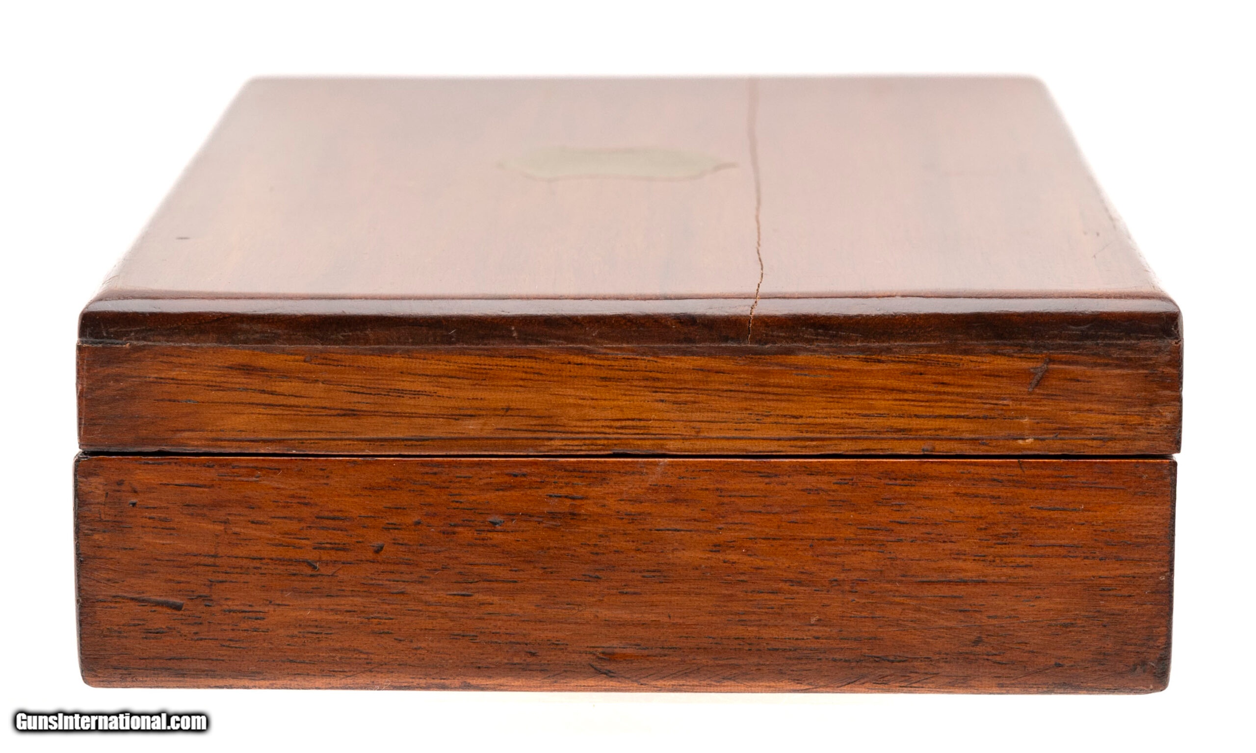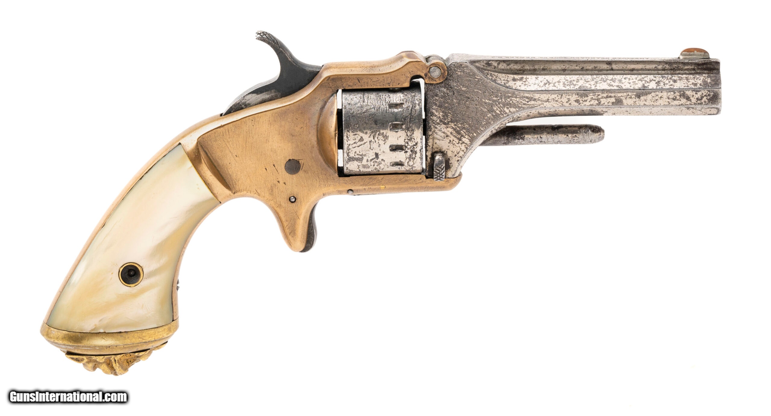 Description: "Serial No. 2669, circa 1860’s, .22RF, 3 ¼" round barrel. Barrel’s nickel finish is worn with scattered oxidation visible. Brass plated frame is marked “Charles Dau. /Chicago/ILL" Traces of cylinder scene remain visible, MOP grips with lion head butt are in excellent condition. Action functions correctly for its age. Comes with period correct case with shell holder and screw driver. Charles Dau enlisted into the 89th Illinois Infantry on January,10th 1865 at the age of 21 for one year of service. He was 5’ 6" with blue eyes and brown hair; in early 1865 the 89th Ill. Infantry would be near the Alabama and Tennessee area until they were mustard out on June 24th,1865 in Chicago Ill. SOLD Antique: Yes |