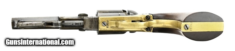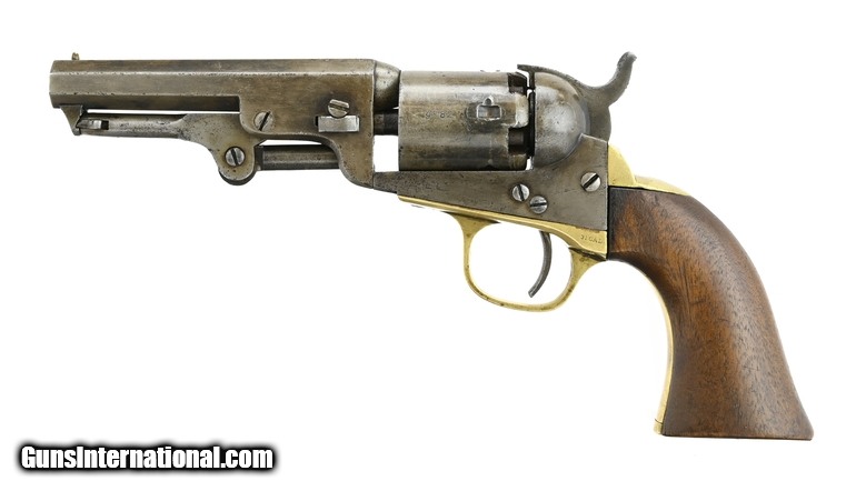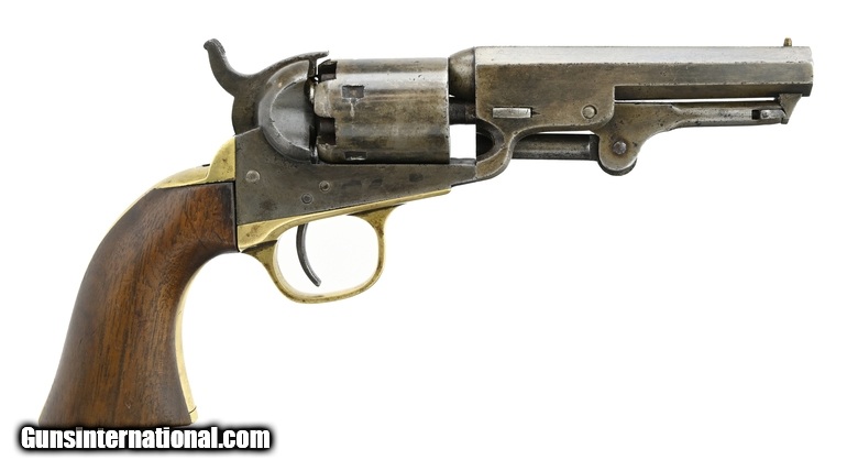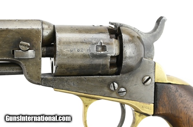 Colt 1849 Pocket Model Revolver. .31 Caliber percussion. Barrel length 4". Bore has good rifling. Numbers match, loading lever has no number. Action works perfectly. Barrel address is missing and barrel looks as if it never had a barrel address. It probably did and it was removed at some point. Colts patent mark is on left side of frame. Grips are excellent. Gun has areas of blue and other areas of brown patina. Reasonably priced.
