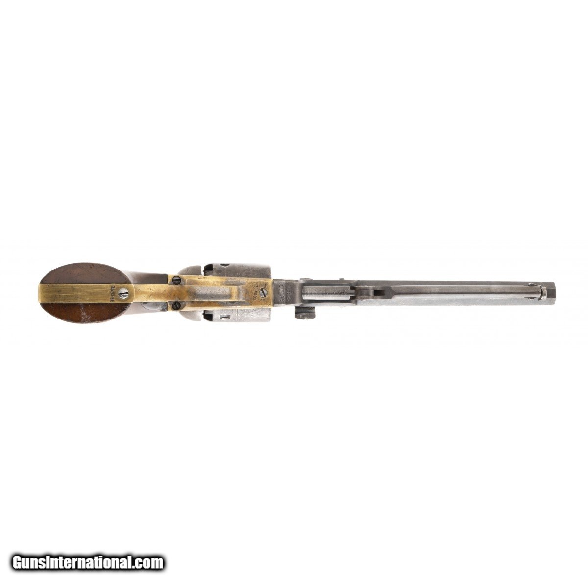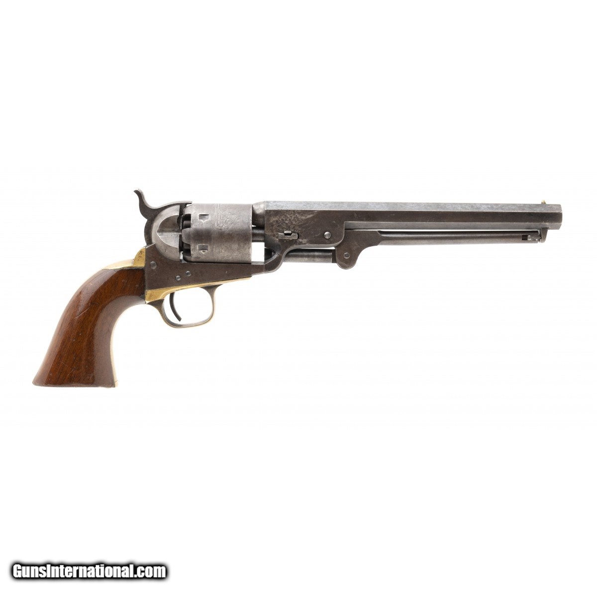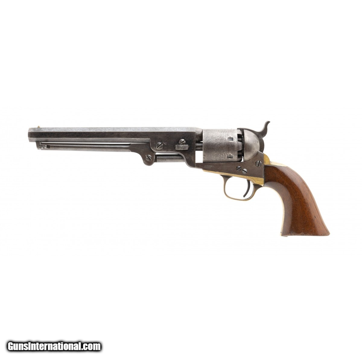 Description: "Serial number 166532. Made in 1863. Very nice sharp gun with 50% of the original blue. This gun has an excellent cylinder scene. This gun is factory mismatched on the frame. The frame is stamped 166532 while the rest of the parts are marked 165532. The cylinder is numbered to both numbers. Grips are excellent. Very fine example of a Civil war era produced Colt 1851 Navy! SOLD Antique: Yes |