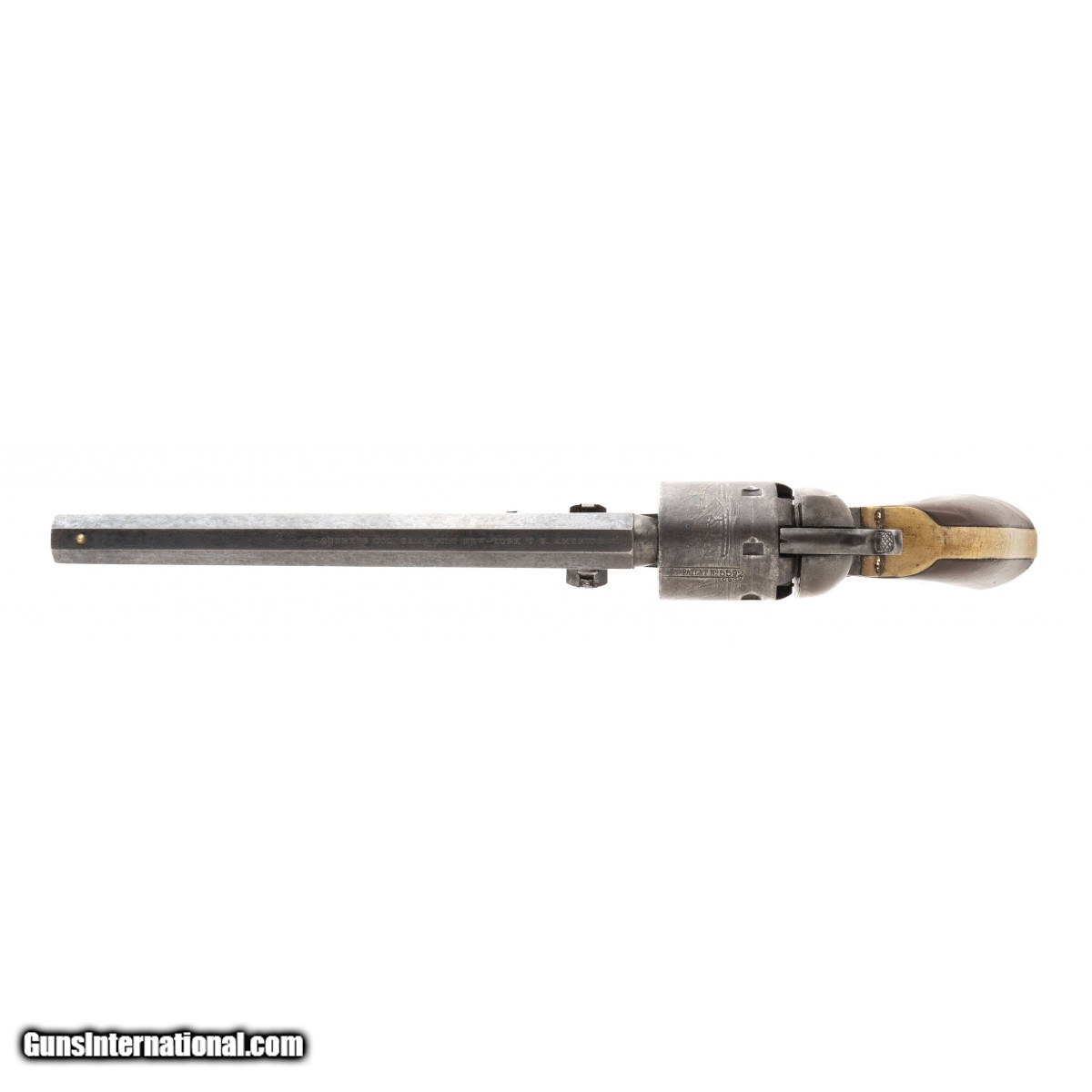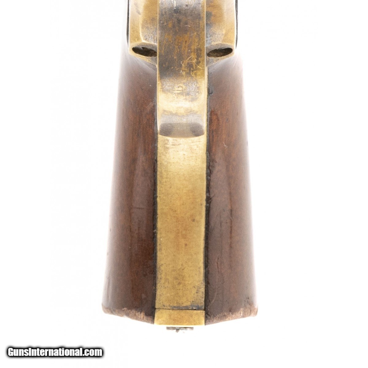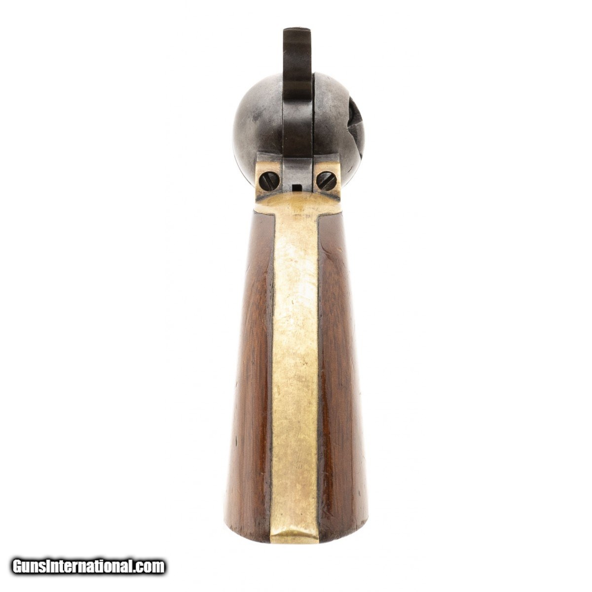 Description: "Serial number 166532. Made in 1863. Very nice sharp gun with 50% of the original blue. This gun has an excellent cylinder scene. This gun is factory mismatched on the frame. The frame is stamped 166532 while the rest of the parts are marked 165532. The cylinder is numbered to both numbers. Grips are excellent. Very fine example of a Civil war era produced Colt 1851 Navy! SOLD Antique: Yes |