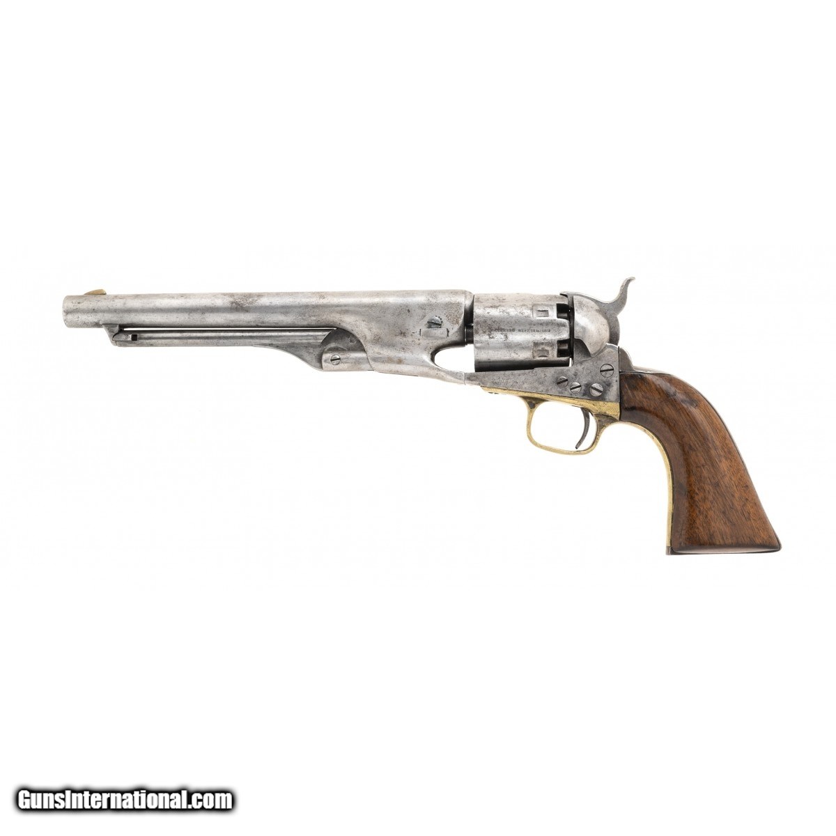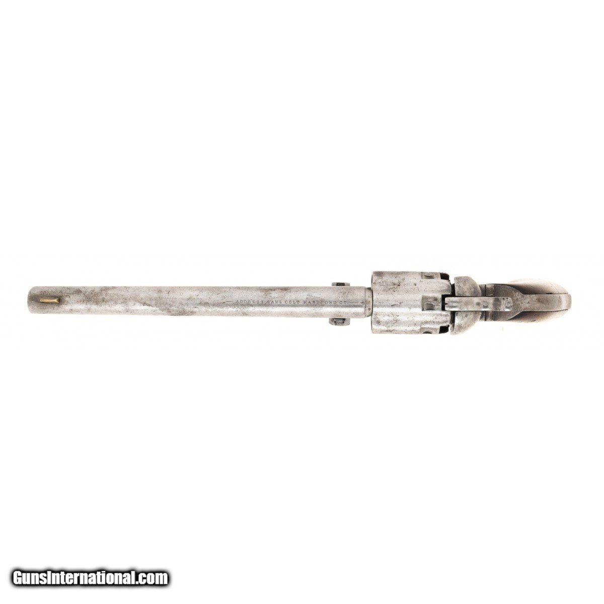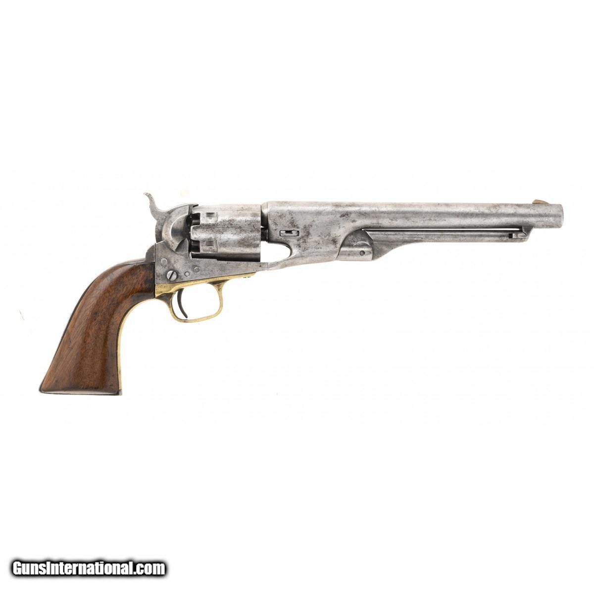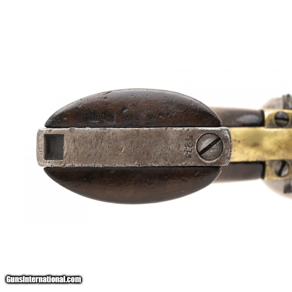 Serial number 5214. Made in 1861. 44 caliber with an 8" barrel. Metal has an even gray patina. Grips are very good as lightly refinished. This gun is all original with the exception of the serial number on the frame. Action works well.