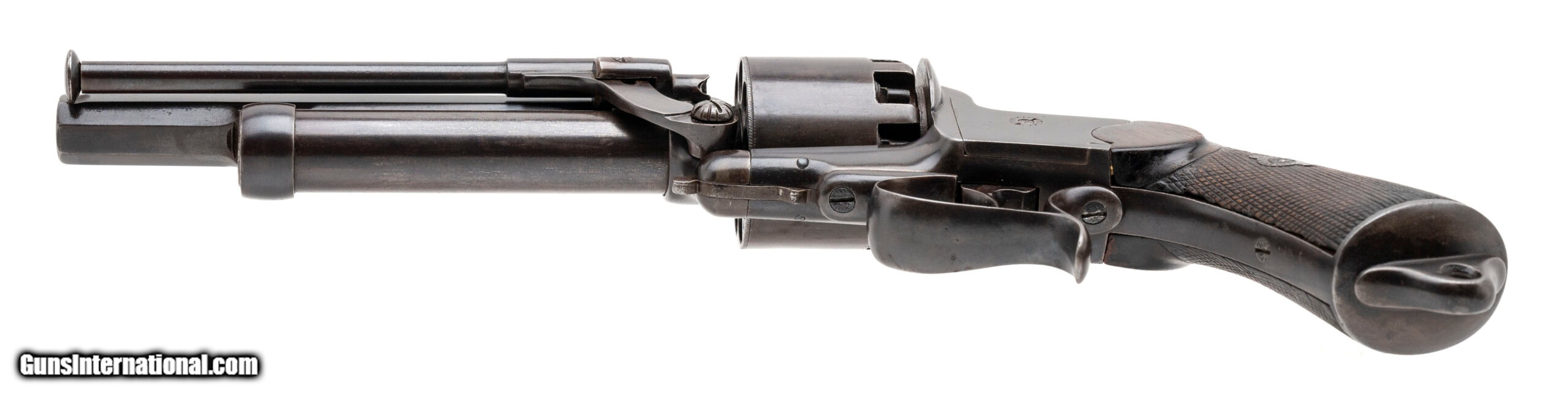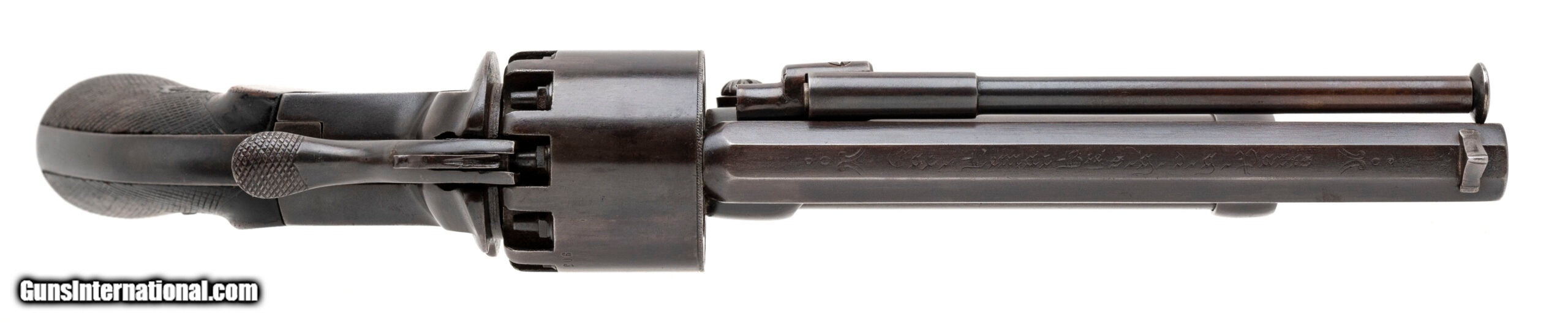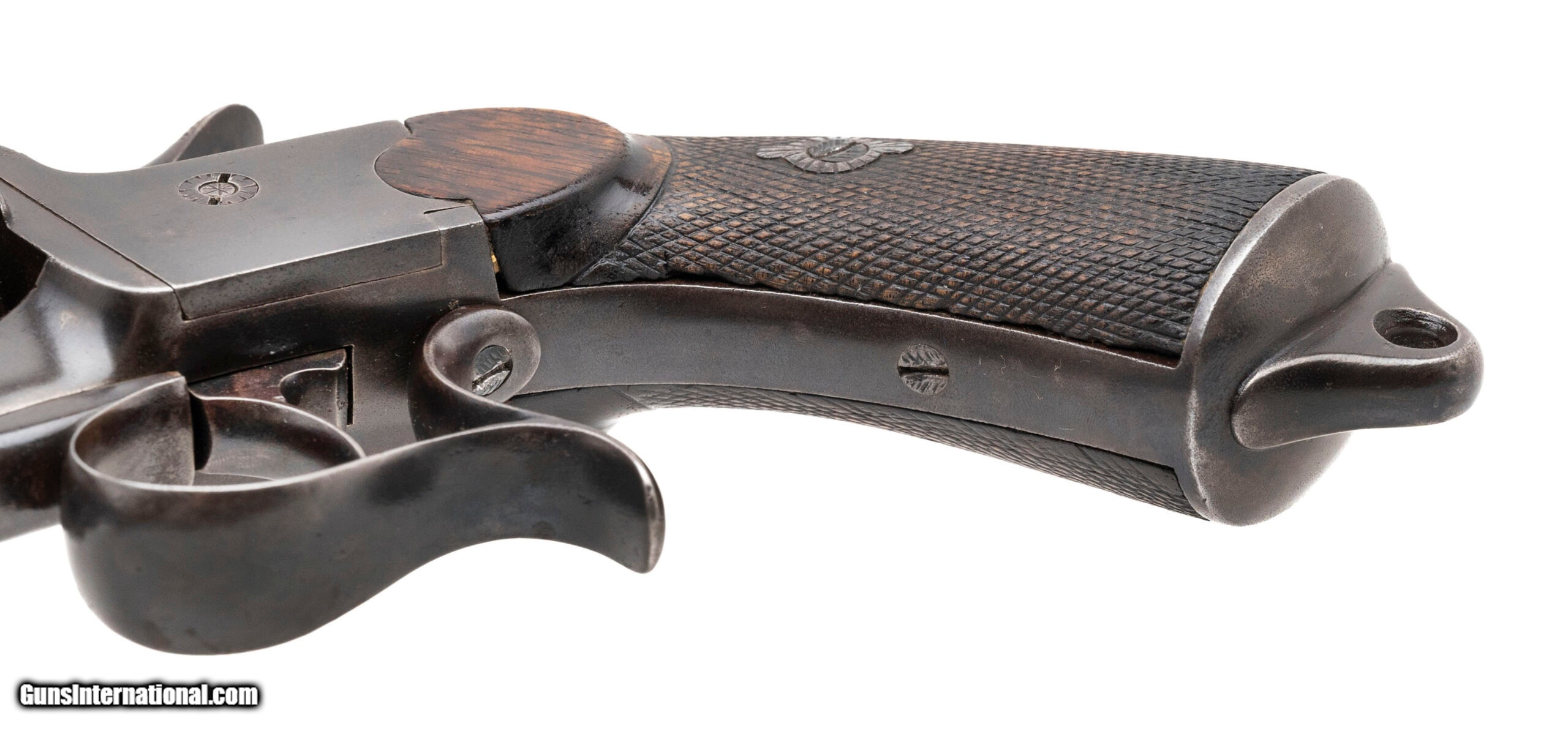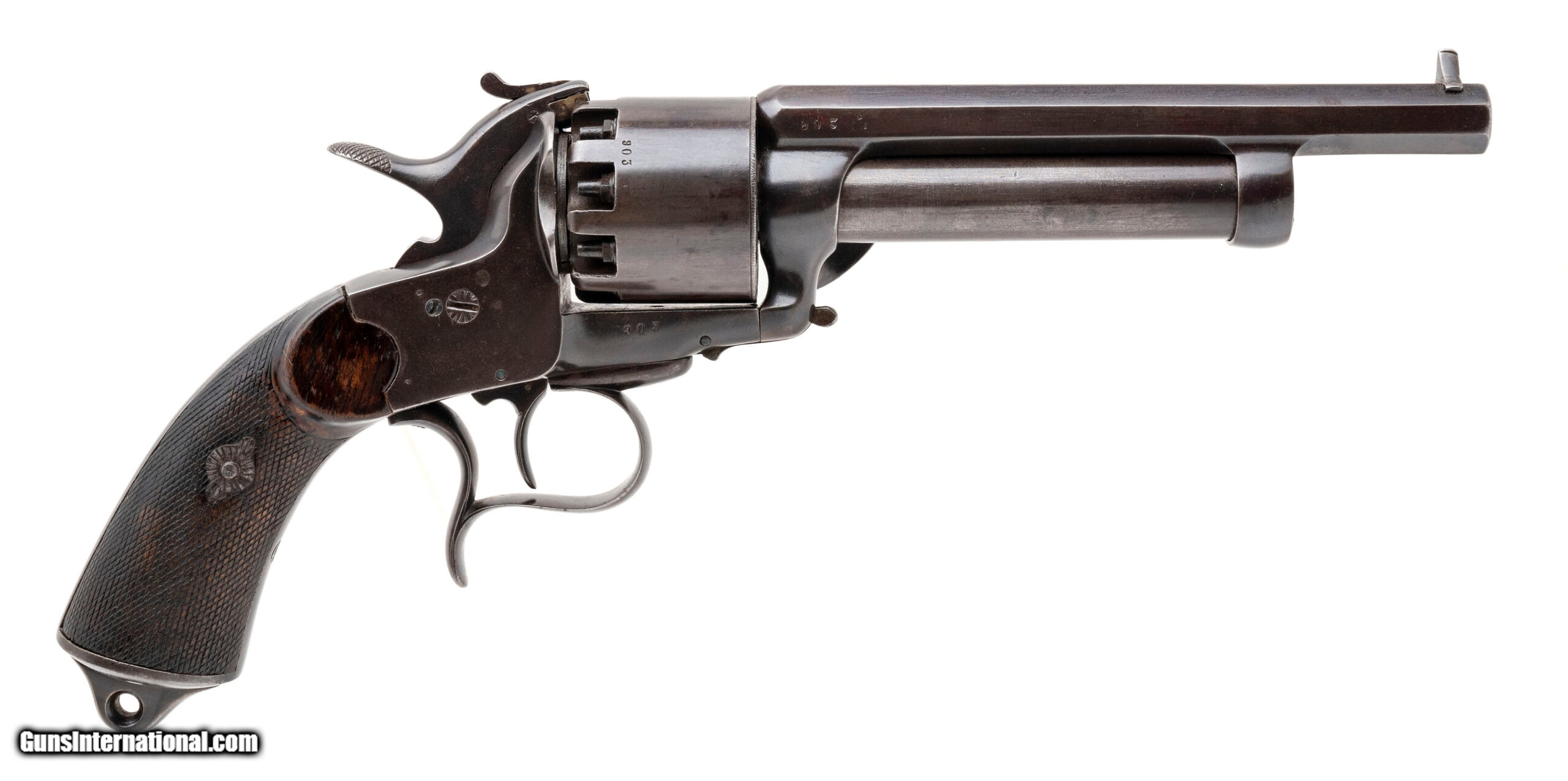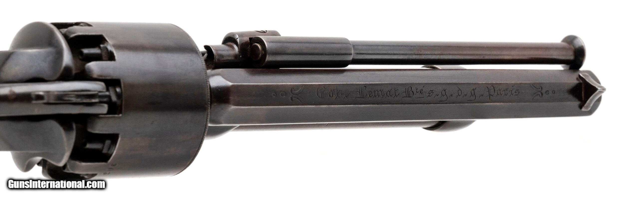 Description: "Serial number 903. Made circa 1862. 42 caliber with a 6 ¾" barrel and 16 Gauge with a 6 ½" barrel. This gun is excellent as refinished. This is a nice sharp gun with a bluish to brown restored finish on 98% of the metal. Small inspectors marks remain as well as the barrel address indicating this is a Paris manufacture. The grips are very good. This is a transitional model between the Belgian guns and the Parisian guns. We have also heard the Belgian style guns referd to as the 1st Models and the Parisian guns as the second Models. This gun still has the trigger guard spur on a Parisian gun, so it is a transitional. Action works properly. These guns were invented by Dr. Jean Alexandre LeMat. He was the brother in law of Confederate General P. T. Beauregard. The confederacy issued a contract for 5,000 guns and between 2500 and 3,000 were delivered. Very Neat confederate gun! SOLD Antique: Yes |