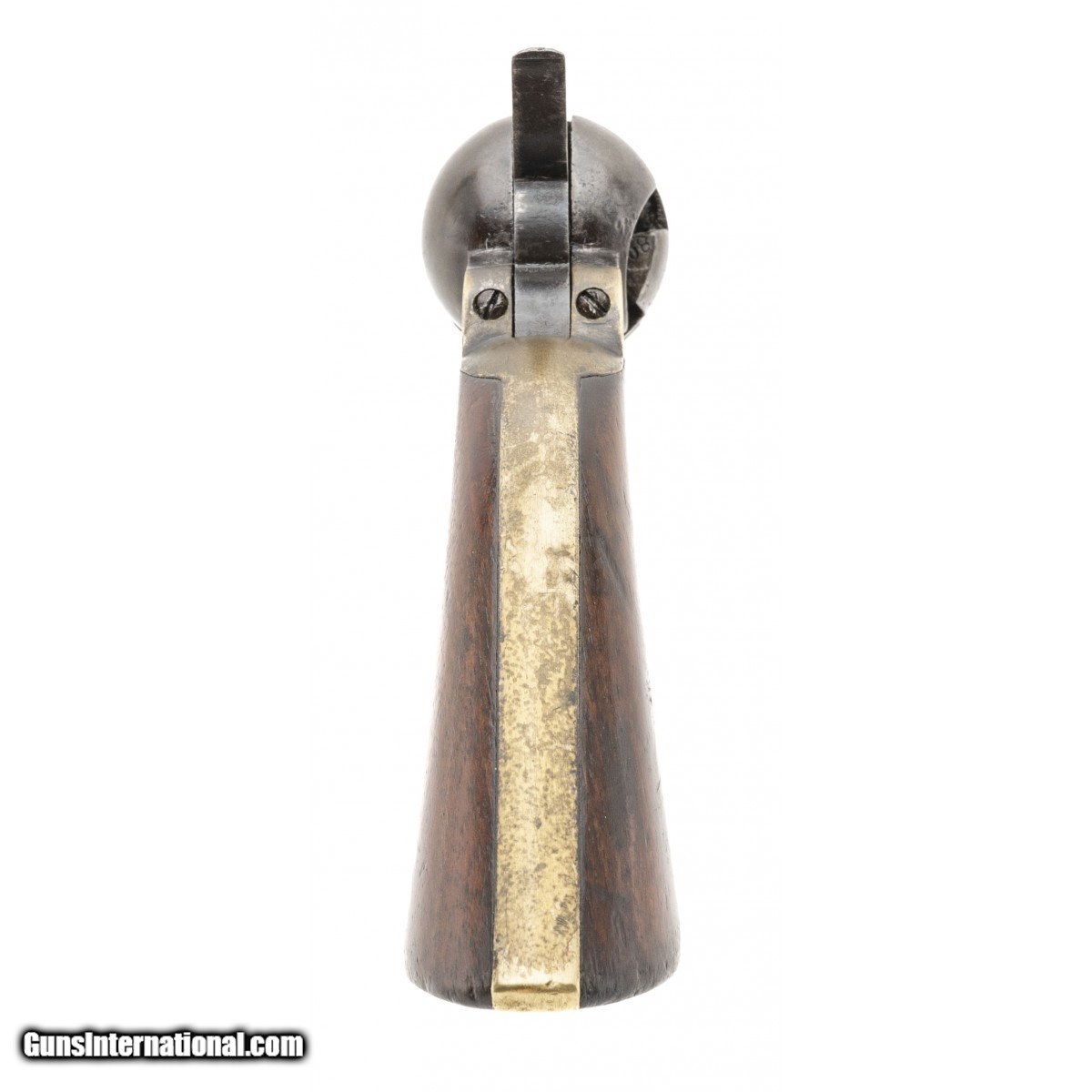 Description: " Single action 5-Shot percussion revolver with 6.5"" barrel. Has matching serial numbers. The bore has very good rifling with some light pitting scattered. Th action works perfectly. The cylinder has faint panel scenes. The grips are original and are very good with light varnish. Overall very good. SOLD Antique: Yes |