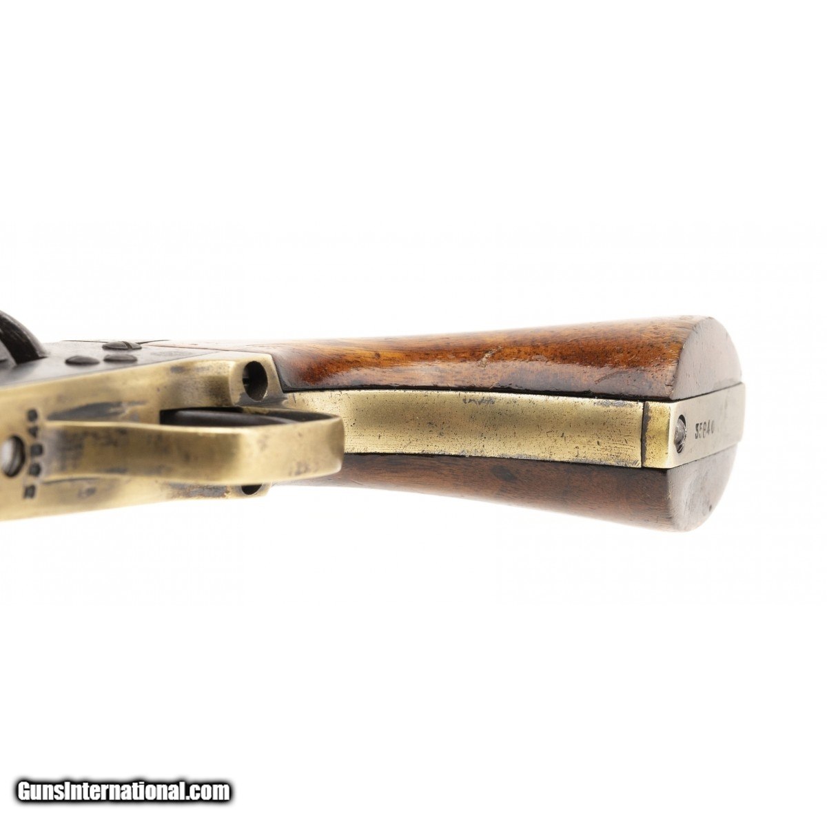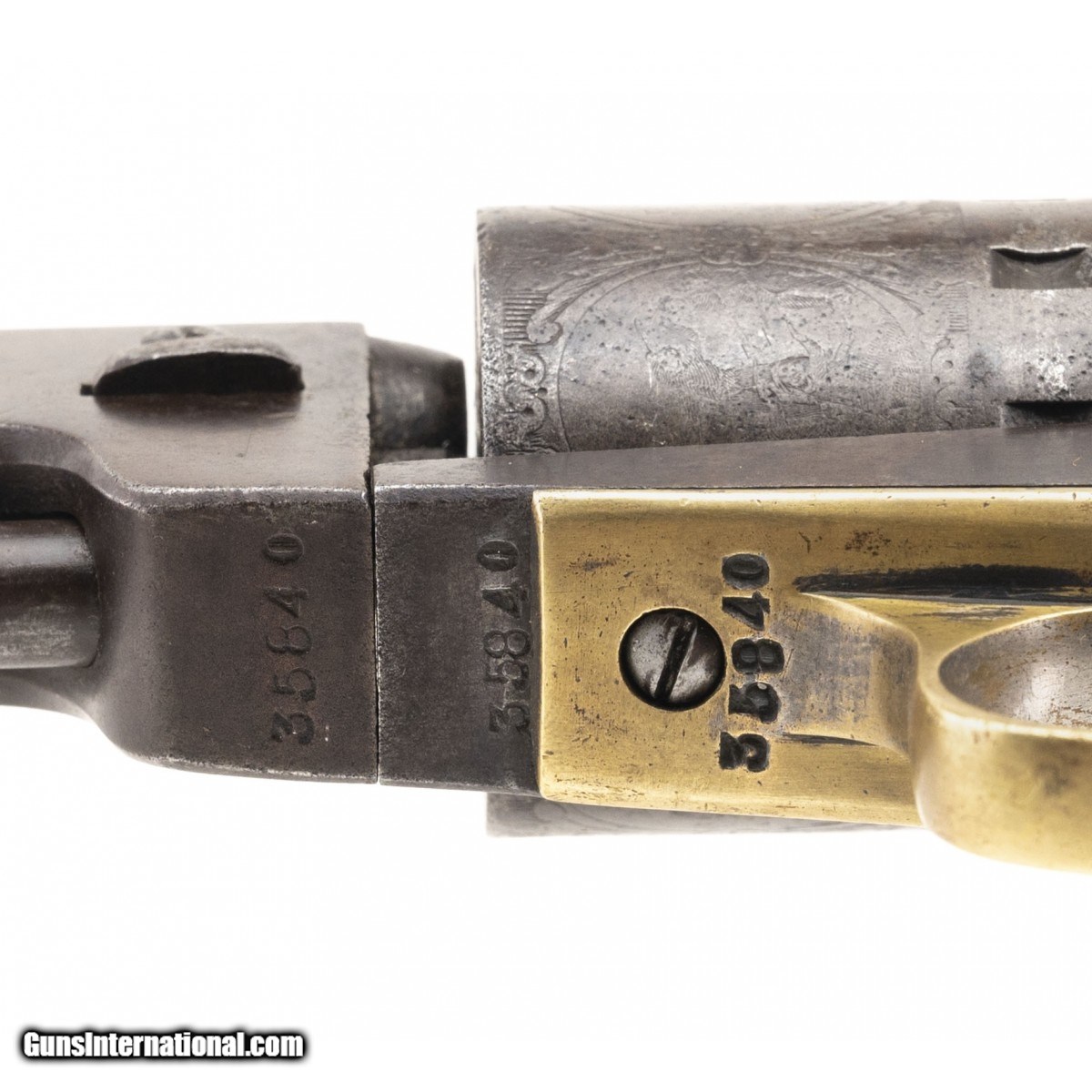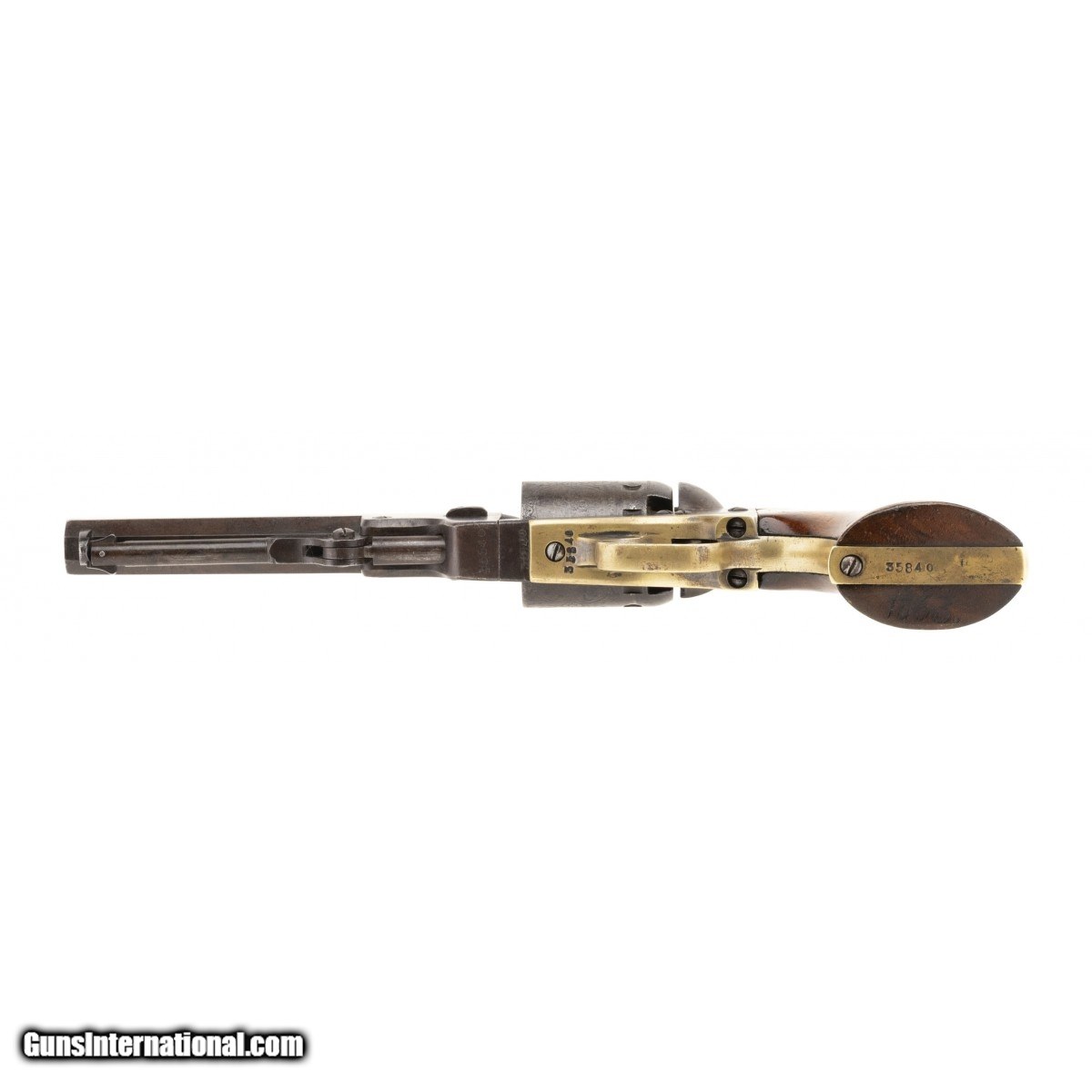Description: " Civil War era single-action percussion revolver with 5"" octagonal barrel. Made from 1859-1868. The cylinder shows five scenes that have show some holster wear. The bore is very good with strong rifling. The nipples are very good with none mashed. The serials are matching. The grips are very good plus and have most of their varnish. The brass parts have light patina. In its day Manhattan Firearms was a competitor of Colt. Overall this is a very good plus example. SOLD Antique: Yes |