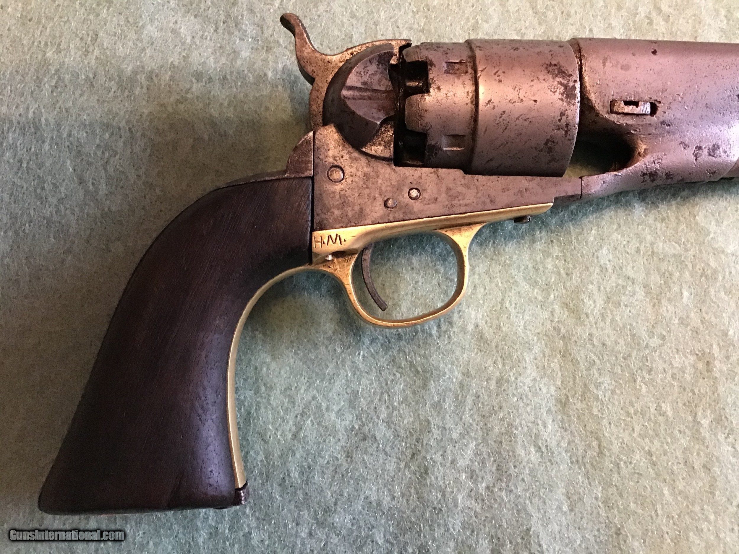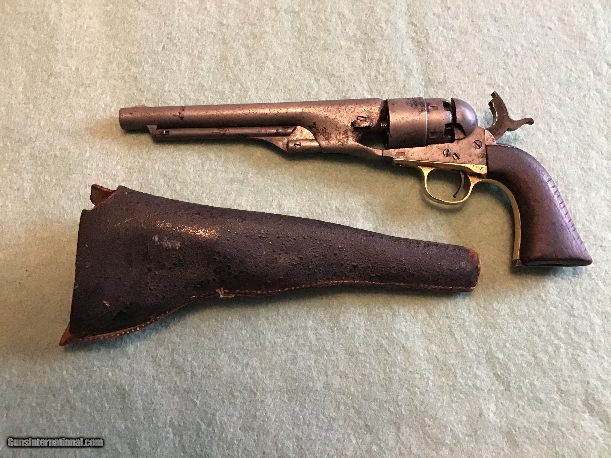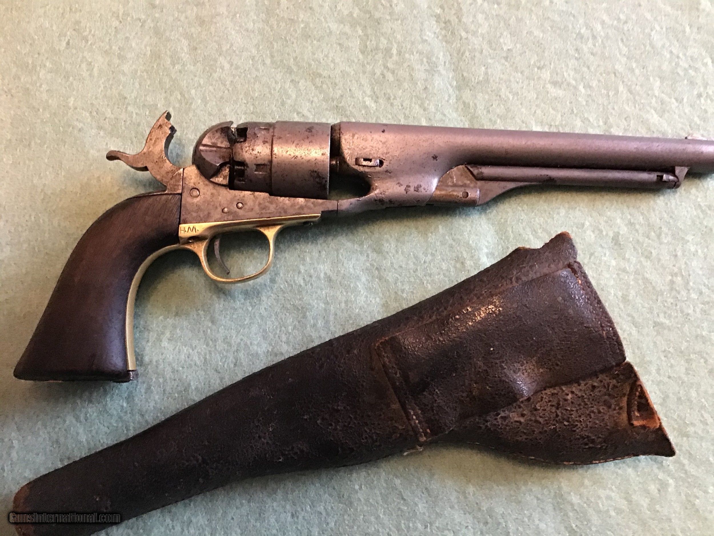 Description: Model 1860 Colt Army civil war percussion 44 revolver with original holster (original holster is missing its flap) Serial number 48648 on the butt and trigger guard and 57521 on the barrel and frame. Colt address is visible on the top of the barrel and pat. info is partially visible on the cylinder and COLTS PATENT is visible on the side of the frame. Marked Tex. On one side and initial H.M. On the other side. There is also a faint inspector cartouche on the right grip. The iron frame and cylinder have been cleaned,now are mostly grey mixed with a little brown (no I didn't clean it) and scattered pitting. The cylinder turns and locks as it should. All nipples are present and in good condition. The gun is tight and seems to function as it should. A good operating example of a historic firearm. Priority mail shipping should be around $25.00. Please feel free to call me if you have any questions 218-839-9272 or chriskobberdahl2gmail. SALE PENDING SOLD SOLD Antique: Yes Manufacturer: Colt Model: 1860 Army Serial Number: 48646/57522 Barrel Length: 8” Caliber Info: 44 Condition: Good Metal Condition: Good Wood Condition: Good Bore Condition: Good |