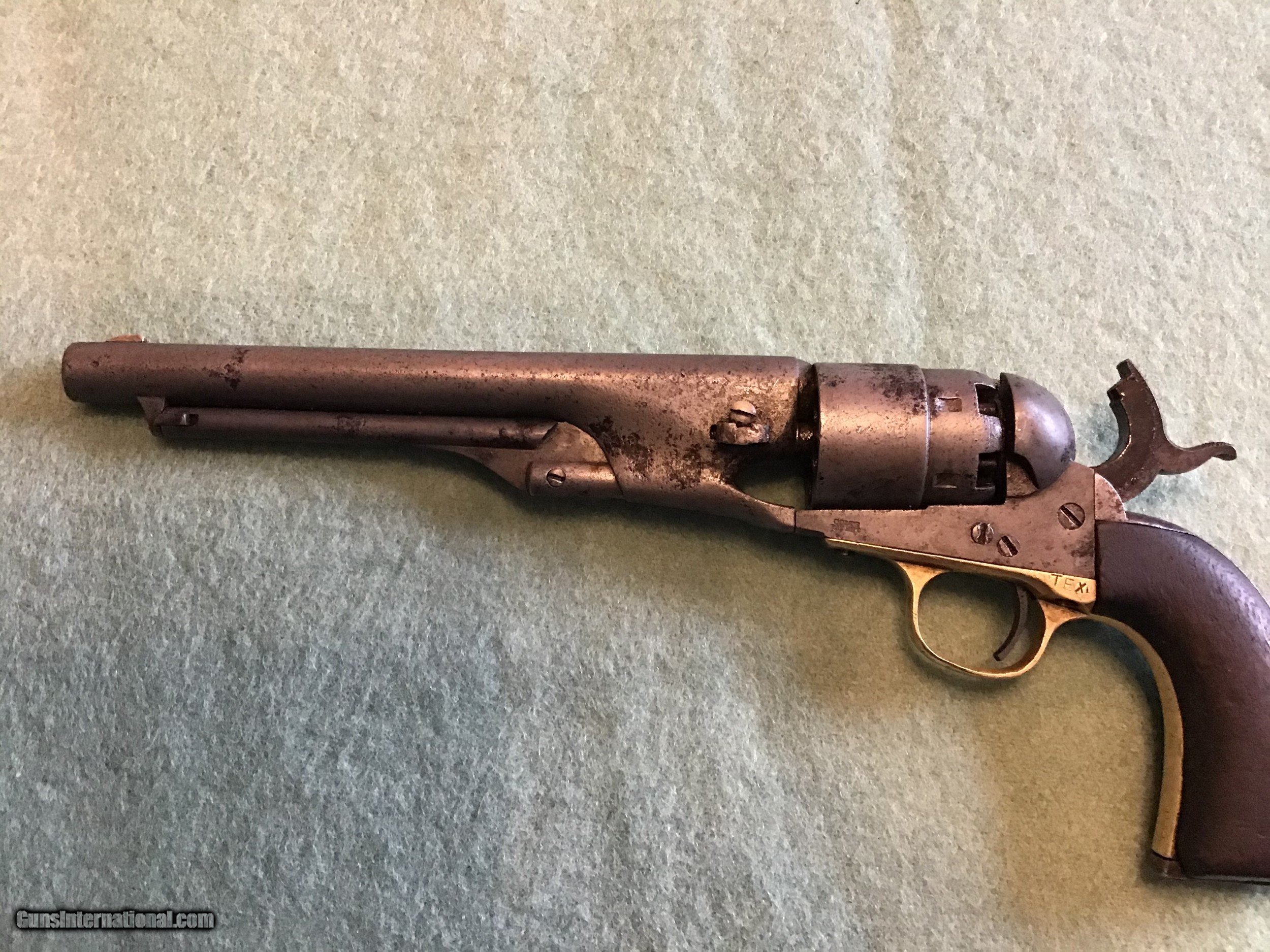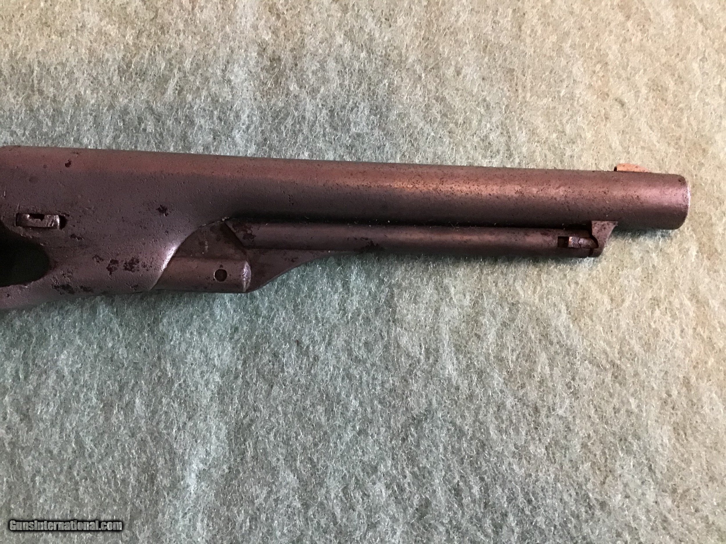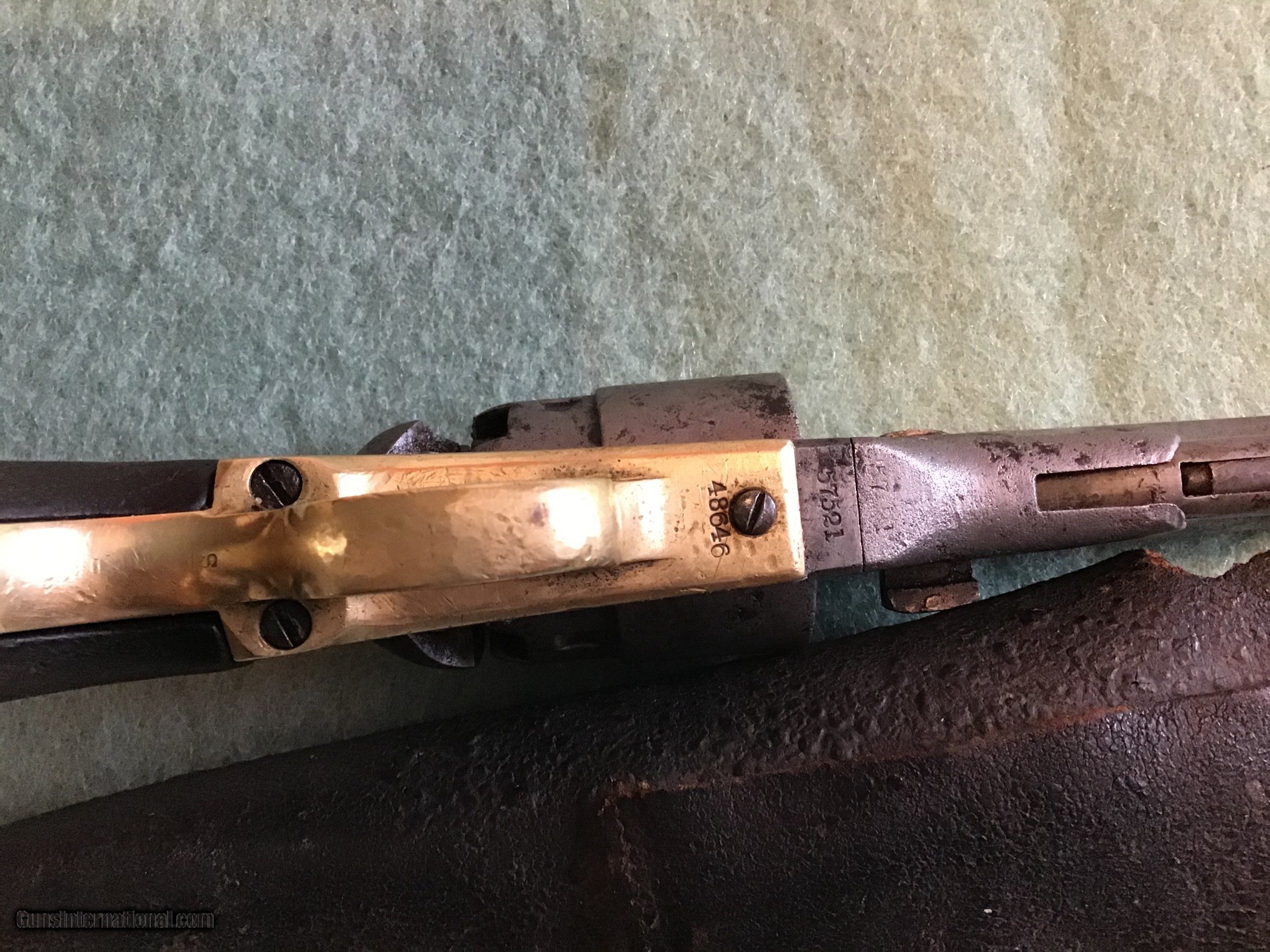 Description: Model 1860 Colt Army civil war percussion 44 revolver with original holster (original holster is missing its flap) Serial number 48648 on the butt and trigger guard and 57521 on the barrel and frame. Colt address is visible on the top of the barrel and pat. info is partially visible on the cylinder and COLTS PATENT is visible on the side of the frame. Marked Tex. On one side and initial H.M. On the other side. There is also a faint inspector cartouche on the right grip. The iron frame and cylinder have been cleaned,now are mostly grey mixed with a little brown (no I didn't clean it) and scattered pitting. The cylinder turns and locks as it should. All nipples are present and in good condition. The gun is tight and seems to function as it should. A good operating example of a historic firearm. Priority mail shipping should be around $25.00. Please feel free to call me if you have any questions 218-839-9272 or chriskobberdahl2gmail. SALE PENDING SOLD SOLD Antique: Yes Manufacturer: Colt Model: 1860 Army Serial Number: 48646/57522 Barrel Length: 8” Caliber Info: 44 Condition: Good Metal Condition: Good Wood Condition: Good Bore Condition: Good |