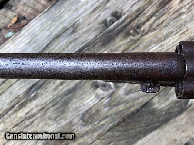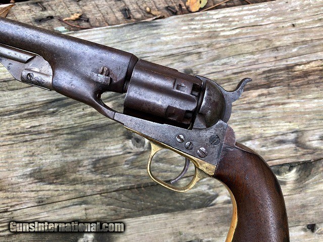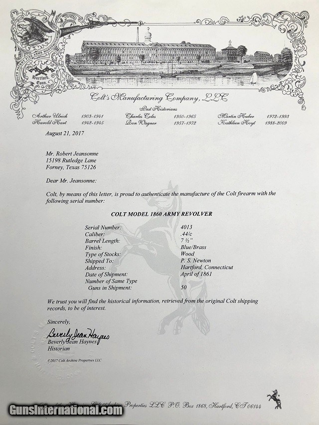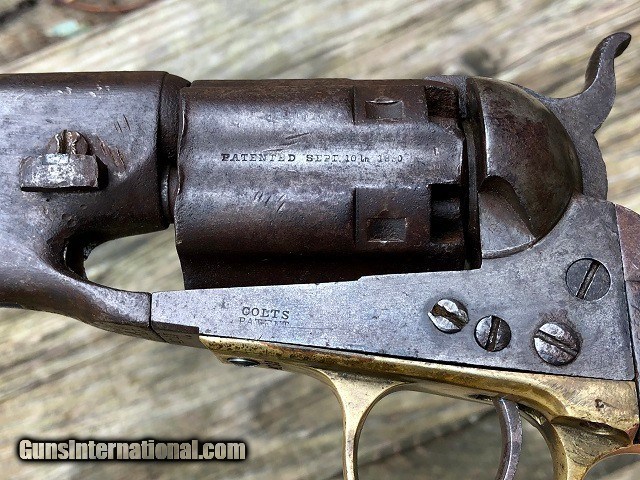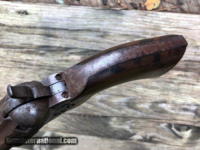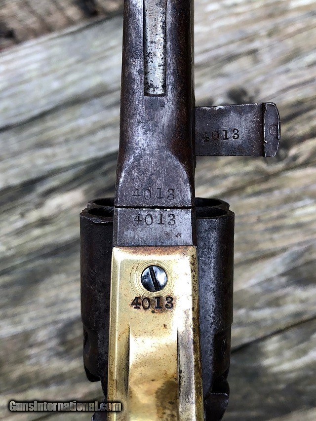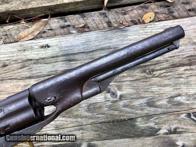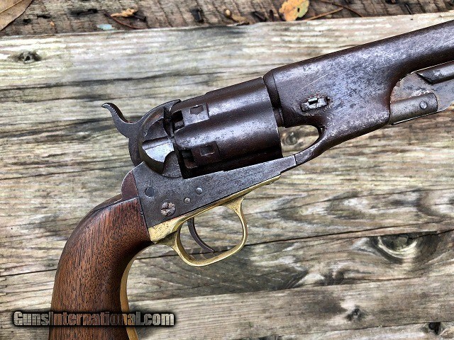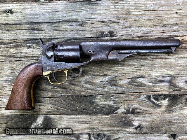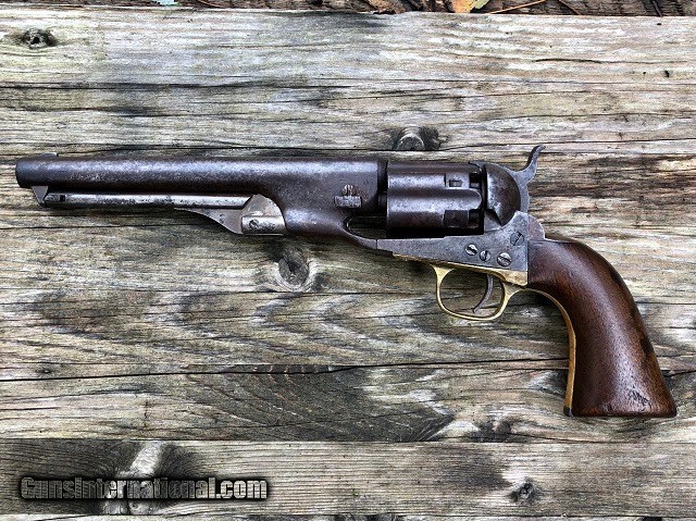 Description: Jeremiah Johnson Trading is one of the most experienced and trusted dealers of antique arms with over 40 years of collecting. We also specialize in antique cars & petroliana, Revolutionary and Civil War artifacts, 19th century nautical & western memorabilia, early Bowie and folding knives, American folk art, and colonial era furnishings. Visit us online at JeremiahJohnsonTrading or find us on Facebook. Our shop is located at 1618 Saybrook Rd. Haddam, CT. Look for the gold '55 Chevy road sign! ~Trades and offers are always considered~ Rare & Desirable Civil War M1860 Colt Fluted Army "Cavalry" Model Percussion Revolver with Factory Letter, .44 Cal, mfg. 1861 with 7 1/2" barrel. These early production fluted Army revolvers, or "Cavalry" Models as Colt called them due to their lightweight design, are among the most sought after and prized Colt pistols of the American Civil War. Only about 4,000 were manufactured with half being shipped to Southern destinations just prior to and during the outbreak of war. Because of this the fluted Army is recognized as a secondary Confederate arm. This example was not shipped South but does have an interesting history. It was part of a 50 gun shipment in April 1861 to P. S. Newton in Hartford, Connecticut. Newton operated a gun shop right down the road from Colt's factory where he both manufactured and retailed arms. As far as my research shows this was the only shipment of fluted Armys he received and given the date of shipment it is very possible that a soldier going off to war would have bought the gun. It should also be noted that this gun was ordered with the scarce 7 1/2" barrel as opposed to the 8" length which became standard throughout the remainder of production. The pistol remains in very nice original condition with matching serial numbers on the frame, barrel, cylinder, backstrap, triggerguard, cylinder pin, and wedge. The numbers on the cylinder are stamped on the rear face and are very faint but legible. The metal has an even plum/blue patina throughout with light marring around the wedge and edges of the cylinder. The brass triggerguard shows a pleasing mellowed color. The original wood grips fit perfectly and have a smooth worn finish with slight rounding to the corners and the initials "JS" period carved into the butt. Correct four-screw frame with notch in the butt for mounting a shoulder stock. Original hammer, trigger, loading lever, and brass blade front sight. Some of the screws have been marred but most of not all appear original. Clear original serial numbers, "COLTS PATENT" frame marking, barrel address, and cylinder patent date. The action is strong and crisp and functions nicely. All nipples are clean originals. Very good bore with clean sharp rifling front to back and moderately scattered fine blackpowder frosting. Included is a Colt factory letter confirming the gun's configuration and shipment, a $300 value. Fluted Army revolvers are very difficult to acquire and are a crucial addition to any Civil War arms collection. A rare and fine example! Jeremiah Johnson Trading sells antique firearms manufactured prior to 1899 and muzzleloading blackpowder reproductions only. For the purpose of these conditions the term "antique firearm" will hence include muzzleloading blackpowder reproductions. Buyers must be 21 years of age or older and have no felony convictions to purchase antique firearms. Antique firearms do not require Federal licensing and may be shipped directly to the buyer with the following exceptions. No antique firearms will be shipped to Washington D. C. or any of the five boroughs of New York City or residents thereof. Some restrictions may apply to antique firearms shipped to California and will be noted in the item description if applicable. Any handgun (antique or muzzleloading blackpowder reproduction) shipped to New Jersey must ship to a licensed FFL holder. Any muzzleloading blackpowder reproduction rifle, shotgun, or handgun shipped to Illinois must ship to an FFL holder. No international sales of antique firearms which may fire conventional metallic cartridges or any reproductions regardless of ignition. Antique muzzleloaders, or antiques which fire obsolete cartridges, may be shipped internationally however it is the responsibility of the buyer to know and abide by their local laws and provide proof that the antique arm is legal to receive and own. Absolutely no sales of items containing antique ivory to New York, New Jersey, or California. No sales of bear parts to Alaska, California, Georgia, Kentucky, Massachusetts, Mississippi, Nebraska, New Jersey, North Dakota, South Dakota, Oklahoma, Oregon, Virginia, or West Virginia. Absolutely no international sales of knives or animal parts including items which contain antique ivory. Payment can be made by way of money order, banker's check, or personal check (Please allow 7-10 days for clearance on personal checks). Credit cards accepted for antique arms (no additional fees). If not satisfied with an item within 3 days of receiving it, simply return the item in the same condition as shipped for a full refund, minus return shipping costs. Cleaning, disassembly, or altering of a firearm in any way will void inspection privileges. Layaway may be allowed upon negotiation, but will void inspection privileges. Buyer pays actual shipping & insurance costs. Occasionally a post-1898 firearm from my personal collection may be sold under this account however it will be noted that any such transaction is a personal sale in no way affiliated with our business. Any such arm will be shipped to a licensed FFL or C&R holder in accordance with Federal law. All firearms are sold as collector's items and are not warranted safe for shooting. Please consult a competent gunsmith prior to shooting any firearm. Message or call with any questions about this firearm, or any of our other items at 860-873-1092 (office) or 860-345-2100 (shop). SOLD Antique: Yes Manufacturer: Colt 