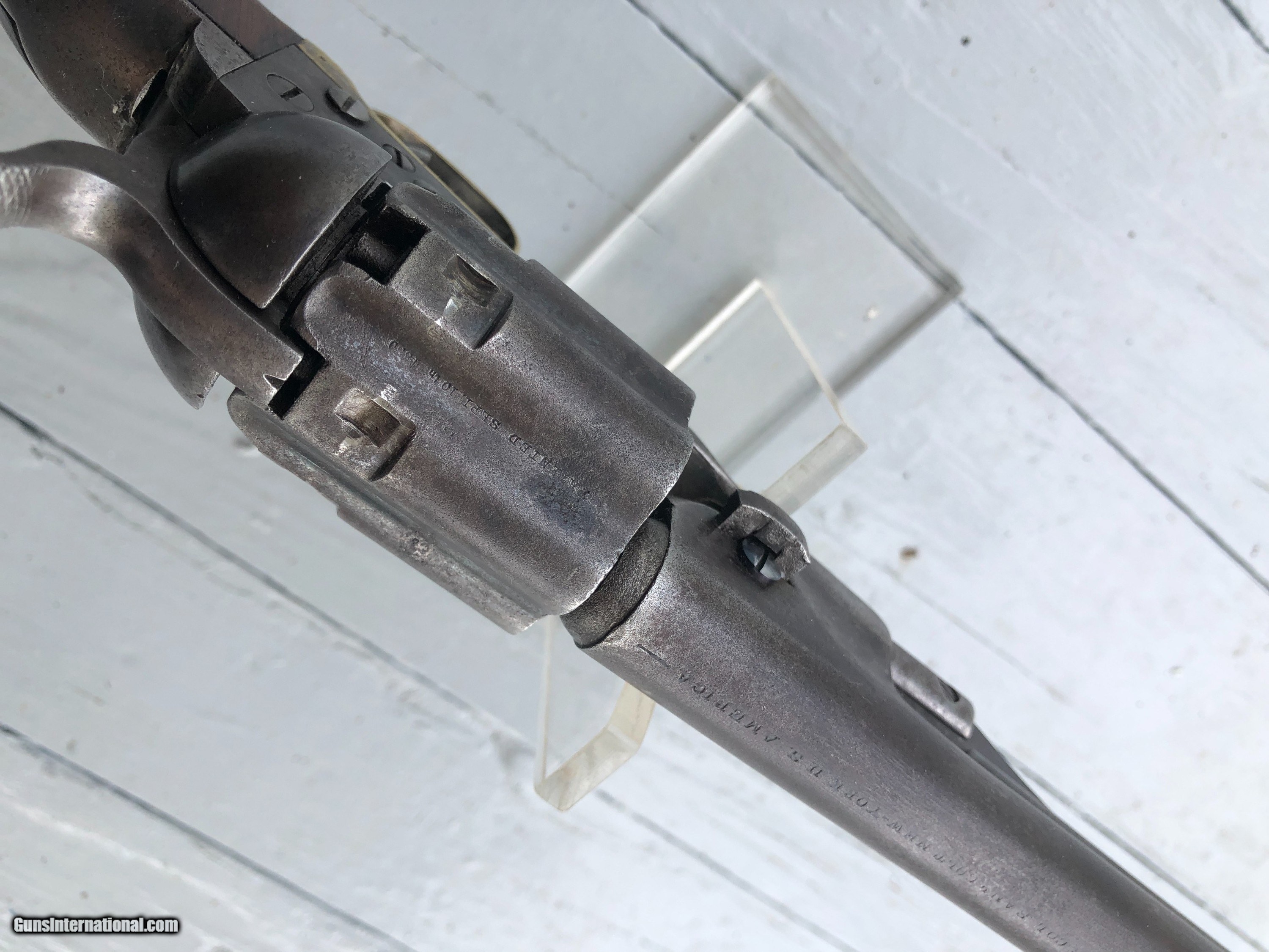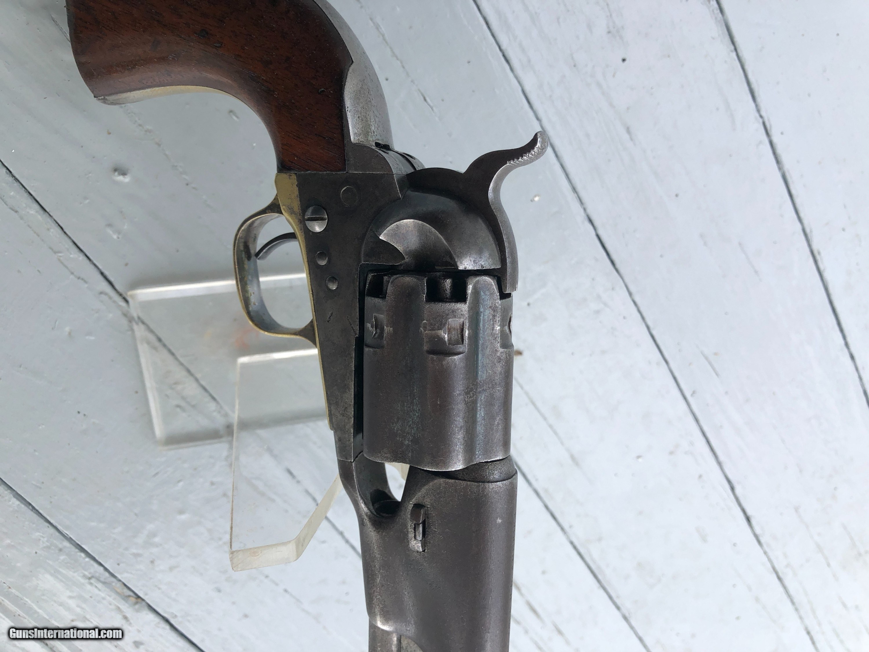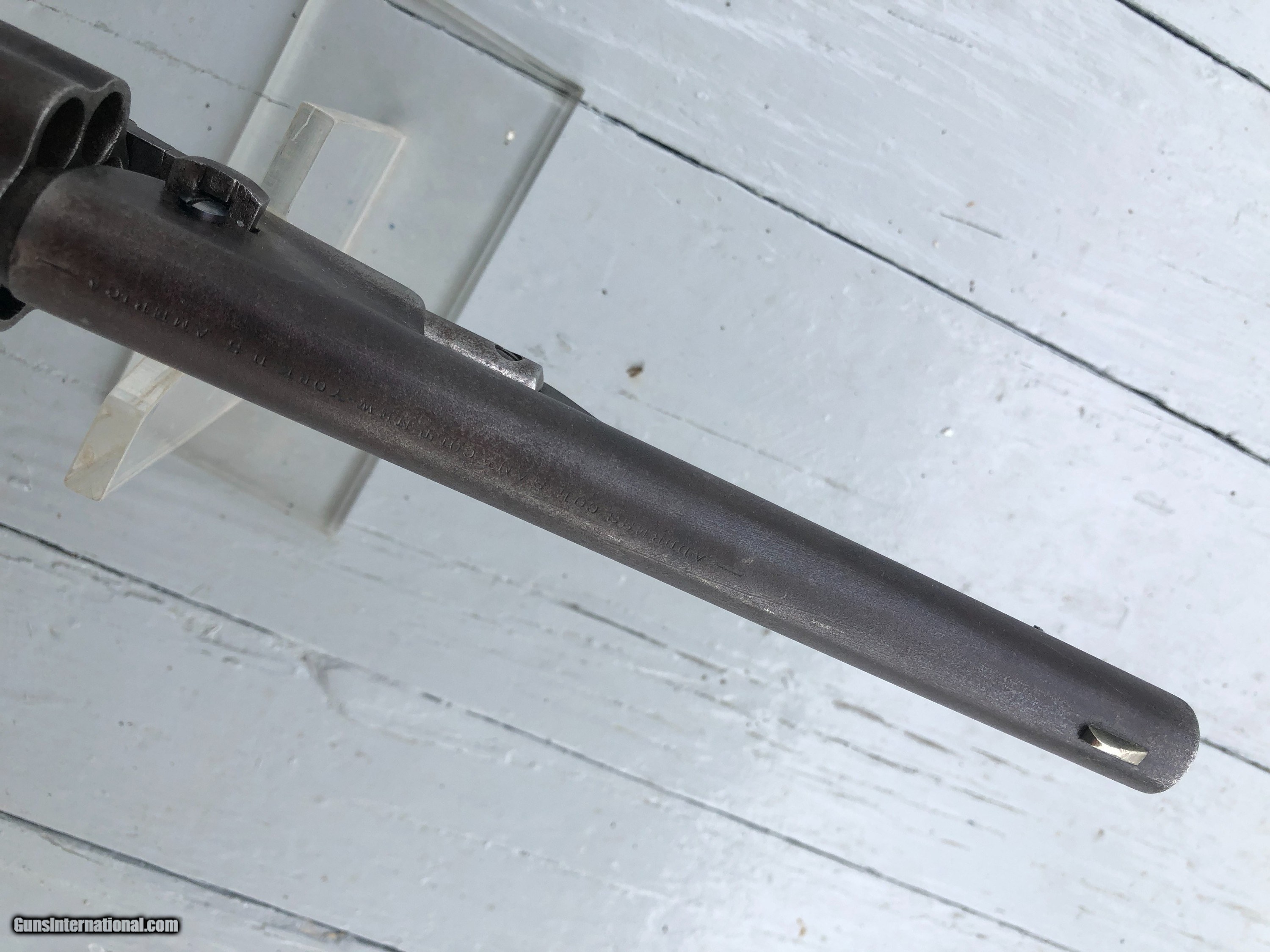 Description: This is a nice fluted army with some blue inside the flutes on the barrel and some under the barrel with factory letter. All matching including wedge and with tight action. The serial number on bottom of frame is weak and no doubt struck that way. Strong cylinder markings and nice marks on barrel. Serial #36xx. A nice fluted army with 5000 made and many blew up in service. SOLD Antique: Yes |