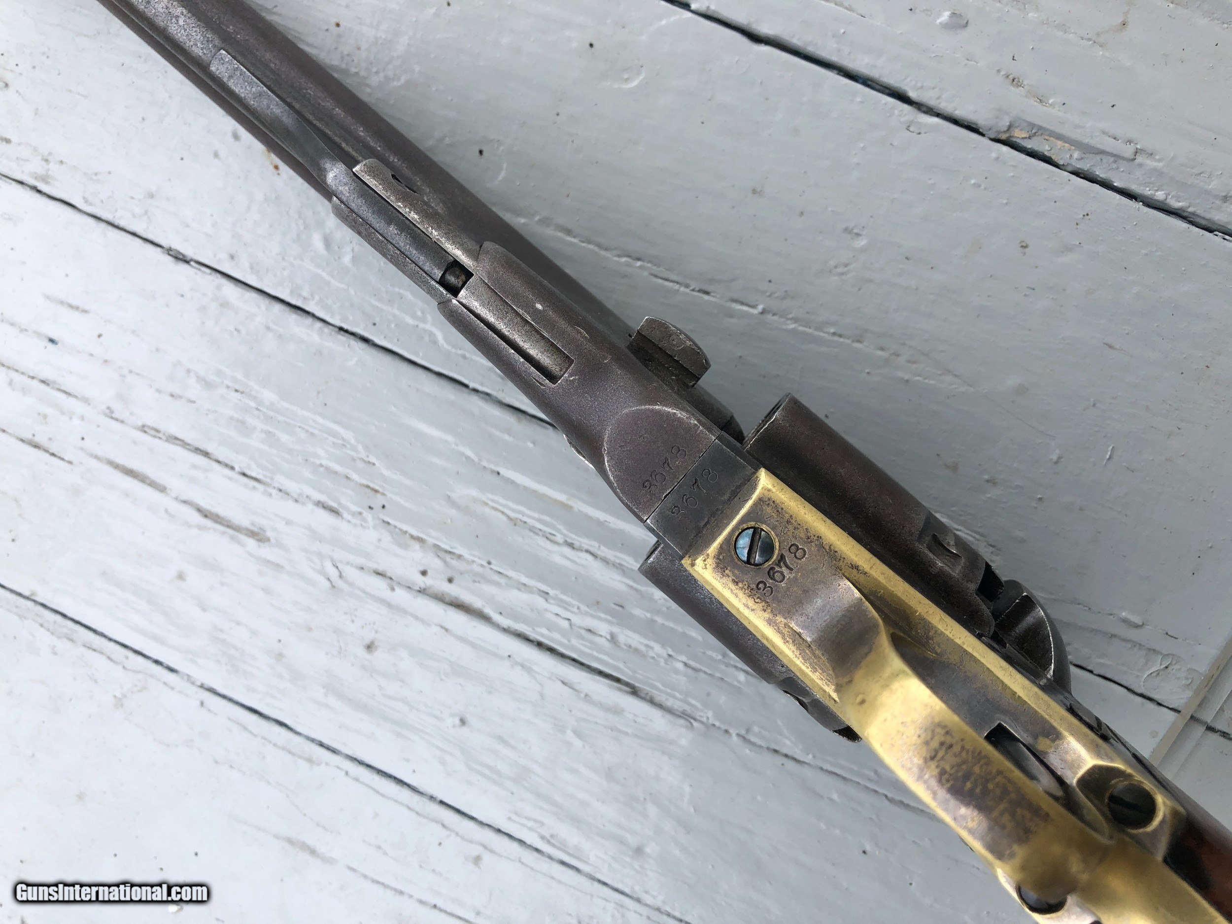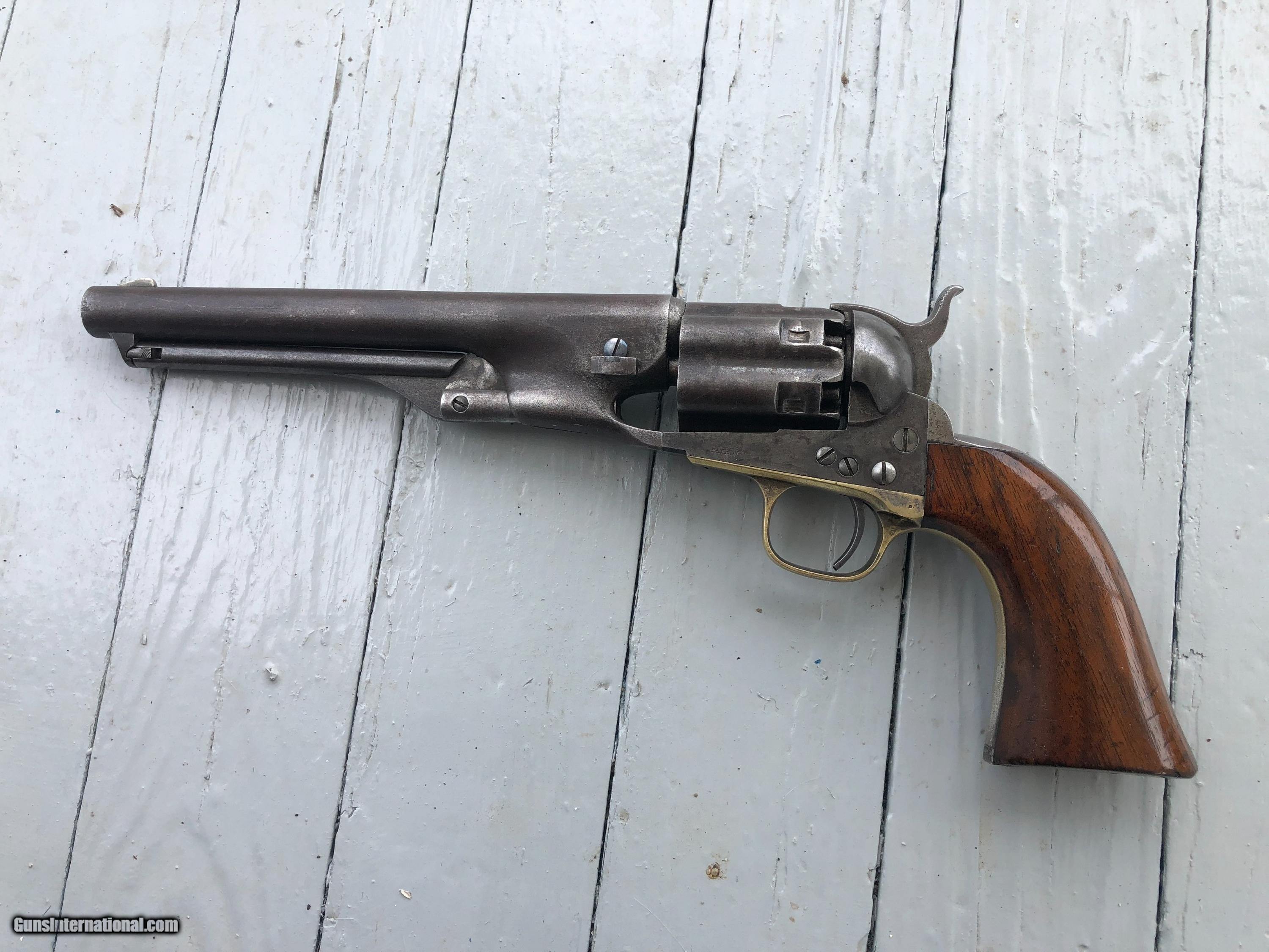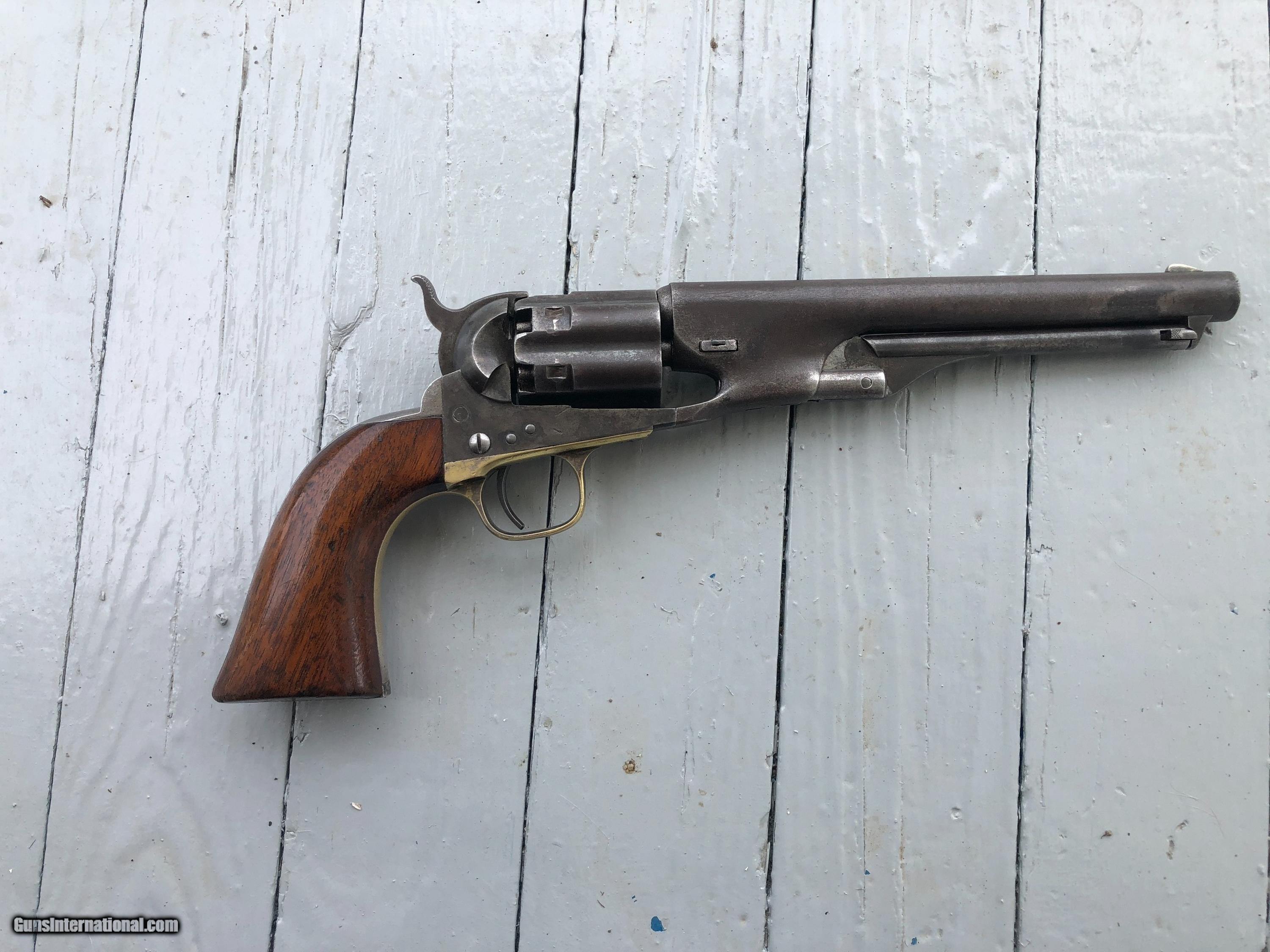 Description: This is a nice fluted army with some blue inside the flutes on the barrel and some under the barrel with factory letter. All matching including wedge and with tight action. The serial number on bottom of frame is weak and no doubt struck that way. Strong cylinder markings and nice marks on barrel. Serial #36xx. A nice fluted army with 5000 made and many blew up in service. SOLD Antique: Yes |