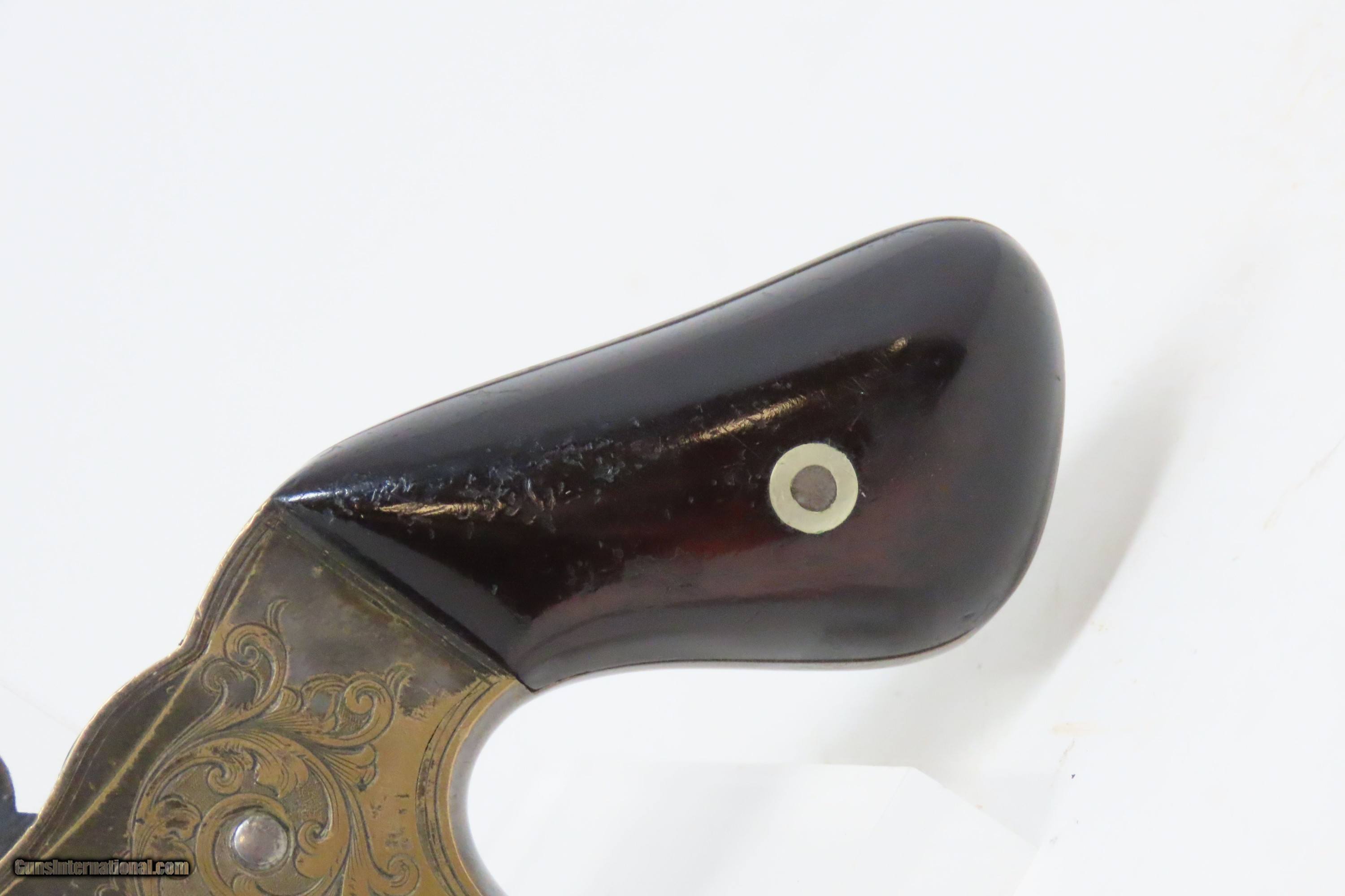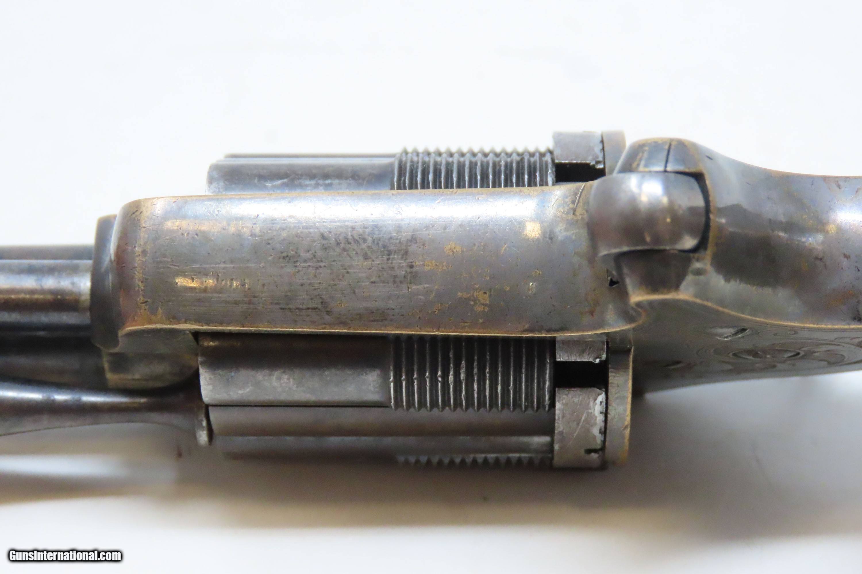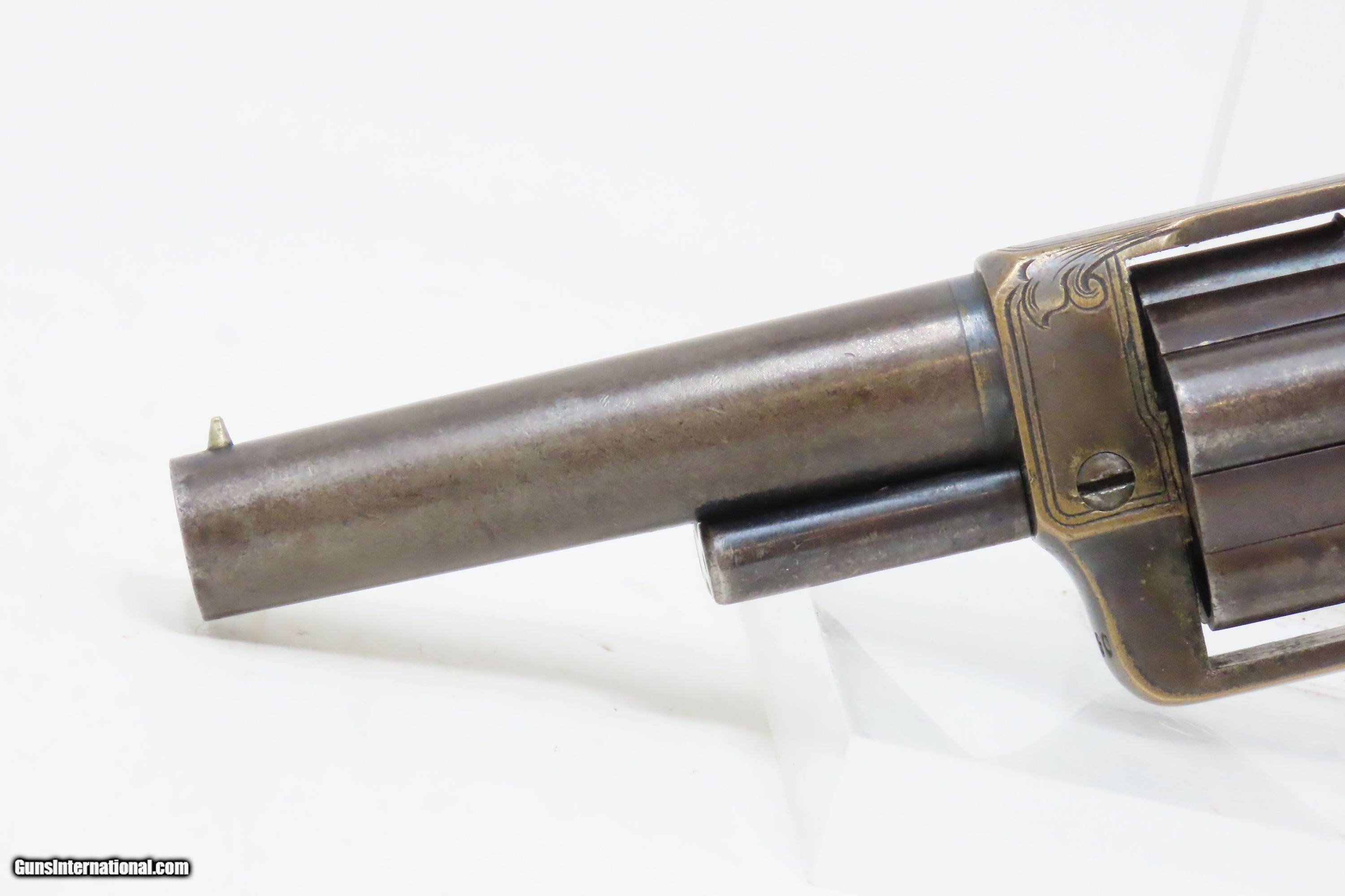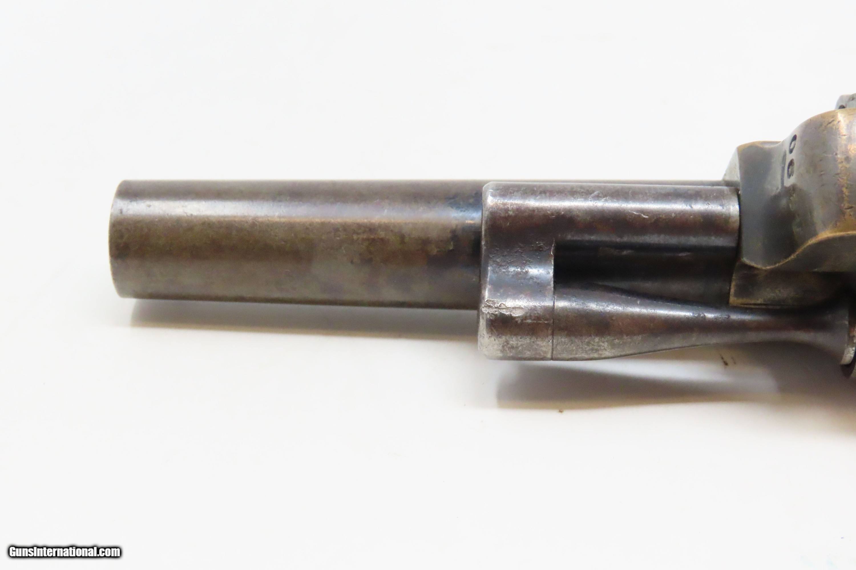 Description: 1863 CIVIL WAR Antique BROOKLYN Firearms SLOCUM Separate Chambers Revolver With Rollin White By-Passing Sliding Chambers Here we present an antique Brooklyn Arms Co. Slocum Patent Pocket Revolver, made circa 1863-64 in Brooklyn, New York. Only about 10,000 were produced. Firearms technology was rapidly advancing in the 19th Century with Colt introducing his revolver, and Smith & Wesson introducing the “bored through” cylinder that allowed revolvers to be used with metallic cartridges. This development was the intellectual property of an inventor by the name of Rollin White, a former Colt employee who took his idea to Samuel Colt himself, and was fired for his efforts. White found a buyer for his patent in Horace Smith and Daniel Wesson, giving their new company an enormous advantage for the next 12 years. However, with the Civil War in full fury and arms supply and manufacturing what it was, many different inventors, mechanics and manufacturers popped up to take advantage of the need for arms. Many makers of revolvers attempted to design and manufacture their own concept, but ended up violating the Rollin White Patent, for which Smith & Wesson and Rollin White aggressively sued. Other companies came up with creative solutions to navigate around the patent and some succeeded. This is one of those success stories, at least in the sense that a functional revolver was created to use metallic rimfire ammunition without violating the patent. Each chamber slides in its channel. Though this relatively small pocket revolver was no official armament of the Civil War, like so many others, plenty of them were carried into battle by soldiers who purchased them privately. This revolver features nice factory scroll engraving. The top of the barrel reads “B.A. CO. PATENT APRIL 14 1863”. The overall condition is fine. Original blue and silver finish have been preserved. The action is strong, but one cylinder does not properly lock up. Bright, rifled bore. Sharp markings. Both grips are in very good shape with less than average handling wear. Here is a very unique Civil War-era revolver, one that survived the scrutiny of the Rollin White Patent! Own the original! This is a legitimate antique and not a reproduction. Barrel is 3 inches. Caliber: .32 Rimfire Overall condition as seen in photos. Very Fast. Very Safe. FREE SHIPPING WORLDWIDE. Delivered directly to your door by express mail! Guaranteed AUTHENTIC & Includes CERTIFICATE OF AUTHENTICITY. ancestryguns $1800 #233649 SOLD Antique: Yes |