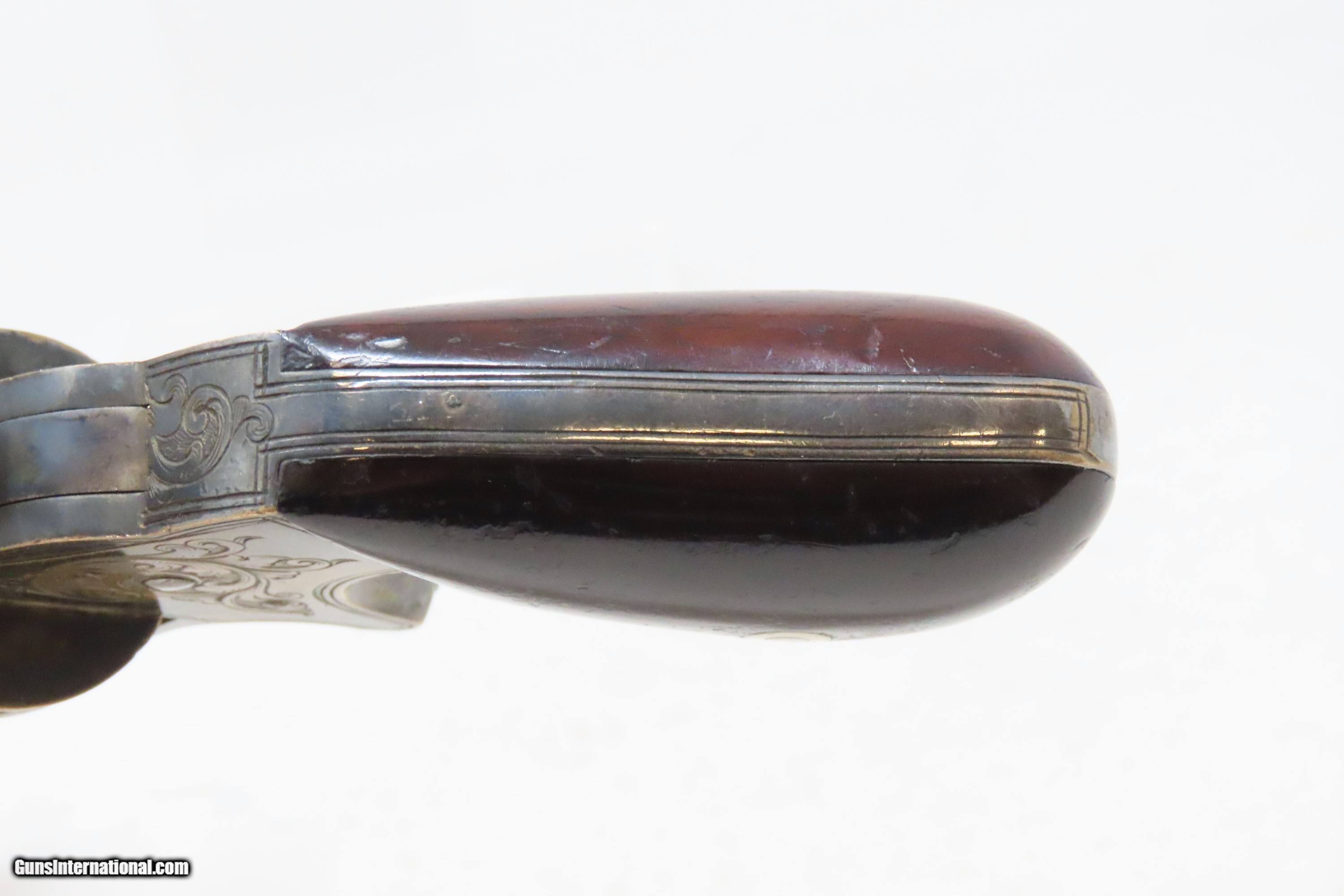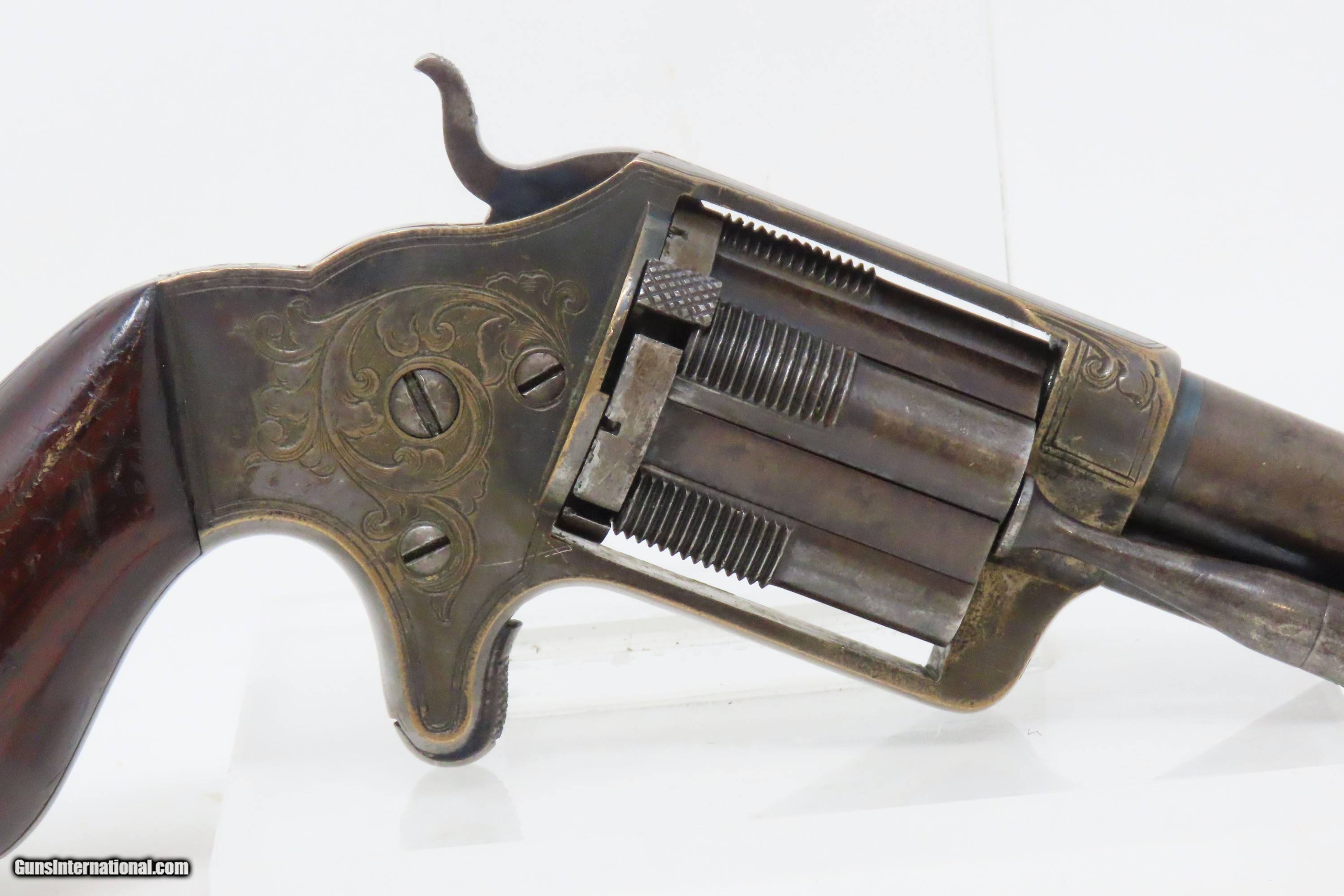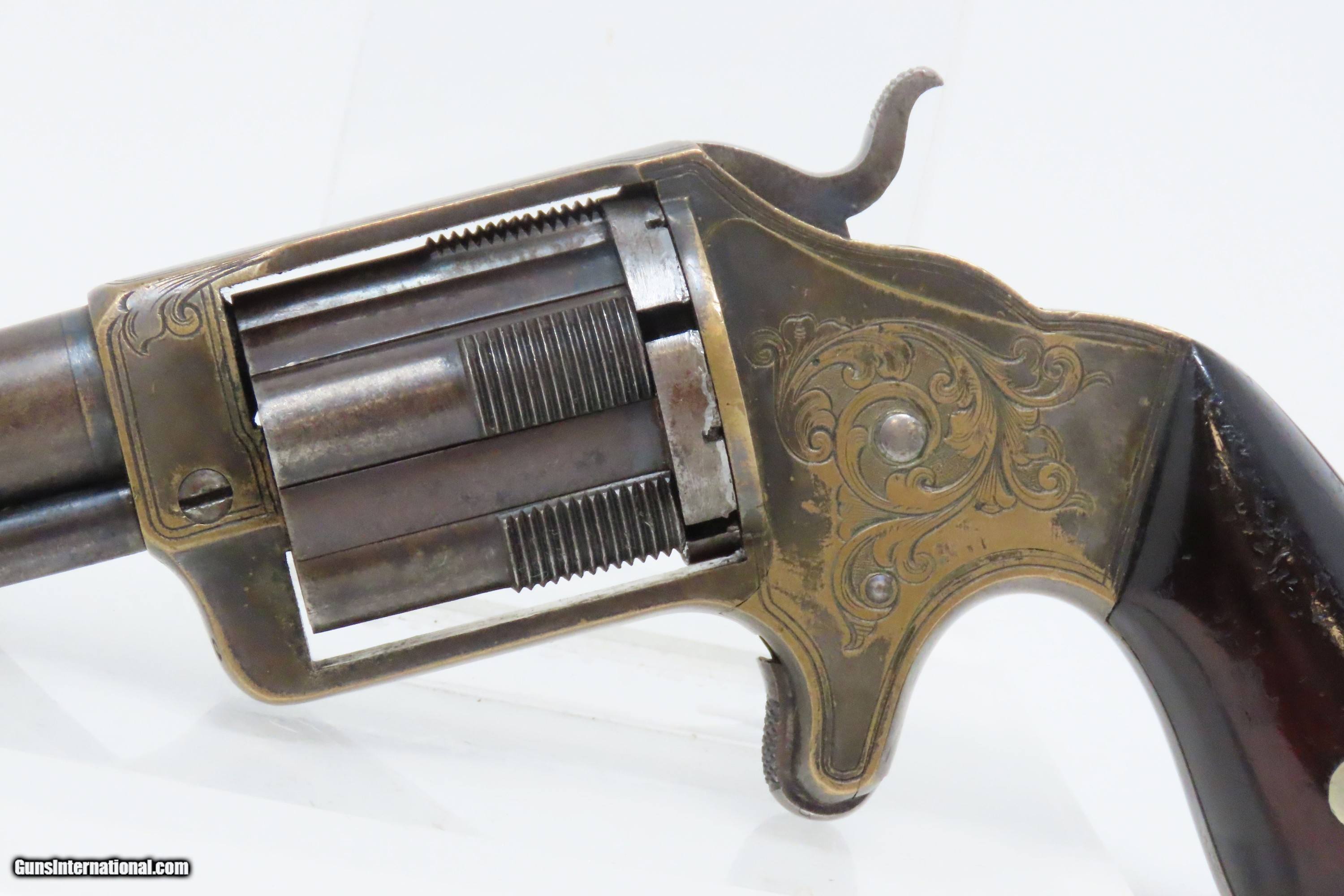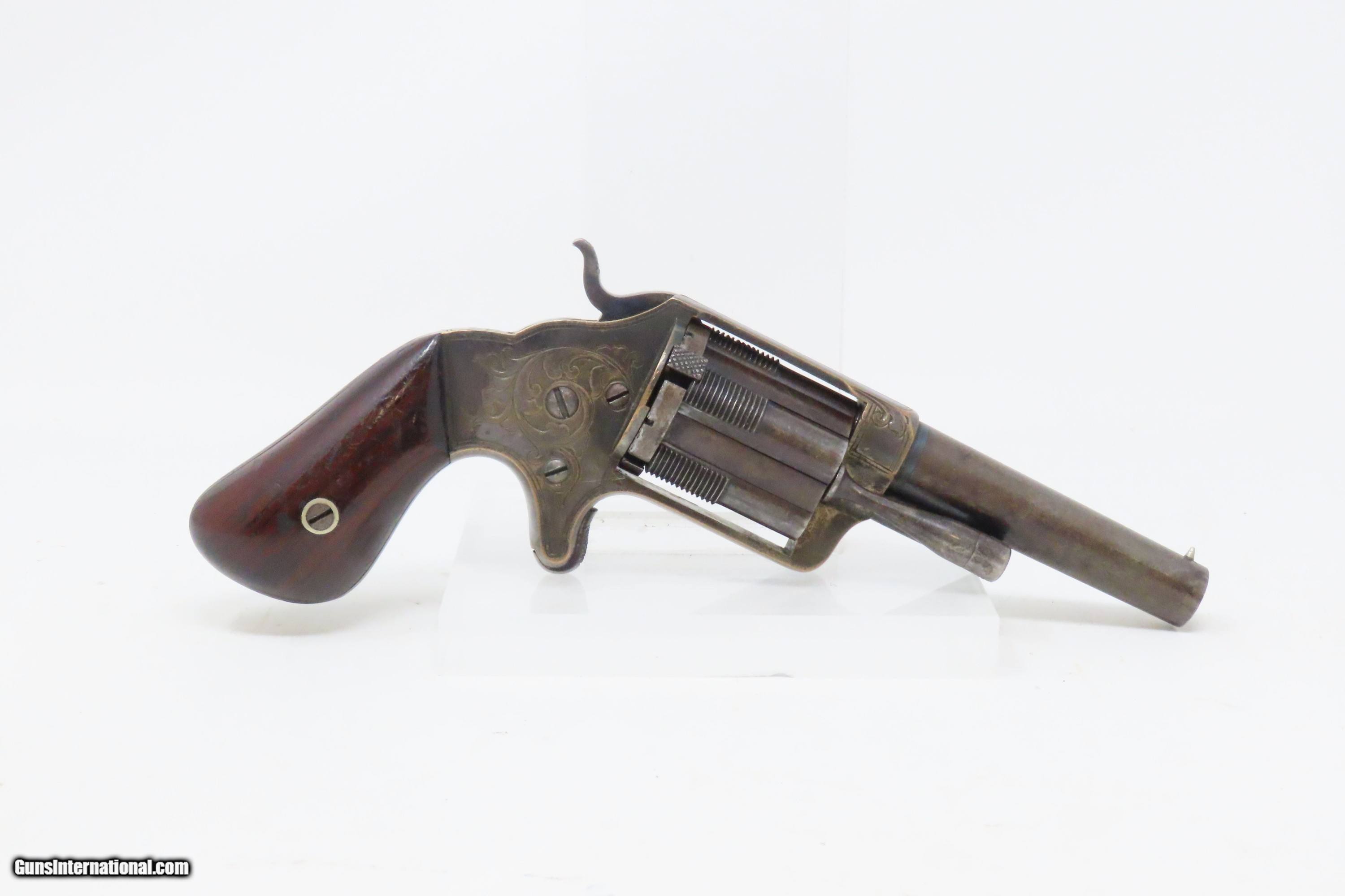 Description: 1863 CIVIL WAR Antique BROOKLYN Firearms SLOCUM Separate Chambers Revolver With Rollin White By-Passing Sliding Chambers Here we present an antique Brooklyn Arms Co. Slocum Patent Pocket Revolver, made circa 1863-64 in Brooklyn, New York. Only about 10,000 were produced. Firearms technology was rapidly advancing in the 19th Century with Colt introducing his revolver, and Smith & Wesson introducing the “bored through” cylinder that allowed revolvers to be used with metallic cartridges. This development was the intellectual property of an inventor by the name of Rollin White, a former Colt employee who took his idea to Samuel Colt himself, and was fired for his efforts. White found a buyer for his patent in Horace Smith and Daniel Wesson, giving their new company an enormous advantage for the next 12 years. However, with the Civil War in full fury and arms supply and manufacturing what it was, many different inventors, mechanics and manufacturers popped up to take advantage of the need for arms. Many makers of revolvers attempted to design and manufacture their own concept, but ended up violating the Rollin White Patent, for which Smith & Wesson and Rollin White aggressively sued. Other companies came up with creative solutions to navigate around the patent and some succeeded. This is one of those success stories, at least in the sense that a functional revolver was created to use metallic rimfire ammunition without violating the patent. Each chamber slides in its channel. Though this relatively small pocket revolver was no official armament of the Civil War, like so many others, plenty of them were carried into battle by soldiers who purchased them privately. This revolver features nice factory scroll engraving. The top of the barrel reads “B.A. CO. PATENT APRIL 14 1863”. The overall condition is fine. Original blue and silver finish have been preserved. The action is strong, but one cylinder does not properly lock up. Bright, rifled bore. Sharp markings. Both grips are in very good shape with less than average handling wear. Here is a very unique Civil War-era revolver, one that survived the scrutiny of the Rollin White Patent! Own the original! This is a legitimate antique and not a reproduction. Barrel is 3 inches. Caliber: .32 Rimfire Overall condition as seen in photos. Very Fast. Very Safe. FREE SHIPPING WORLDWIDE. Delivered directly to your door by express mail! Guaranteed AUTHENTIC & Includes CERTIFICATE OF AUTHENTICITY. ancestryguns $1800 #233649 SOLD Antique: Yes |
