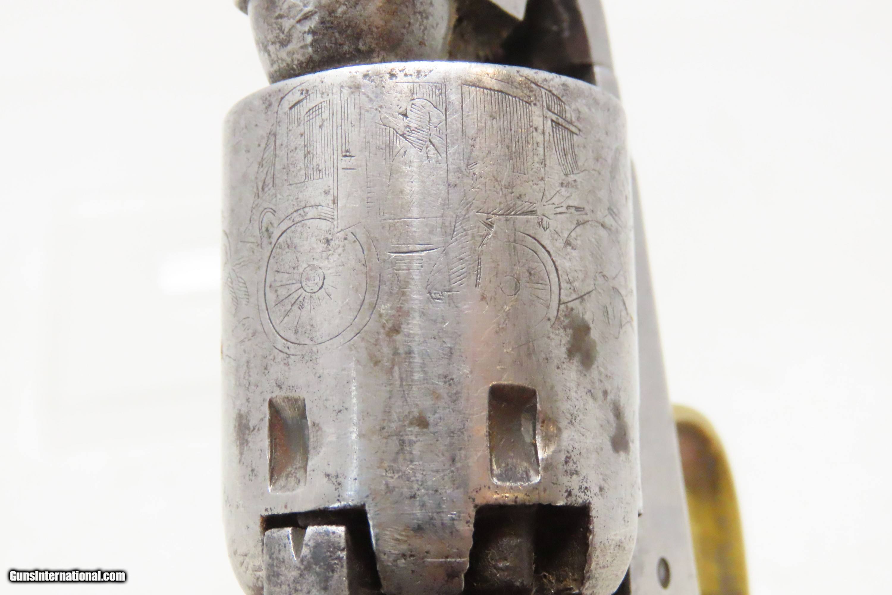 Description: 1863 COLT Antique CIVIL WAR Percussion M1849 POCKET w/HOLSTER & “CS” BUCKLE WILD WEST/FRONTIER Six-Shooter w/CARTRIDGE BOX RIG Here we present an antique Colt Model 1849 Percussion Pocket Revolver, made during the American Civil War in 1863 in Hartford, Connecticut. The Model 1849 Pocket, the replacement for the Baby Dragoon, was the most widely produced of any Colt percussion pistol. Nearly 340,000 were manufactured during its 23-year production run that ended in 1873. Over 280,000 of these were produced by Colt’s factory at Hartford by the end of the Civil War in 1865. These were very popular and saw a lot of use on the battlefield, on the home front and in the West. These were some of the smallest, handiest pocket revolvers of the time. One of the most aesthetically pleasing aspects of this pistol is its cylinder scene. Cylinder scenes during this period were common, especially for Colt, not only for their visual appeal, but because it made a revolver more difficult to forge. The scene on the 1849 Pocket is that of a stagecoach robbery. The focal point is the stagecoach drawn by four horses. A woman in a dress is seen framed in the doorway of the side of the coach. The driver is standing alongside wielding his pistol against multiple assailants as the horses rear and struggle against their harnesses. Several of the bandits lay dying on the ground, one tries to control the horses, two are running away and one is in the process of falling dead after being shot. Not a bad way to show interested buyers what a pistol like this would be good for. It did a fine job as a self-defense handgun for the average citizen in 19th Century America. Though not a primary military arm during the American Civil War, these handguns were commonly privately purchased by soldiers for use on the battlefield. Whether legend or fact, it is interesting to note something commonly read about pocket revolvers of the day, that while they could be used for self-defense against the enemy, many soldiers kept them on their person to defend themselves against an unwanted amputation in the primitive field hospitals that were notorious, even in their day. The overall condition is good. Much of the cylinder scene remains in tack. The action is excellent. The bore is in good shape with good rifling. The grip shows use and remains solid. The numbers match throughout. Comes in a modern holster and belt rig that remains in great shape. Own the original! This is a legitimate antique and not a reproduction. Barrel is 6 inches. Caliber: .31 Percussion Overall condition as seen in photos. Very Fast. Very Safe. FREE SHIPPING WORLDWIDE. Delivered directly to your door by express mail! Guaranteed AUTHENTIC & Includes CERTIFICATE OF AUTHENTICITY. ancestryguns $2200 #240095 SOLD Antique: Yes |