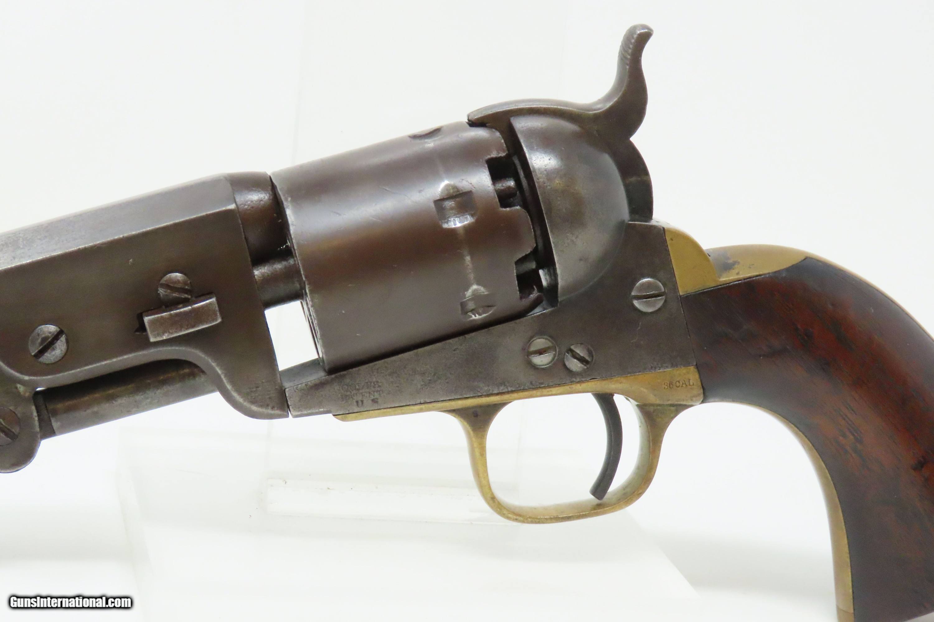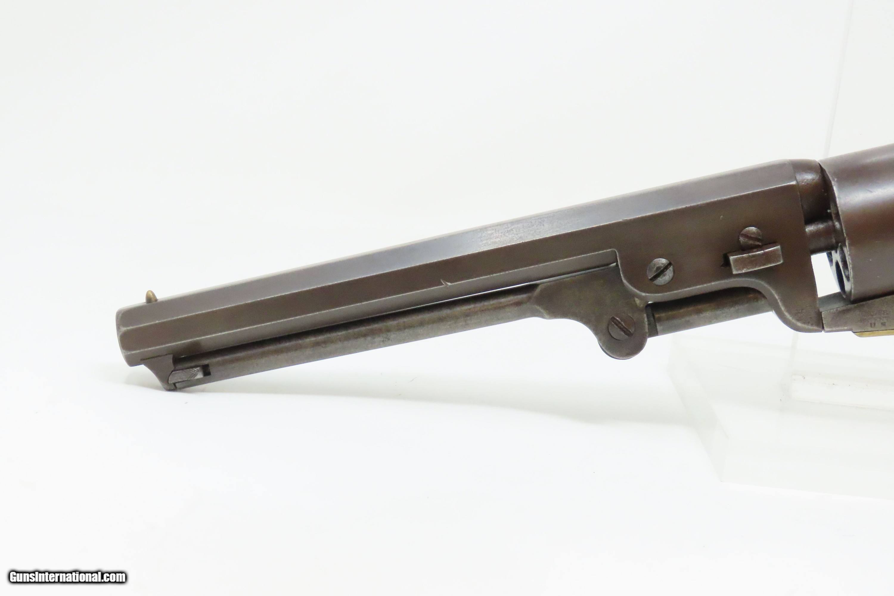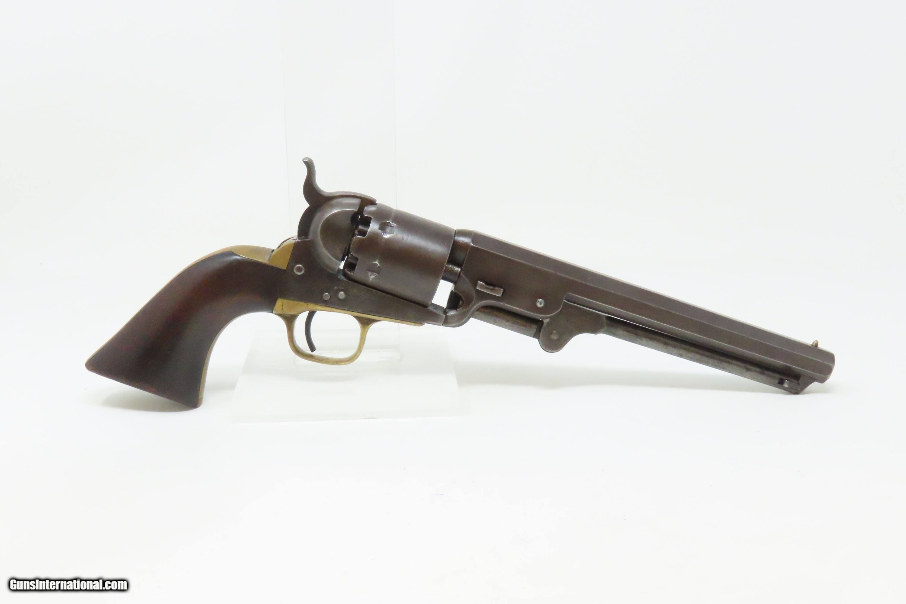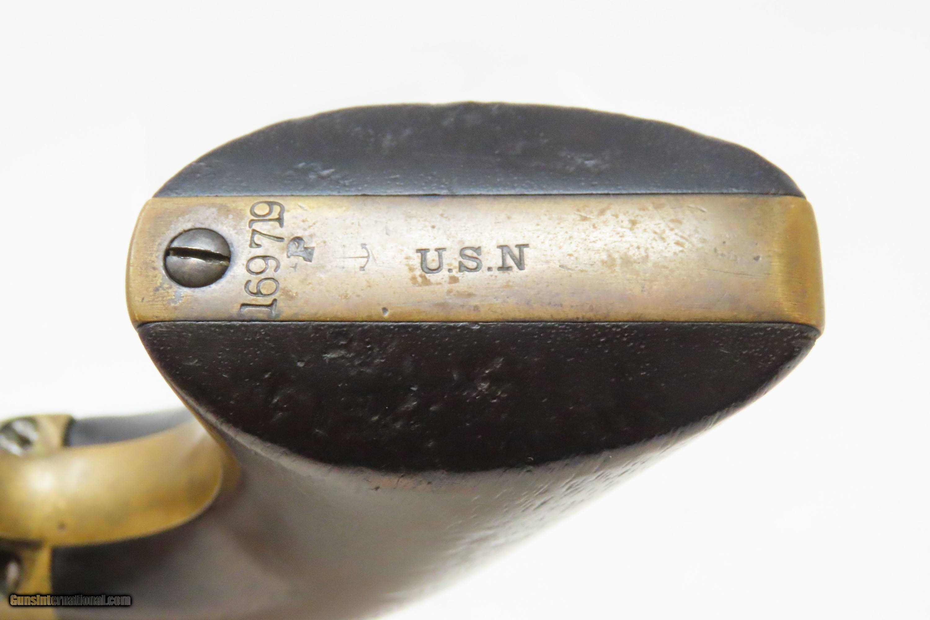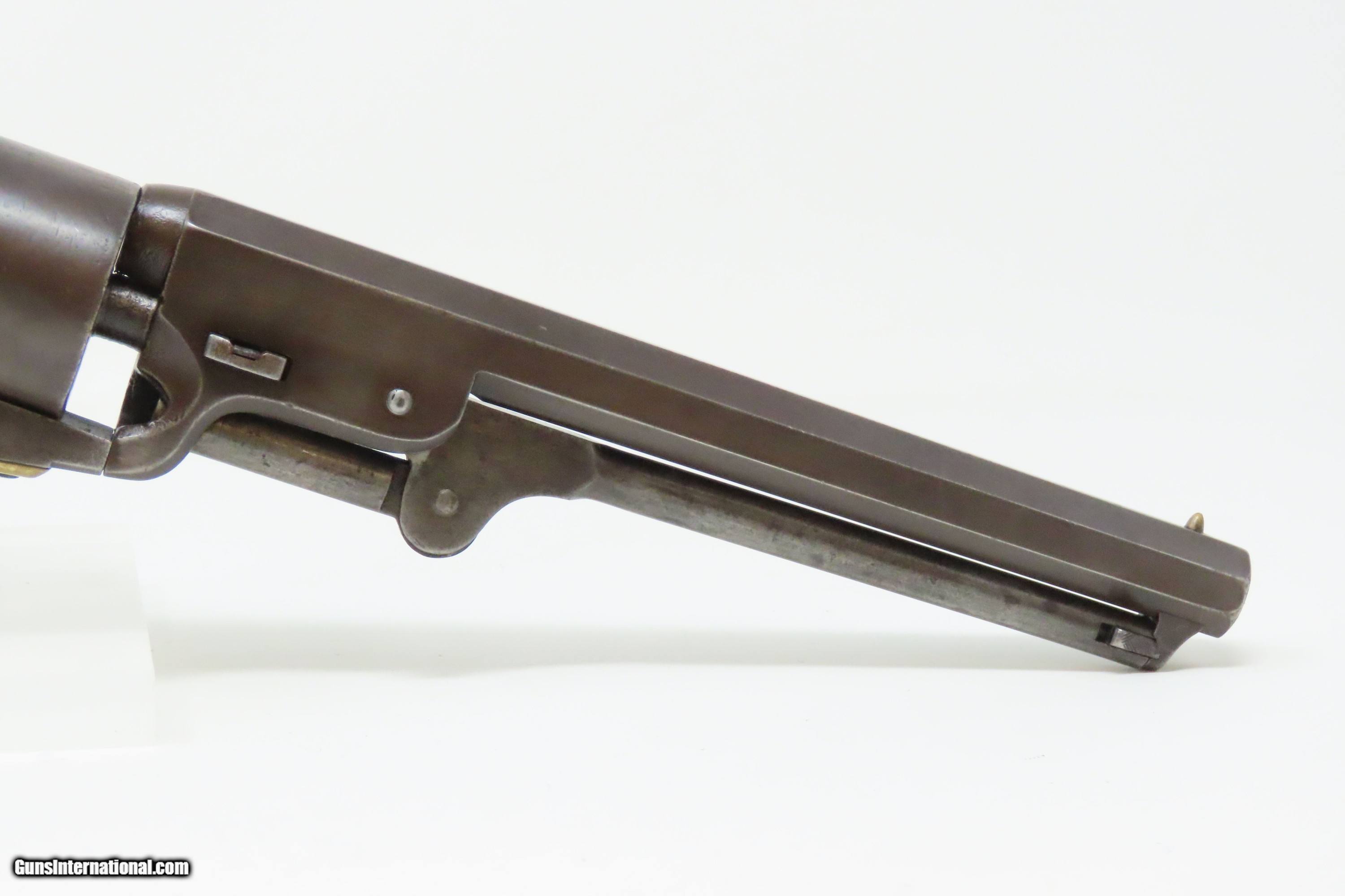 Description: 1863 mfr. CIVIL WAR Antique US NAVY COLT Model 1851 .36 Percussion Revolver With Inscription to Sailor Here we present an antique U.S. Navy Contract Colt Model 1851 Navy Revolver, made in the middle of the American Civil War in 1863 in Hartford, Connecticut. The 1851 Navy was one of Colt’s most famous and successful lines, reaching a production total of 257,348 from 1850 to 1873 (right up to the time of SAA production) from both Hartford and London factories. From Hartford alone, 185,000 were made by the end of the American Civil War. Many of these saw service during the conflict on both sides. There were some military purchases and lots of private purchases by soldiers going off to war. This is one of the “Navy” Navies—those acquired by the US (Union) government for wartime use during the American Civil War. An anchor and “U.S.N.” are on the butt, with “U.S.” stamped under the “COLT’S PATENT” marking on the side. In addition, this one has an inscription neatly engraved in thin script on the back of the brass grip frame which reads “2Nd. Asst. Eng. J.J. Sullivan U.S.N. N___ & W___”. The overall condition is good. This one wears an old refinish that has turned plum. The action is strong. The bore is dim with worn rifling. The grip is solid. Numbers match. Own the original! This is a legitimate antique and not a reproduction. Barrel is 7-1/2 inches. Caliber: .36 Percussion Overall condition as seen in photos. Very Fast. Very Safe. FREE SHIPPING WORLDWIDE. Delivered directly to your door by express mail! Guaranteed AUTHENTIC & Includes CERTIFICATE OF AUTHENTICITY. ancestryguns $3500 #244376 SOLD Antique: Yes |