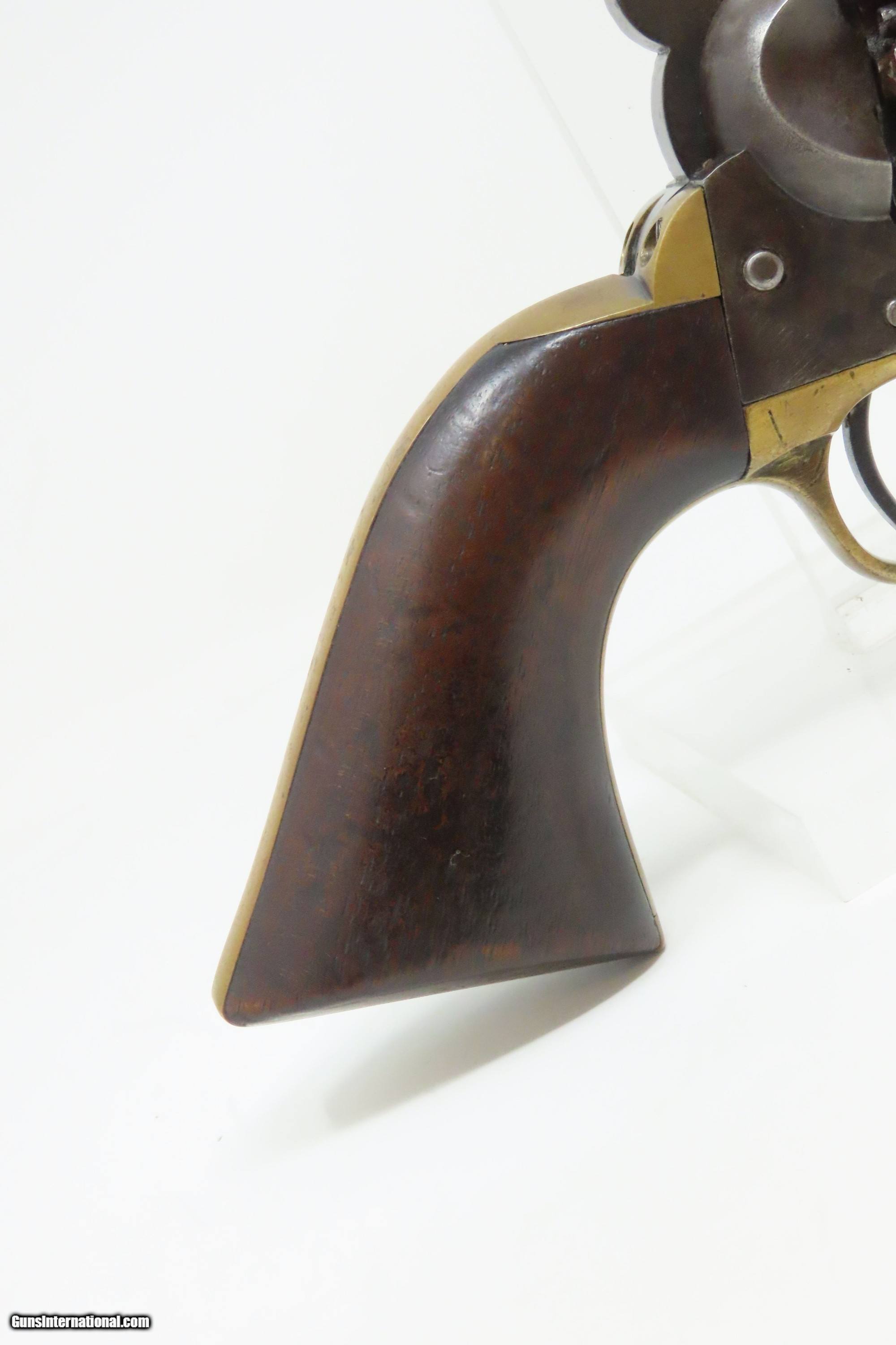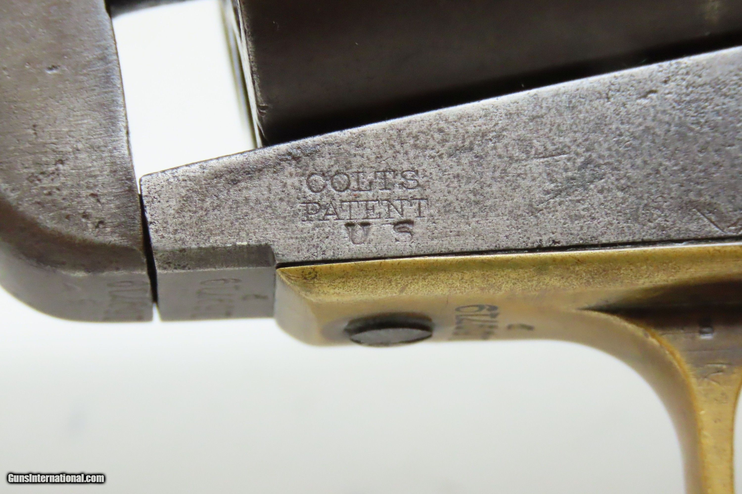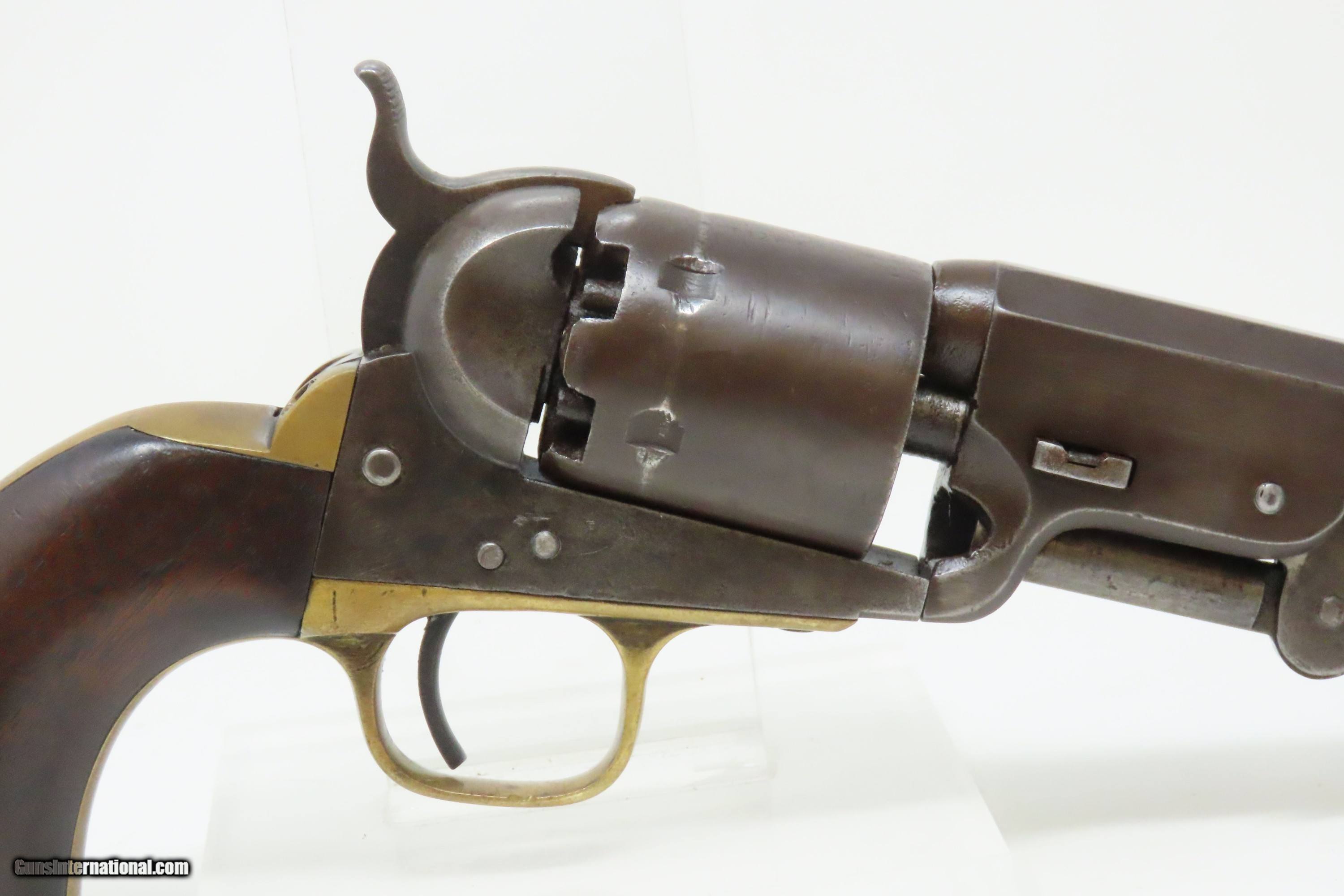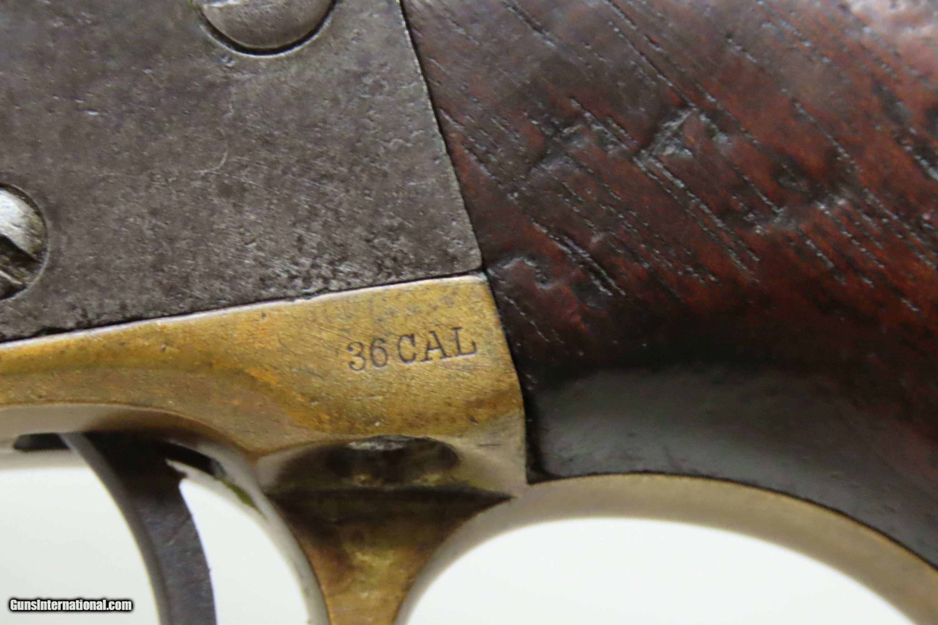 Description: 1863 mfr. CIVIL WAR Antique US NAVY COLT Model 1851 .36 Percussion Revolver With Inscription to Sailor Here we present an antique U.S. Navy Contract Colt Model 1851 Navy Revolver, made in the middle of the American Civil War in 1863 in Hartford, Connecticut. The 1851 Navy was one of Colt’s most famous and successful lines, reaching a production total of 257,348 from 1850 to 1873 (right up to the time of SAA production) from both Hartford and London factories. From Hartford alone, 185,000 were made by the end of the American Civil War. Many of these saw service during the conflict on both sides. There were some military purchases and lots of private purchases by soldiers going off to war. This is one of the “Navy” Navies—those acquired by the US (Union) government for wartime use during the American Civil War. An anchor and “U.S.N.” are on the butt, with “U.S.” stamped under the “COLT’S PATENT” marking on the side. In addition, this one has an inscription neatly engraved in thin script on the back of the brass grip frame which reads “2Nd. Asst. Eng. J.J. Sullivan U.S.N. N___ & W___”. The overall condition is good. This one wears an old refinish that has turned plum. The action is strong. The bore is dim with worn rifling. The grip is solid. Numbers match. Own the original! This is a legitimate antique and not a reproduction. Barrel is 7-1/2 inches. Caliber: .36 Percussion Overall condition as seen in photos. Very Fast. Very Safe. FREE SHIPPING WORLDWIDE. Delivered directly to your door by express mail! Guaranteed AUTHENTIC & Includes CERTIFICATE OF AUTHENTICITY. ancestryguns $3500 #244376 SOLD Antique: Yes |