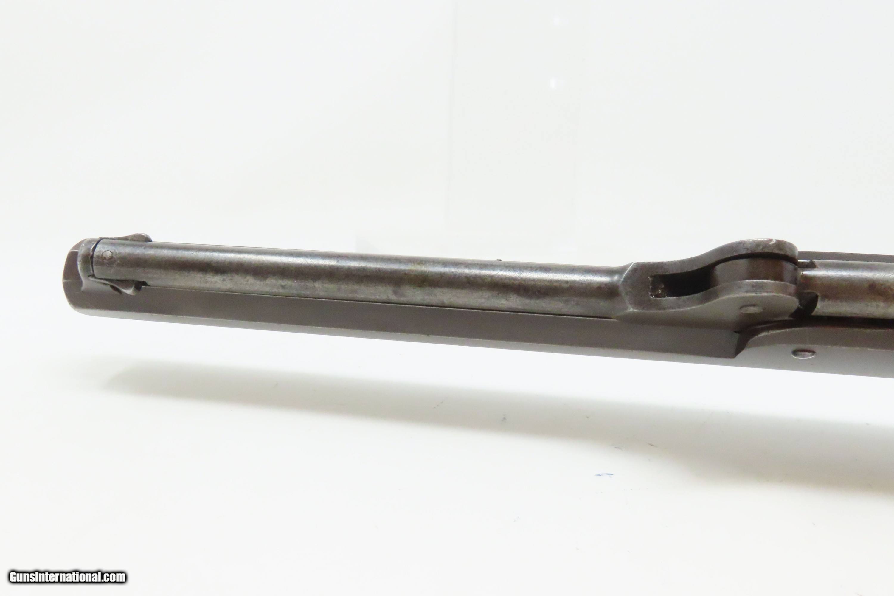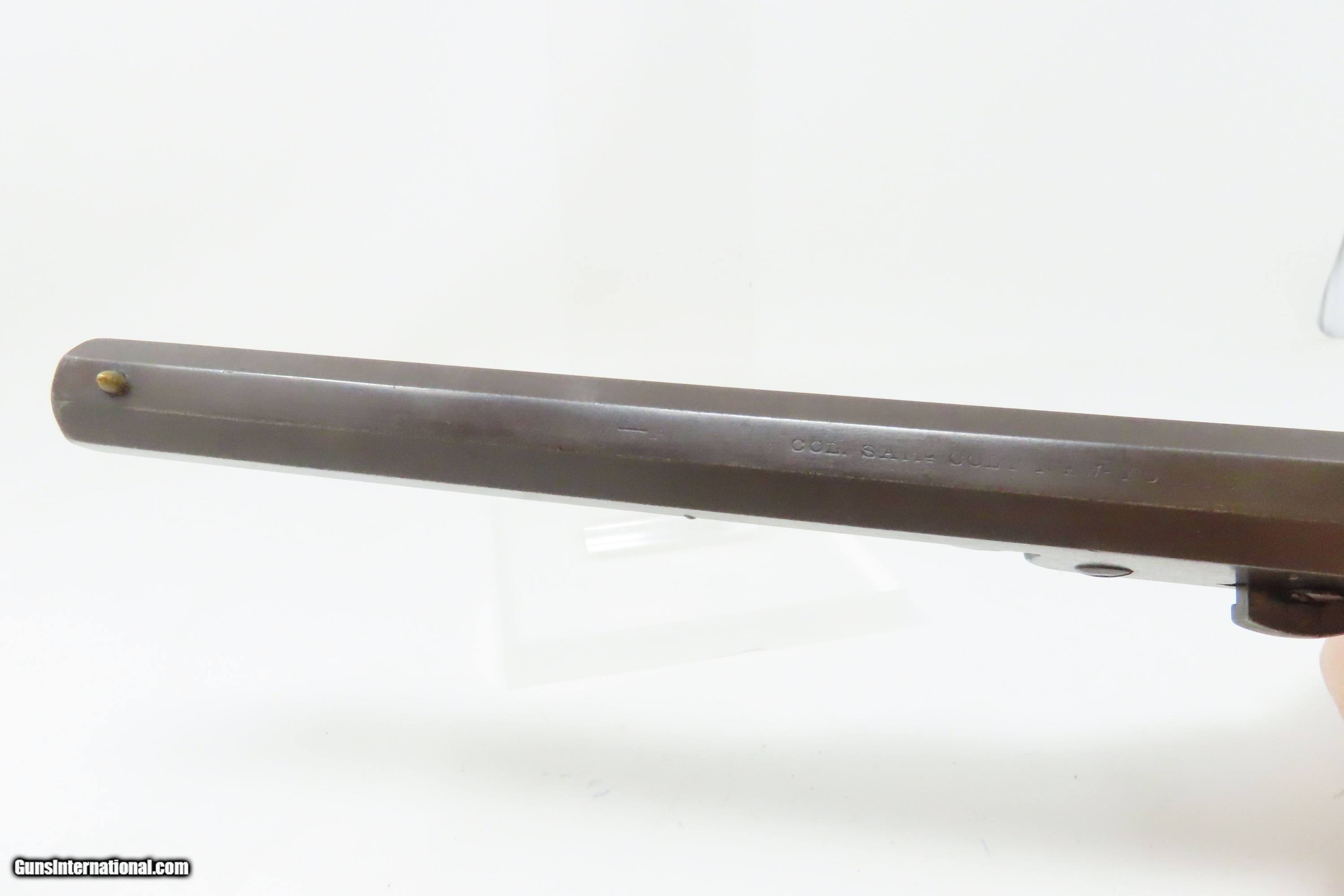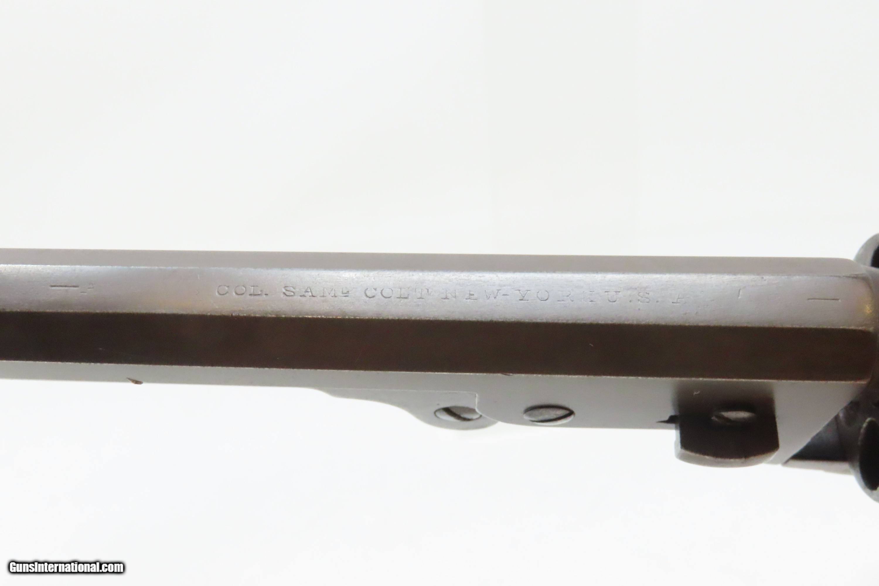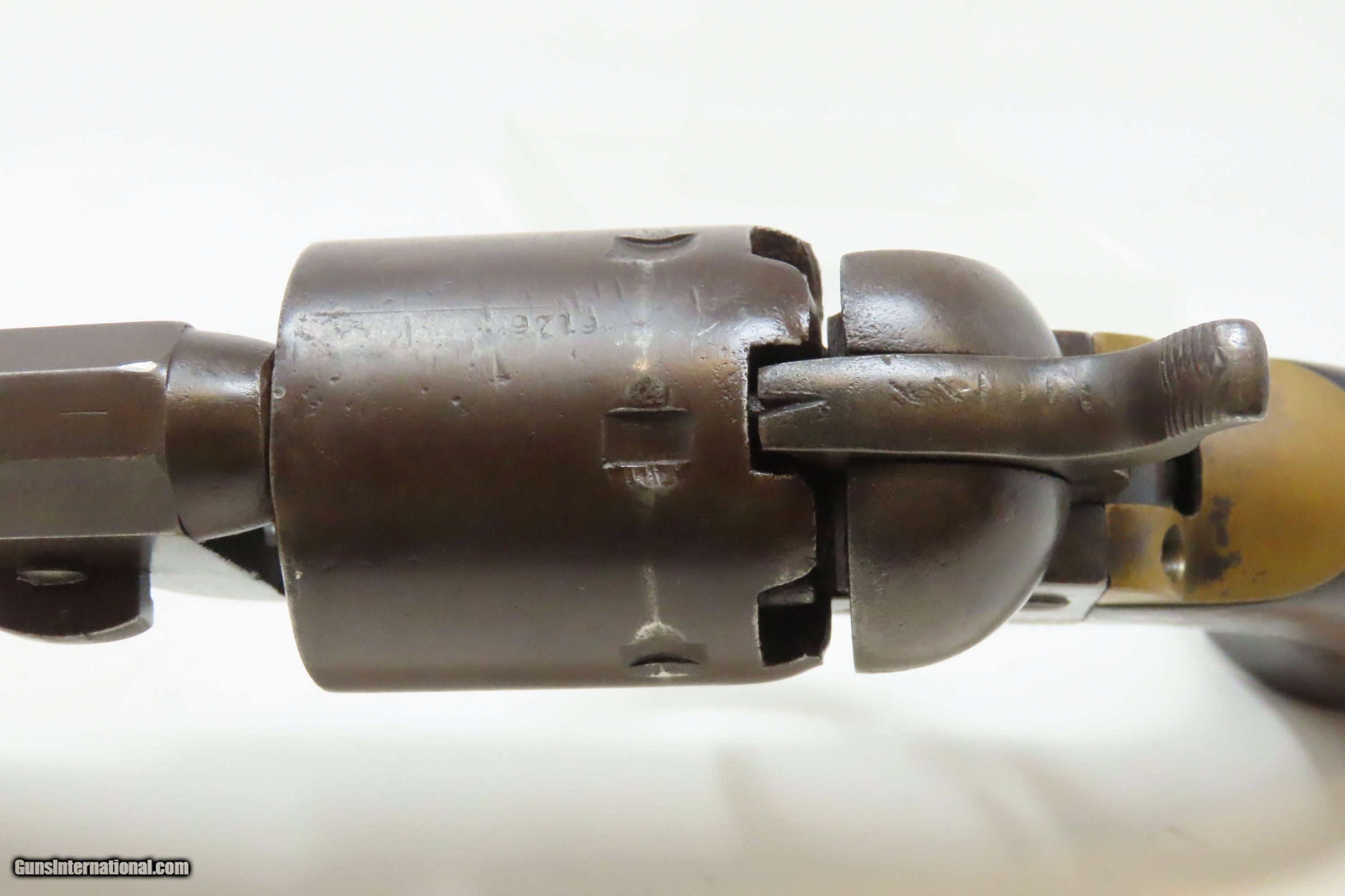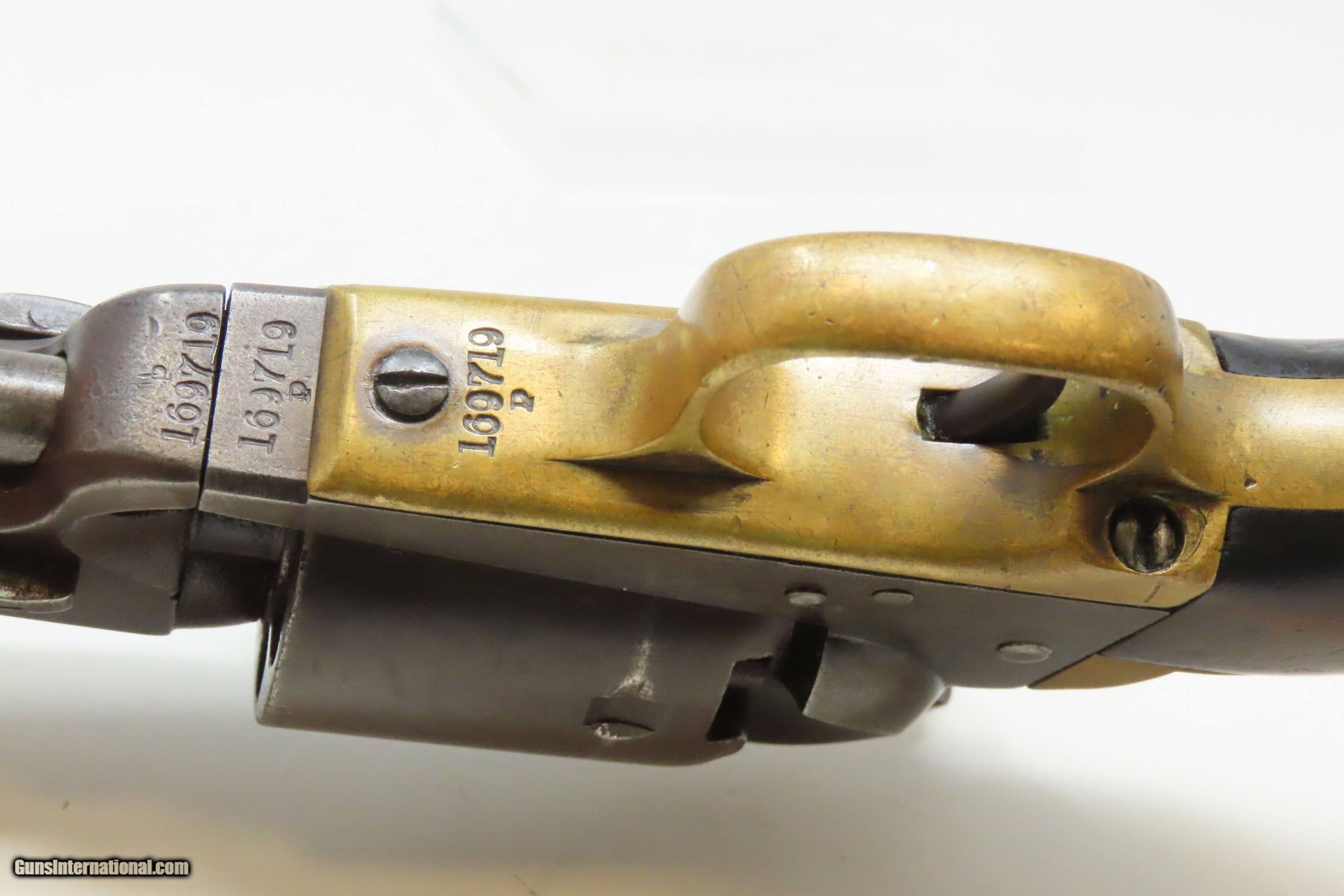 Description: 1863 mfr. CIVIL WAR Antique US NAVY COLT Model 1851 .36 Percussion Revolver With Inscription to Sailor Here we present an antique U.S. Navy Contract Colt Model 1851 Navy Revolver, made in the middle of the American Civil War in 1863 in Hartford, Connecticut. The 1851 Navy was one of Colt’s most famous and successful lines, reaching a production total of 257,348 from 1850 to 1873 (right up to the time of SAA production) from both Hartford and London factories. From Hartford alone, 185,000 were made by the end of the American Civil War. Many of these saw service during the conflict on both sides. There were some military purchases and lots of private purchases by soldiers going off to war. This is one of the “Navy” Navies—those acquired by the US (Union) government for wartime use during the American Civil War. An anchor and “U.S.N.” are on the butt, with “U.S.” stamped under the “COLT’S PATENT” marking on the side. In addition, this one has an inscription neatly engraved in thin script on the back of the brass grip frame which reads “2Nd. Asst. Eng. J.J. Sullivan U.S.N. N___ & W___”. The overall condition is good. This one wears an old refinish that has turned plum. The action is strong. The bore is dim with worn rifling. The grip is solid. Numbers match. Own the original! This is a legitimate antique and not a reproduction. Barrel is 7-1/2 inches. Caliber: .36 Percussion Overall condition as seen in photos. Very Fast. Very Safe. FREE SHIPPING WORLDWIDE. Delivered directly to your door by express mail! Guaranteed AUTHENTIC & Includes CERTIFICATE OF AUTHENTICITY. ancestryguns $3500 #244376 SOLD Antique: Yes |