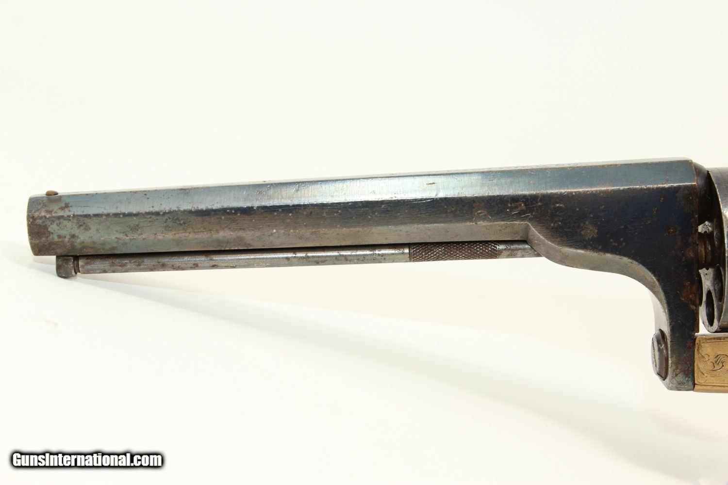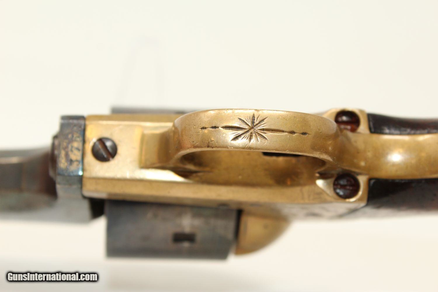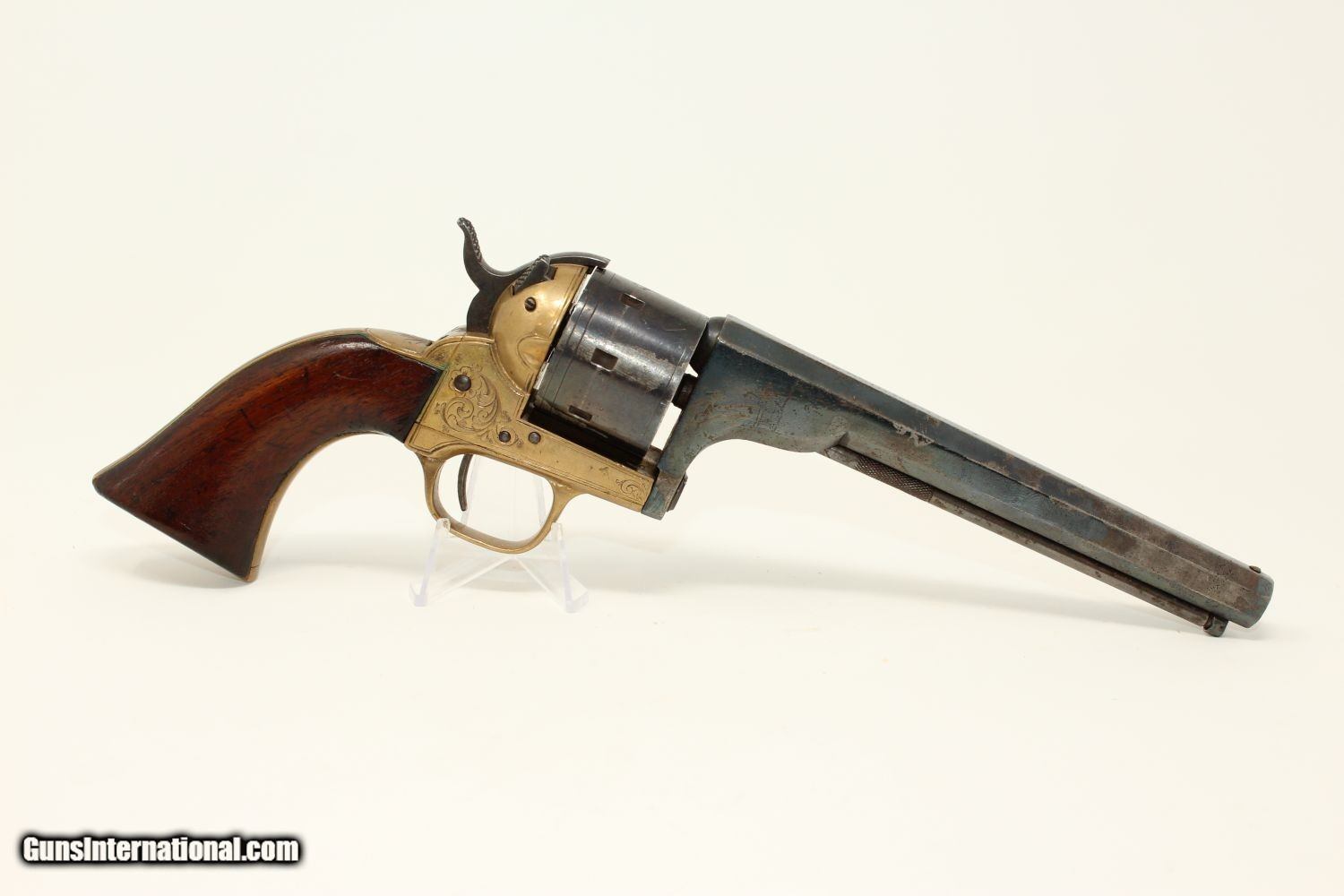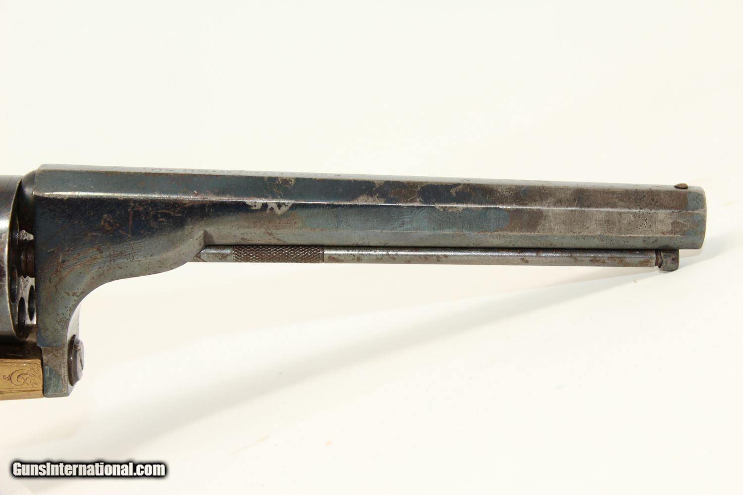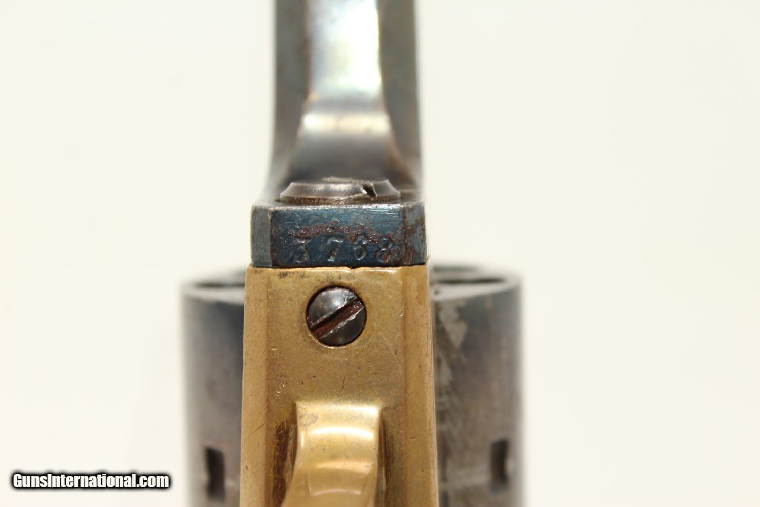 Description: 4CIVIL WAR Engraved MOORE’S PATENT Belt Revolver Scarce & Very Collectible Civil War Revolver Here we present an antique Engraved Moore’s Patent Firearms Co. Single Action Belt Revolver. These revolvers were made in Brooklyn, New York from 1861-1863 and number less than 8,000 in total. In this era, many companies infringed on the Rollin White patent. They were promptly sued. Others tried and succeeded in finding ways around the patent to make metallic cartridge revolvers while the Rollin White Patent was still in effect. Daniel Moore, the designer of this revolver was one who did both. He designed a cartridge revolver that was the first “swing-out” cylinder revolver, but blatantly infringed on S&W’s patent. He was sued and lost. The other significance of this pistol is that many of these are known to have been purchased by Union officers and enlisted men for use during the American Civil War. Mechanically, this revolver utilizes a push-button release that allows the barrel and cylinder to cant to the right for loading and unloading. The cylinder is chambered for 7 shots of .32 rimfire and is fully bored through, violating the Smith & Wesson owned Rollin White Patent. The pistol also features full factory engraving on the brass frame, which is quite handsome. This pistol is in nice condition! The overall condition is very good. The blue finish was re-done long ago and 85% remains. The markings are clear. The grips are in nice shape. The bore is in very good condition. The action is excellent. Own the original! This is a legitimate antique and not a reproduction. Barrel is 6 inches. Caliber: .32 Rimfire Overall condition as seen in photos. Very Fast. Very Safe. FREE SHIPPING WORLDWIDE. Delivered directly to your door by express mail! Guaranteed AUTHENTIC & Includes CERTIFICATE OF AUTHENTICITY. ancestryguns $1350 #190696 SOLD Antique: Yes |