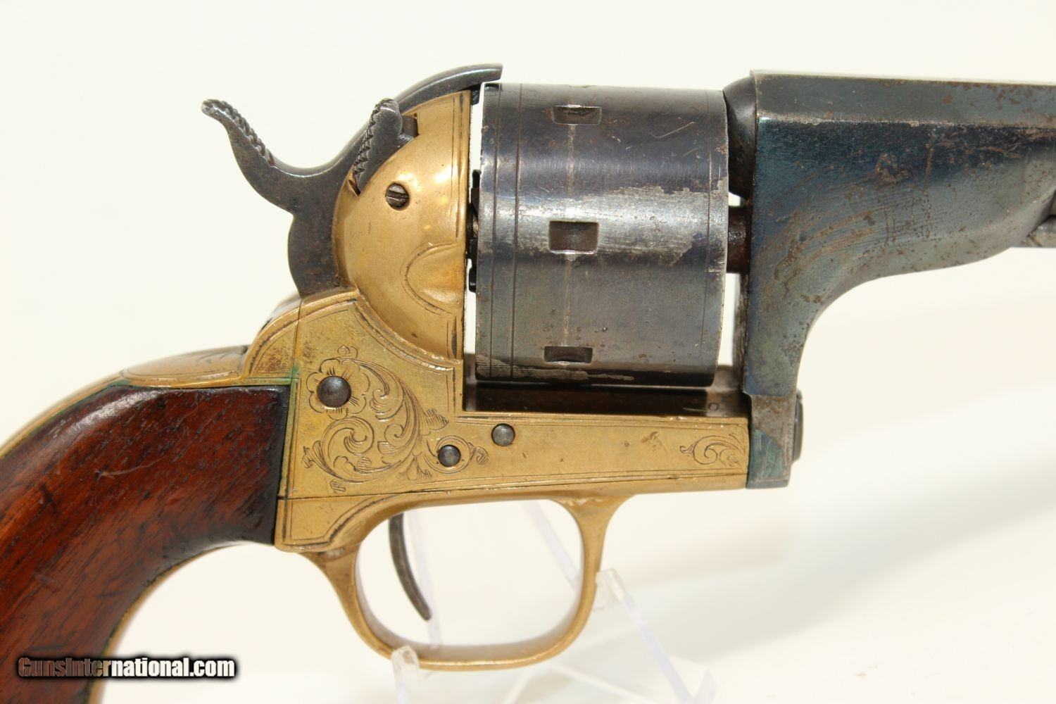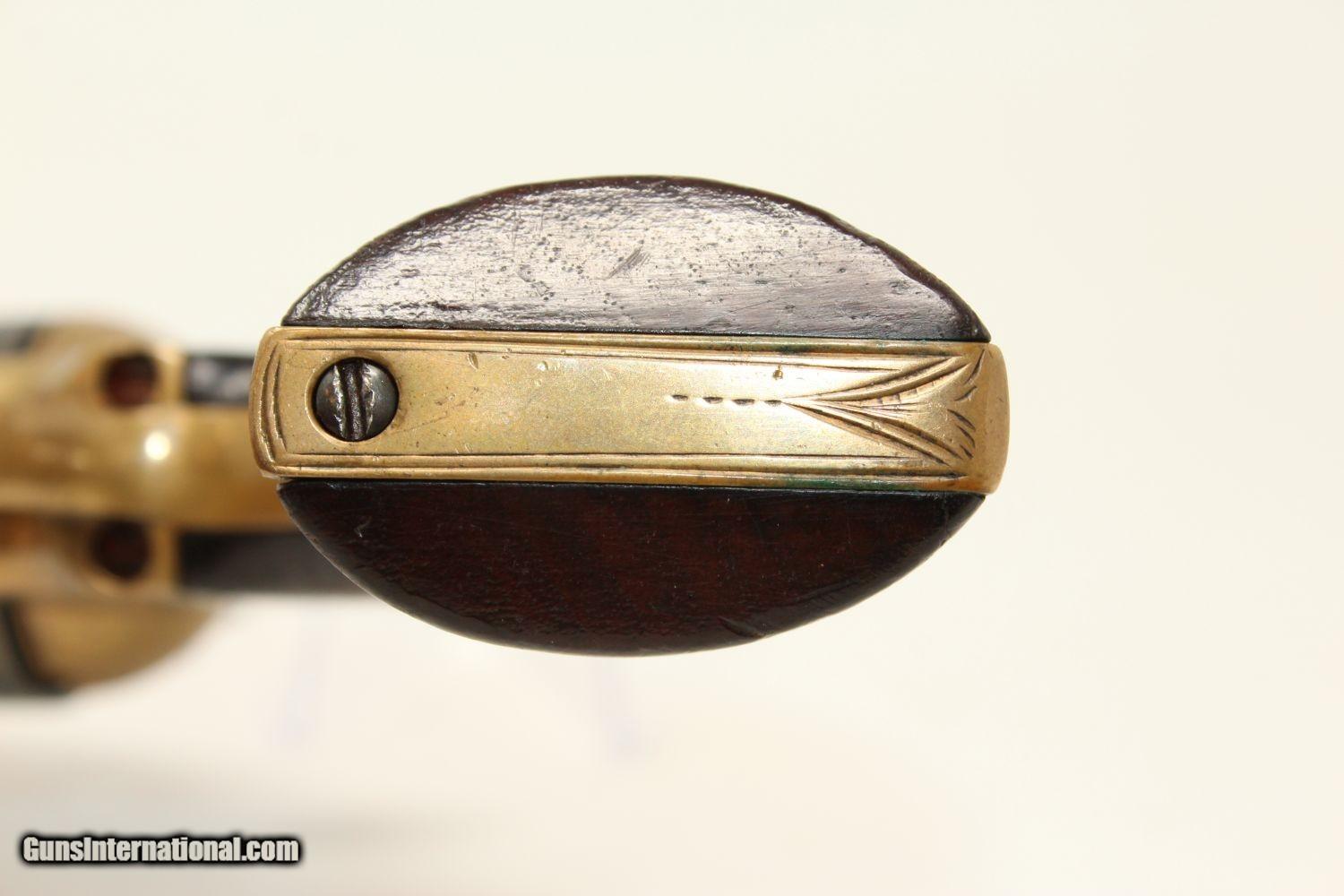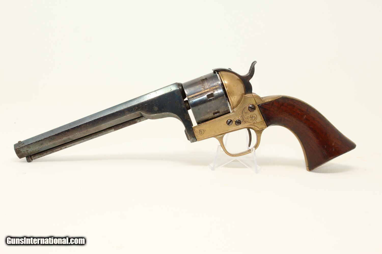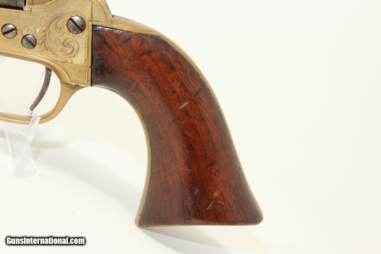 Description: 4CIVIL WAR Engraved MOORE’S PATENT Belt Revolver Scarce & Very Collectible Civil War Revolver Here we present an antique Engraved Moore’s Patent Firearms Co. Single Action Belt Revolver. These revolvers were made in Brooklyn, New York from 1861-1863 and number less than 8,000 in total. In this era, many companies infringed on the Rollin White patent. They were promptly sued. Others tried and succeeded in finding ways around the patent to make metallic cartridge revolvers while the Rollin White Patent was still in effect. Daniel Moore, the designer of this revolver was one who did both. He designed a cartridge revolver that was the first “swing-out” cylinder revolver, but blatantly infringed on S&W’s patent. He was sued and lost. The other significance of this pistol is that many of these are known to have been purchased by Union officers and enlisted men for use during the American Civil War. Mechanically, this revolver utilizes a push-button release that allows the barrel and cylinder to cant to the right for loading and unloading. The cylinder is chambered for 7 shots of .32 rimfire and is fully bored through, violating the Smith & Wesson owned Rollin White Patent. The pistol also features full factory engraving on the brass frame, which is quite handsome. This pistol is in nice condition! The overall condition is very good. The blue finish was re-done long ago and 85% remains. The markings are clear. The grips are in nice shape. The bore is in very good condition. The action is excellent. Own the original! This is a legitimate antique and not a reproduction. Barrel is 6 inches. Caliber: .32 Rimfire Overall condition as seen in photos. Very Fast. Very Safe. FREE SHIPPING WORLDWIDE. Delivered directly to your door by express mail! Guaranteed AUTHENTIC & Includes CERTIFICATE OF AUTHENTICITY. ancestryguns $1350 #190696 SOLD Antique: Yes |