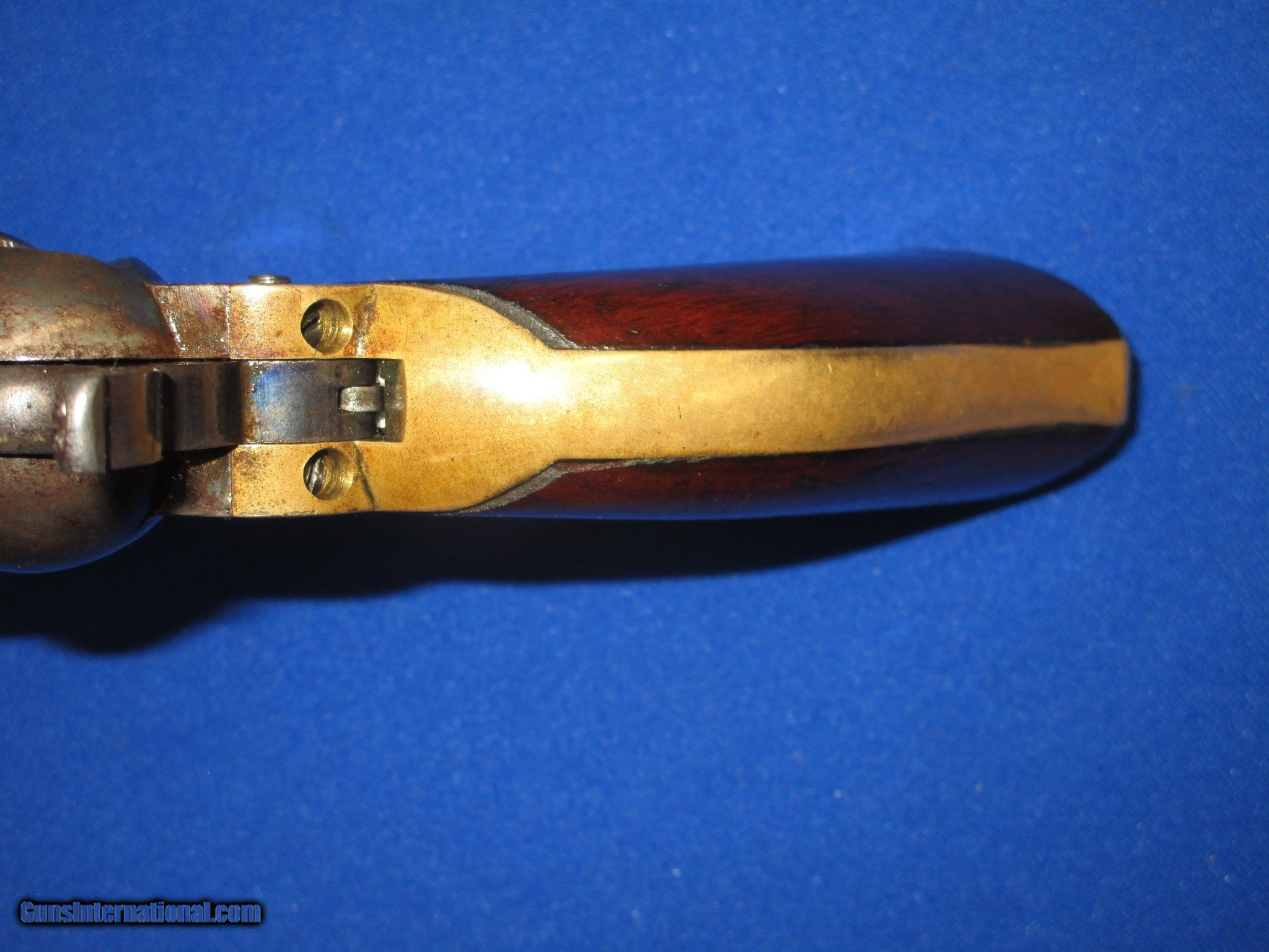 Description: A CIVIL WAR COLT MODEL 1862 PERCUSSION POLICE REVOLVER WITH A 6 1/2 INCH BARREL IN EXCELLENT UNTOUCHED CONDITION. SERIAL #29,360 WITH ALL MATCHING NUMBERS. MADE IN 1865, ALL ORIGINAL AND COMPLETE. THE REVOLVER HAS EXCELLENT METAL, MARKINGS, AND EDGES. IT HAS A NEW YORK BARREL ADDRESS. THE BARREL & FLUTTED CYLINDER ON THE GUN RETAIN MOST OF THEIR ORIGINAL BLUE SHOWING NATURAL LIGHT WEAR. THE FRAME AND HAMMER HAVE THINNING CASE COLORS THROUGHOUT. THE LOADING LEVER STILL HAS VIVID COLORS ON IT. ALL SCREWS ARE FINE WITH ORIGINAL BLUE. THE BRASS BACKSTRAP AND TRIGGER GUARD HAVE A FINE LOOK & MELLOW COLOR TO THEM. THE ORIGINAL GRIPS ARE NUMBERED TO THE GUN AND ARE FINE THROUGHOUT. THEY RETAIN THEIR ORIGINAL FACTORY OIL VARNISH ON THEM. THE REVOLVER HAS A FINE ACTION AND BORE. THIS IS AN EXCELLENT LOOKING EXAMPLE OF A COLT MODEL 1862 PERCUSSION POLICE REVOLVER WITH A 6 1/2 INCH BARREL THAT IS DEFINITELY FINE ENOUGH TO CASE! SOLD Antique: Yes Manufacturer: COLT Model: 1862 POLICE Serial Number: 29,360 Condition: EXCELLENT Metal Condition: EXCELLENT Wood Condition: EXCELLENT Bore Condition: FINE |