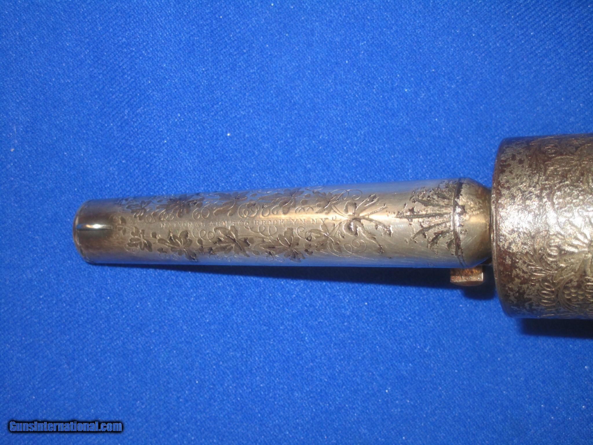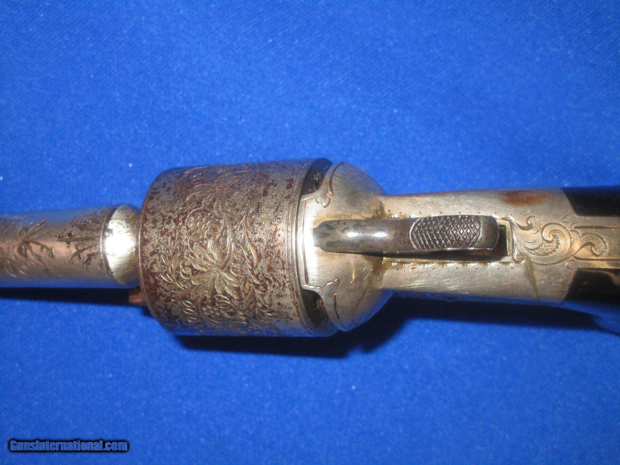 Description: A CIVIL WAR DELUXE FACTORY ENGRAVED & FACTORY SILVERED MOORE'S PATENT FIREARMS CO. FRONT LOADING TEAT-FIRE BLACK POWDER REVOLVER IN FINE PLUS UNTOUCHED CONDITION. SERIAL # 22,350, ALL MATCHING NUMBERS. ALL ORIGINAL & COMPLETE. THE REVOLVER HAS FINE METAL, MARKINGS, & DELUXE FACTORY ENGRAVING. IT IS MARKED "NATIONAL ARMS CO. BROOKLYN, N.Y." ON THE TOP OF THE BARREL IN A PANEL IN THE CENTER OF THE ENGRAVING. THE DELUXE DEEP FACTORY ENGRAVING IS ON THE BARREL, CYLINDER, FRAME, AND BACKSTRAP. IT HAS EXTRA COVERAGE THROUGHOUT. THE FACTORY SILVER IS EXCELLENT & UNTOUCHED THROUGHOUT WITH SOME LOSS ON THE HEAVILY ENGRAVED CYLINDER. THE GRIPS ARE FINE THROUGHOUT. IT HAS A FINE ACTION AND BORE. THIS IS A HIGH CONDITION DELUXE ENGRAVED CIVIL WAR MOORE'S PATENT FIREARMS CO. FRONT LOADING TEAT-FIRE REVOLVER THAT WOULD BE A FINE ADDITION TO ANY COLLECTION! SOLD Antique: Yes Manufacturer: MOORE, NATIONAL ARMS CO. Model: TEAT FIRE Serial Number: 22,350 Condition: FINE PLUS Metal Condition: FINE Wood Condition: FINE Bore Condition: FINE |