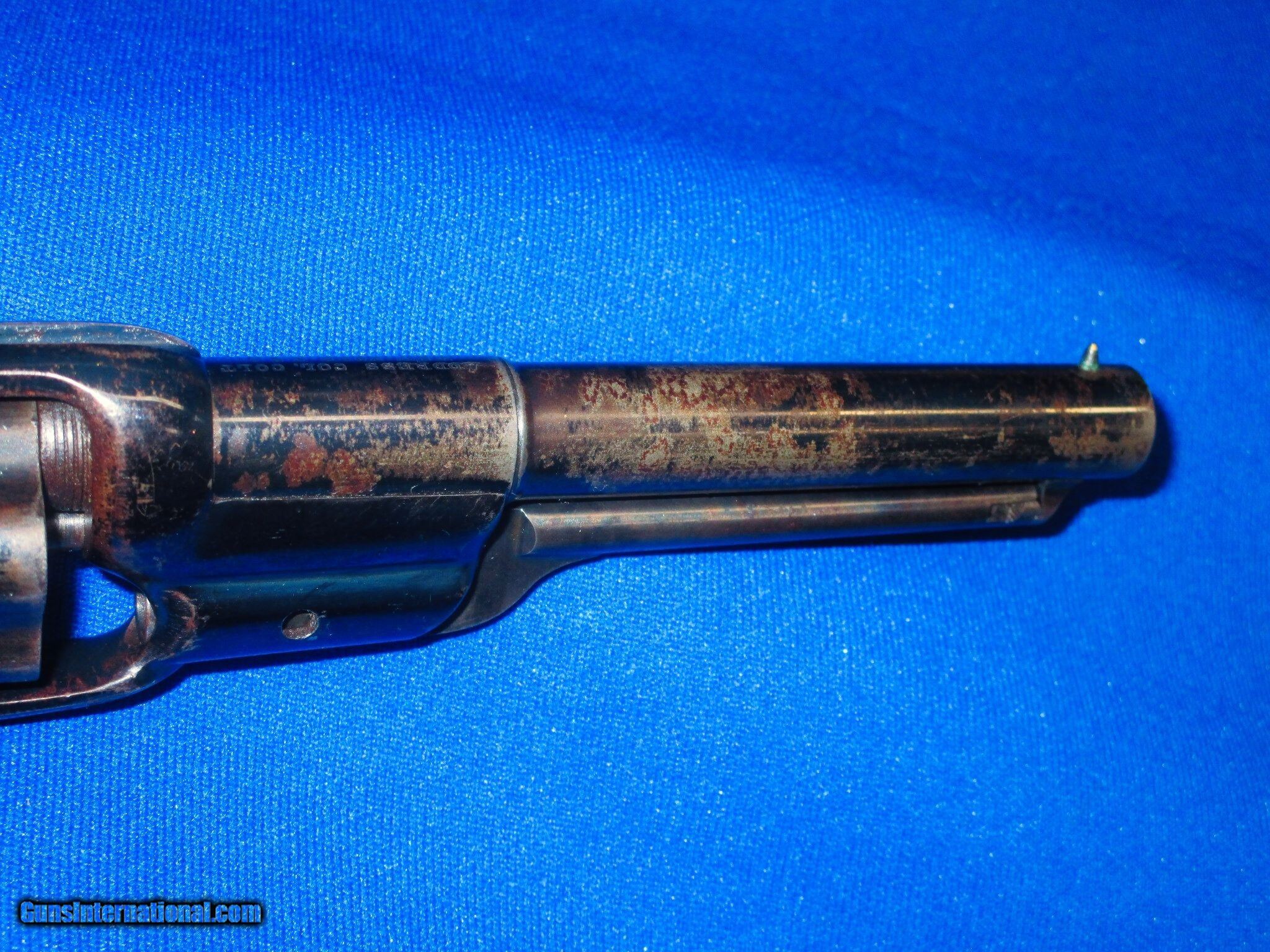 Description: A Very Desirable Civil War Percussion Colt Model 1855 #5A Root Revolver In Fine Plus Untouched Condition. Serial #2908, with all matching numbers. All original and complete. Made in early 1861 and in .31 caliber. It has the flutted cylinder and the longer 4 1/2 inch barrel on it. The revolver has fine plus metal, markings and edges. It has a New York address on it. The barrel retains a mix of original factory blue mixing with a natural plum patina. The frame, flutted cylinder, and backstrap retain most of their original factory blue with only a couple of small areas thinning to a plum color. The loading lever and hammer both retain most of their darkening case colors on them. All screws are excellent with their original blue. The original factory grips are excellent plus and retain their original factory varnish on them.The revolver has a fine bore and action. These Colt Root Revolvers Were often Carried By Officers And Soldiers During The Civil War. This Is A Very Fine Untouched Example Of An Early Civil War Percussion Colt Model 1855 #5A Root Revolver With A 4 1/2 Inch Barrel! DISCLAIMER: All firearms are sold as collector’s items only – we did not accept responsibility as to the shooting safety or reliability of any antique firearm. All firearms as described as accurately as possible, given the restraints of a catalog listing length. We want satisfied customers and often under describe the weapons. Any city or state regulations regarding owning antique firearms are the responsibility of the purchaser. All firearms are mechanically perfect unless noted, but again are NOT warranted as safe to fire. We do not sell or ship any Antique Guns or Antique Ammo to anywhere in New York State. SOLD Antique: Yes Handgun Caliber: .31 Manufacturer: Colt Model: Model 1855 #5 Serial Number: 2908 Condition: Fine Plus Untouched Condition Metal Condition: Fine Plus Untouched Condition Wood Condition: Fine Plus Untouched Condition Action: Single Manufacture Date: 1861 |