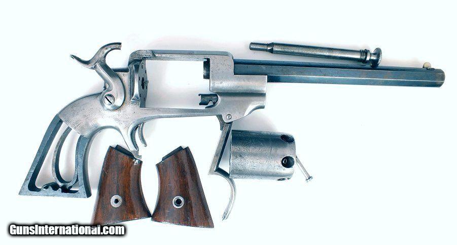 Description: Allen and Wheelock made these side-hammer pistols in limited quantities between 1858 and 1861, with fewer than 750 of each variation made. This one is the NAVY .36 caliber with a 7 1/2-inch barrel. The metal is a smooth gray on the frame, but with original blue on the barrel. All matching serial number 438 throughout ... The cylinder scene of animals in a forest is completely visible, so there is very little wear to the metal. The front sight is in place and the action is good. The loading-rammer assembly, with its characteristic catch on the rear of the trigger guard functions fine. The nipples and the grips are very good with most of the original finish.... These are nice pistols with a hint of that overly-clever Victorian age engineering that we love. A classic Allen & Wheelock in tight solid condition made in the middle of the Civil War. 100% original, 100% complete, mechanically perfect. SOLD Antique: Yes |