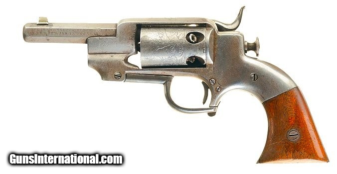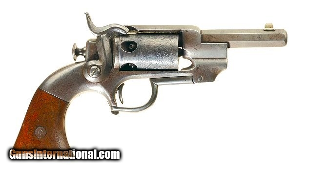 Description: This is an example of ALLEN & WHEELOCKS Standard Model "Sidehammer Pocket Revolver", .28 caliber Percussion pocket revolver. The barrel is 2 7/8"... Good markings on the left barrel flat.. Stamped with the two line address/patent dates (ending in 1857) ... It has the Standard Model "loading lever catch" located at the back of the trigger guard. The cylinder has the Forest Scene Engraving. Smooth walnut grips with the right panel numbered to the gun. And the best part is this little pocket revolver it's Clean, Complete and Original. . The percussion nipples are dark and one is flat. The grips are very good with a little of the varnish remaining and some scattered minor handling marks. Mechanically fine. $960. OBO SOLD Curio/Relic: Yes |