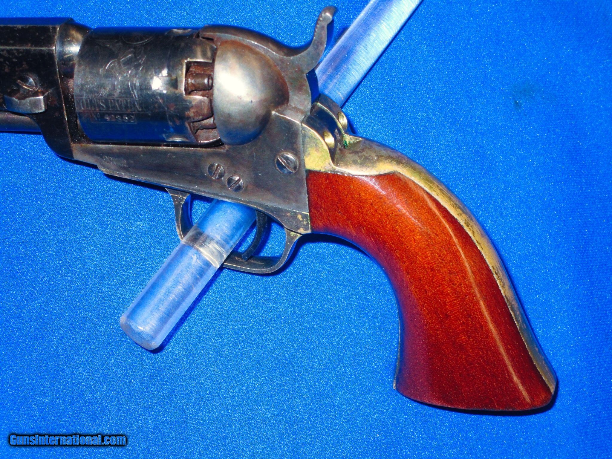 Description: An Early Civil War Colt Model 1849 Percussion Pocket Revolver With A Four Inch Barrel In Excellent Plus Condition. Serial #242,352, all matching numbers including the wedge. Made in1863. The revolver has excellent metal, markings, and edges. It has an excellent and full cylinder scene. The barrel and cylinder on the gun both retain most of their original bright factory blue with only a couple of very small spots fading to a plum patina. The frame, loading lever, and hammer all retain excellent plus bright factory case colors throughout. All screws are excellent with bright original blue on them. The brass back strap and trigger guard are fine and untouched throughout with some silver still remaining in spots. The original grips are excellent plus and retain all of their original factory varnish on them. The revolver has an excellent action and bore. This Is A Very High Condition And All Original Civil War Colt Model 1849 Percussion Police Revolver Made In 1863! DISCLAIMER: All firearms are sold as collector’s items only – we did not accept responsibility as to the shooting safety or reliability of any antique firearm. All firearms as described as accurately as possible, given the restraints of a catalog listing length. We want satisfied customers and often under describe the weapons. Any city or state regulations regarding owning antique firearms are the responsibility of the purchaser. All firearms are mechanically perfect unless noted, but again are NOT warranted as safe to fire. SOLD Antique: Yes Manufacturer: Colt Model: Model 1849 Pocket Serial Number: 242352 Barrel Length: 4 Condition: Excellent Plus Metal Condition: Excellent Wood Condition: Excellent Bore Condition: Excellent Action: Single |