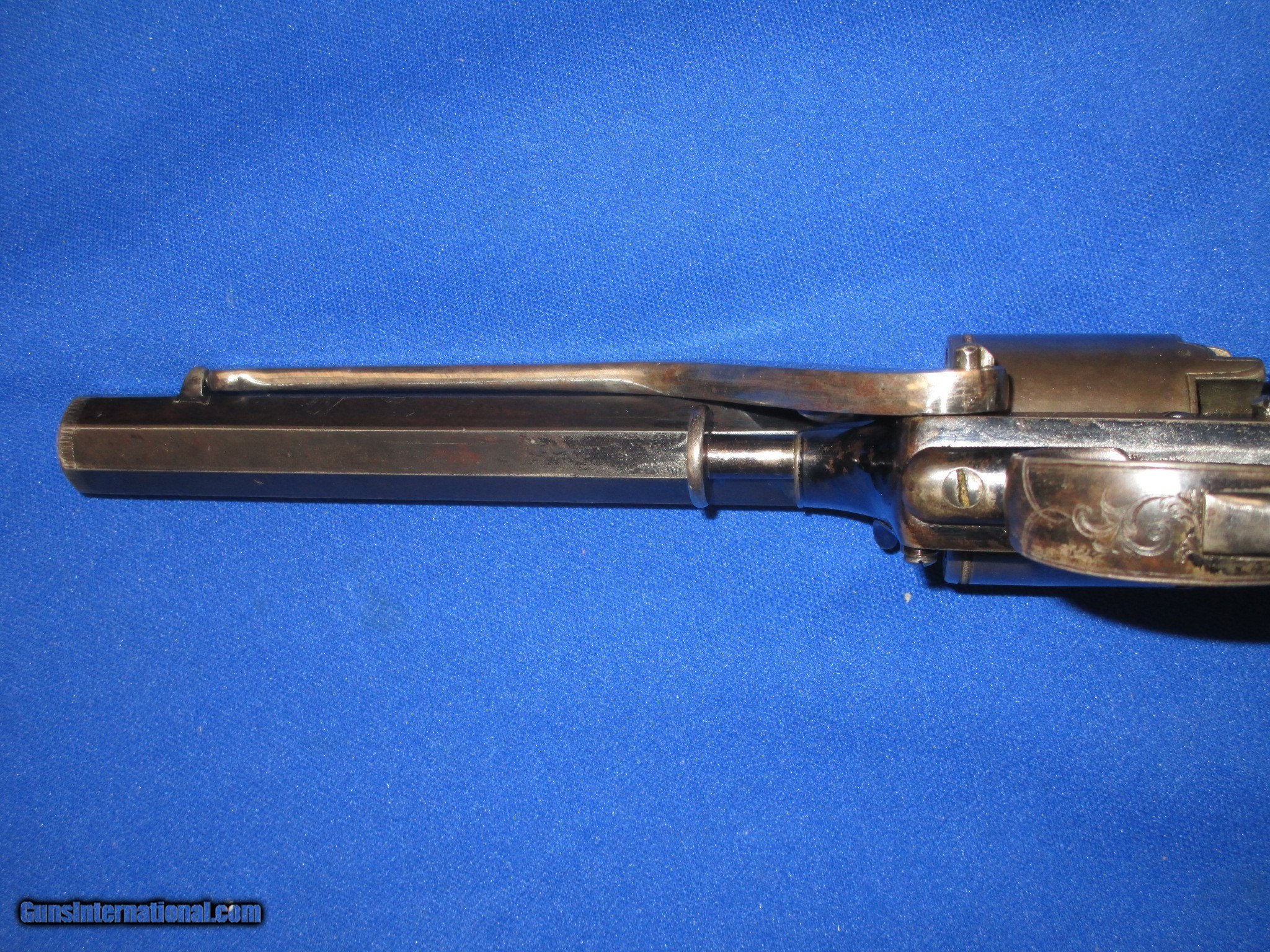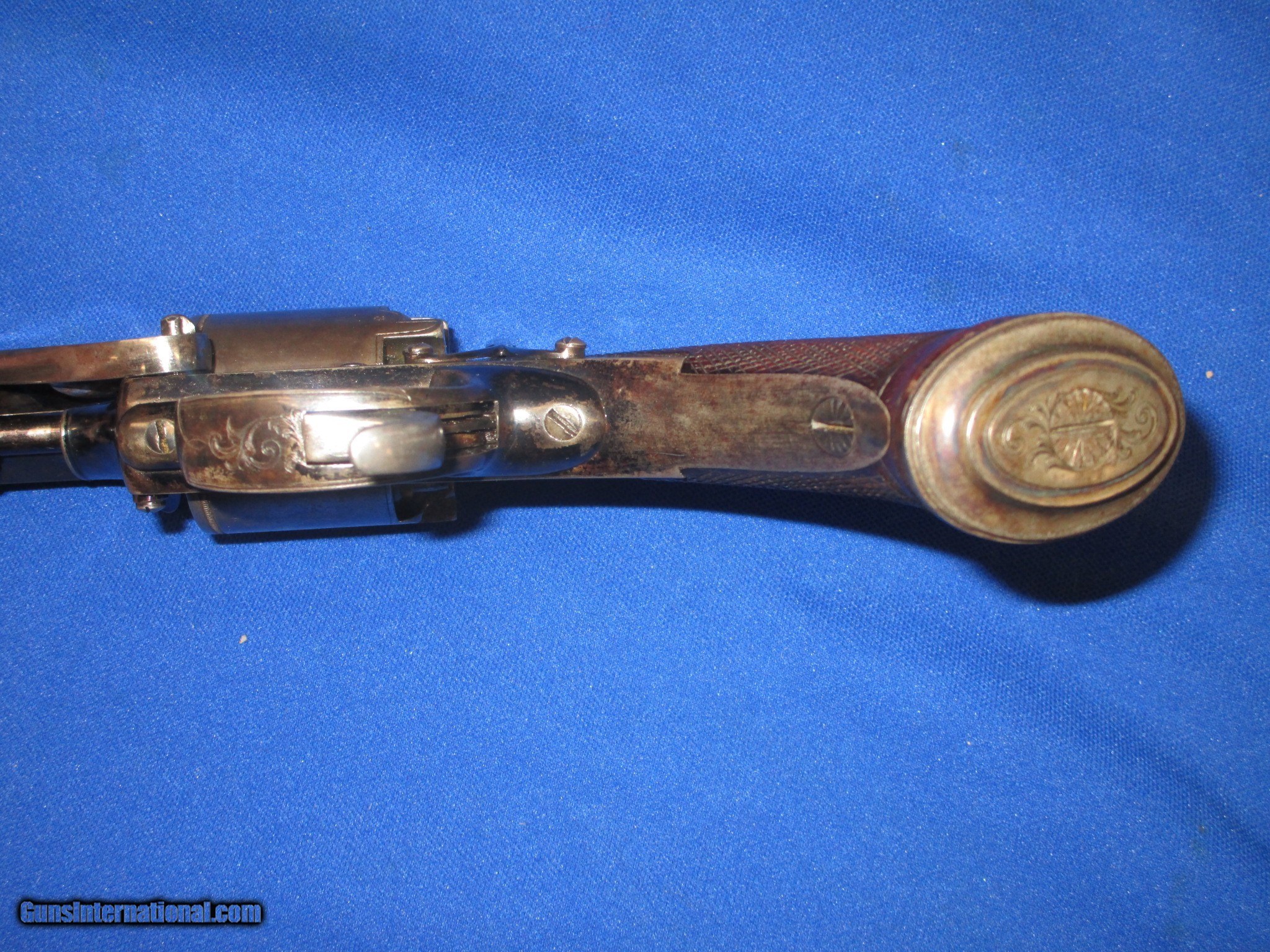 Description: An Early Civil War Tranter's Patent Second Model Percussion Revolver In Its Original Case With Accessories All In Excellent Untouched Condition. Serial #4,424, made in the early to mid 1850's. All original and complete. The caliber is .54 bore. The revolver has excellent metal, markings, and edges. The factory engraving on it is also excellent. The barrel, frame, backstrap, and trigger guard all retain their original factory blue. The cylinder retains its darkening case colors throughout it. The loading lever and hammer both retain their original factory polish on them. The original fine checkered grips are excellent throughout. The revolver has an excellent bore and action. The original case is nice throughout showing light wear. All accessories are excellent as shown. This Is An Early And Excellent Example Of A Civil War Second Model Tranters Percussion Revolver In Its Original Case With Accessories. Many Of These Revolvers Were Used By Southern Officers During The Civil War! SOLD Antique: Yes Manufacturer: TRANTERS Model: 2ND MODEL Serial Number: 4,424 Condition: EXCELLENT Metal Condition: EXCELLENT Wood Condition: EXCELLENT Bore Condition: EXCELLECT Action: FINE |